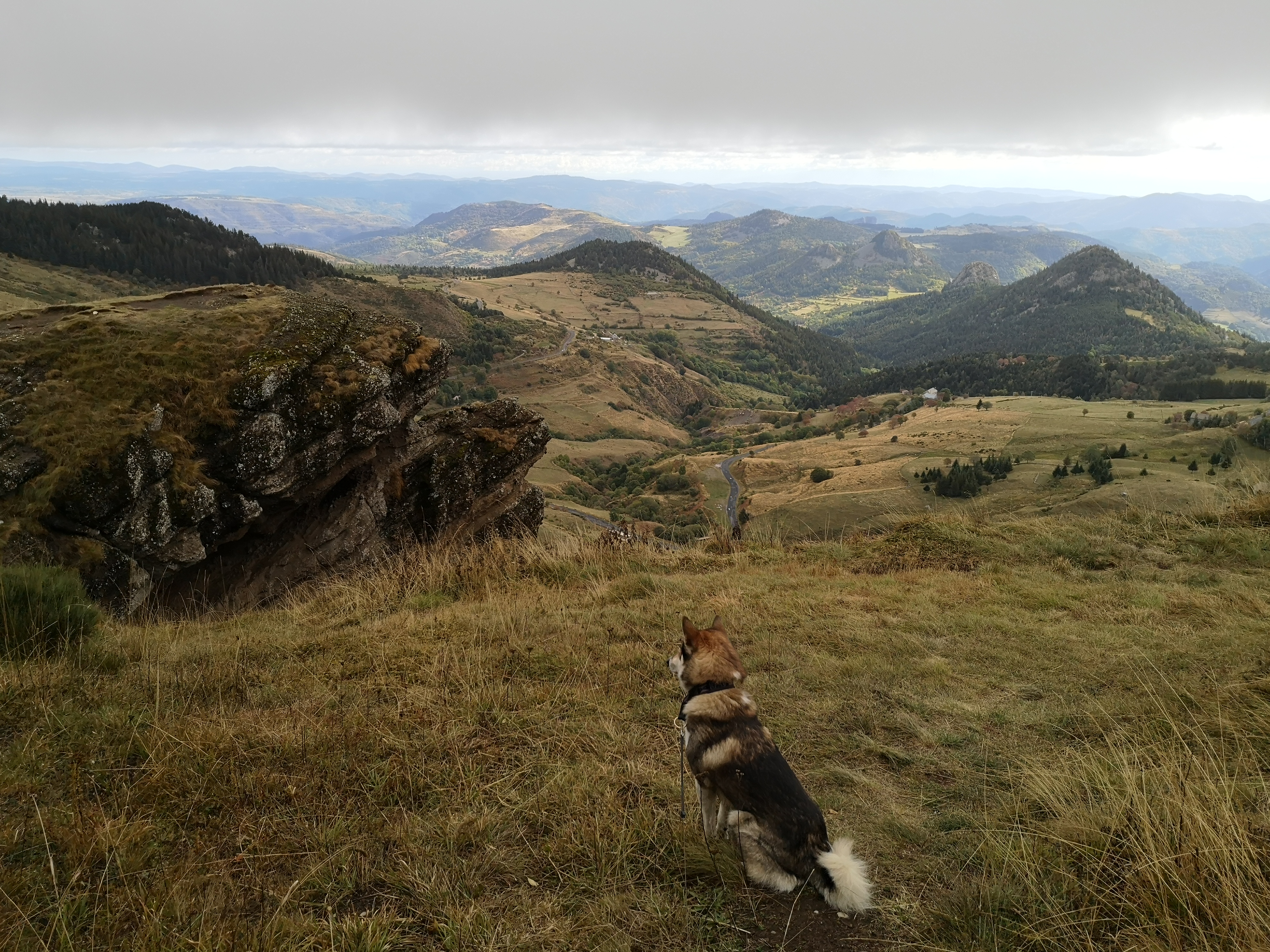 Ik sta te koken op mijn gasstelletje in de bus op ruim 1500 meter hoogte op een parkeerplaats op Le Col de la Croix de Boutieres, met een fenomenaal uitzicht. Tientallen bergtoppen, deels begroeid met bossen, afgewisseld met groene graslanden en grillige rotsformaties.