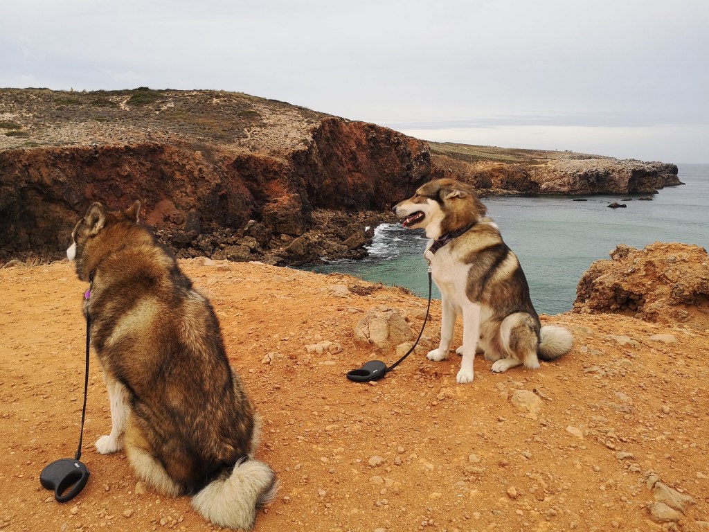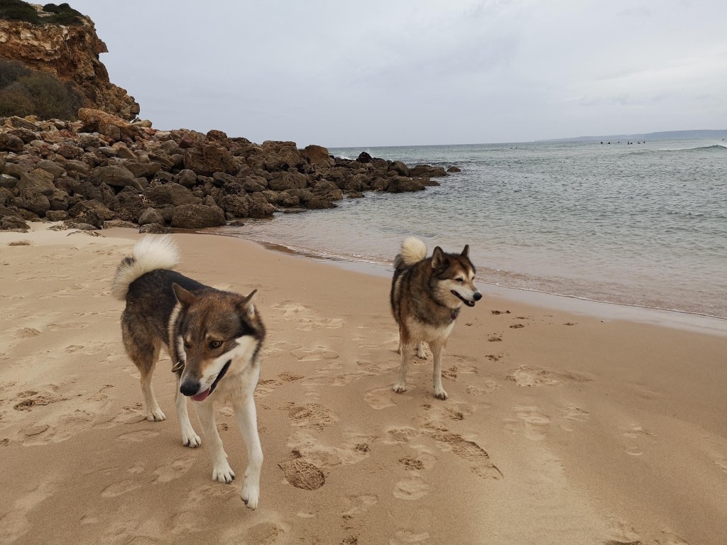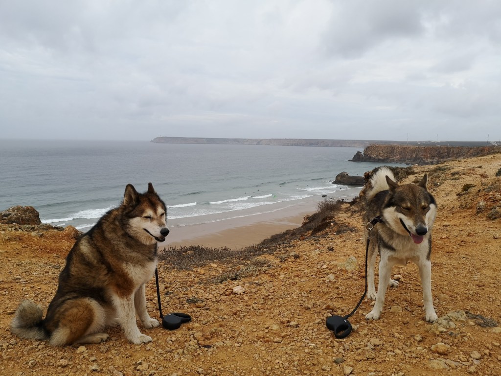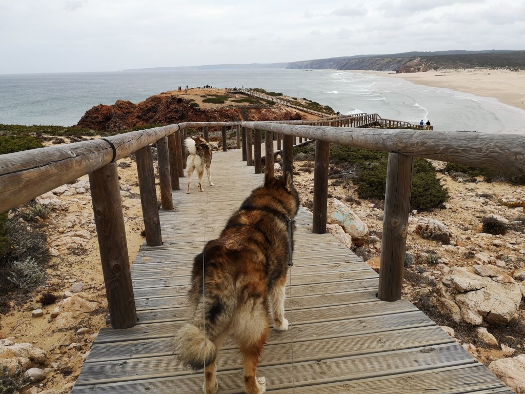 Ik laat Marte en Mika van de riem, en zij rennen over een breed stuk strand. Tussen de rotsen stroomt een beek richting de zee, welke een soort lagune vormt tussen de rotsachtige kust en het zachte zand. Over houten planken en bruggetjes lopen we aan de zuidkant van het strand da Bordeira naar een uitkijkpunt op de klif toe. Het diepe emarald blauw van de oceaan tekent zich af tegen de witgrijze bewolking. In de verte zien we surfers als kleine zwarte stipjes op en neer deinen in de golven van de zee.