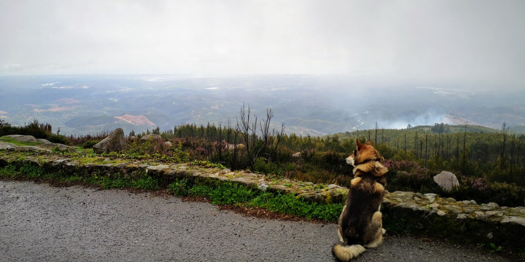 Voor het eerst sinds twee maanden pak ik mijn bergschoenen om aan te trekken. Marte en Mika staan al te popelen bij de schuifdeur. Ze springen uit de bus en kijken een mistig dal in. We maken een wandeling van een klein uurtje. Er waait een kille wind. Ik heb mijn dikke fleece trui met daarover mijn windjack aan, en ik heb mijn wollen muts op. Soms trekt de mist even op en kijken we uit over het westelijke deel van de Algarve. Men zegt dat op zonnige dagen de Atlantische Oceaan vanaf de Monchique bergen te zien is.
