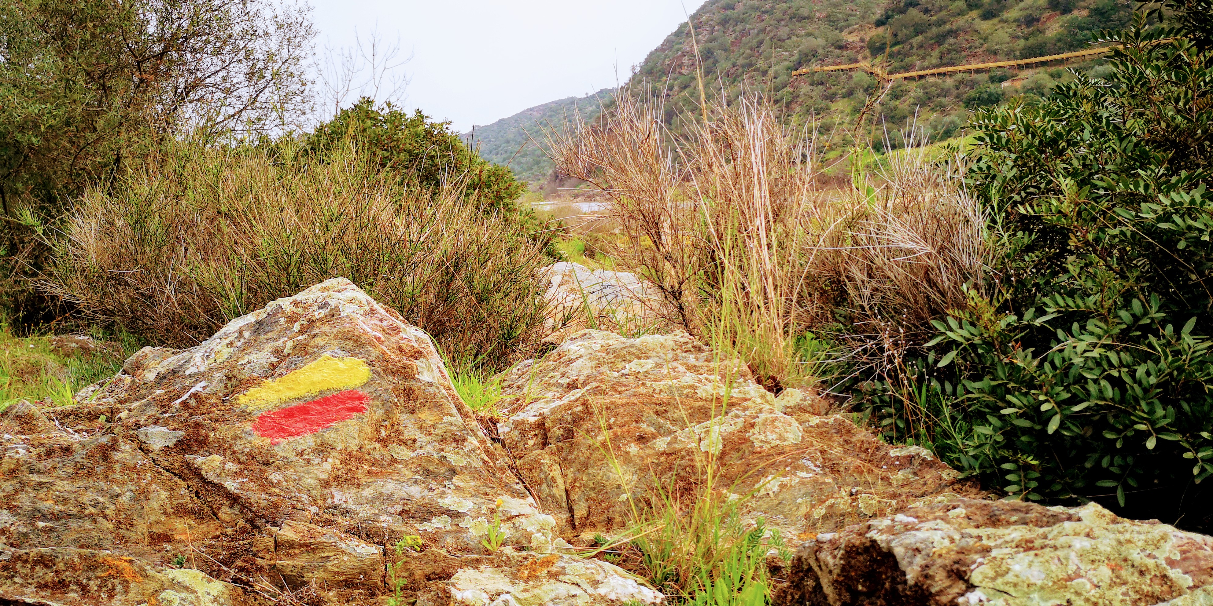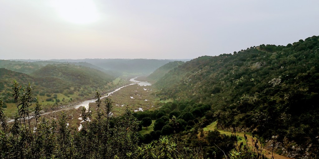 Mika en ik volgen een klein pad over grote bemoste stenen, dode takken en bloemrijke oevers van de rivier Guadiana. Beide zijden van het water worden omringd door met mediterrane vegetatie bedekte heuvels en uitgestrekte laagvlaktes, die lopen van Corte Gafo tot aan het gebergte Serra de Serpa.