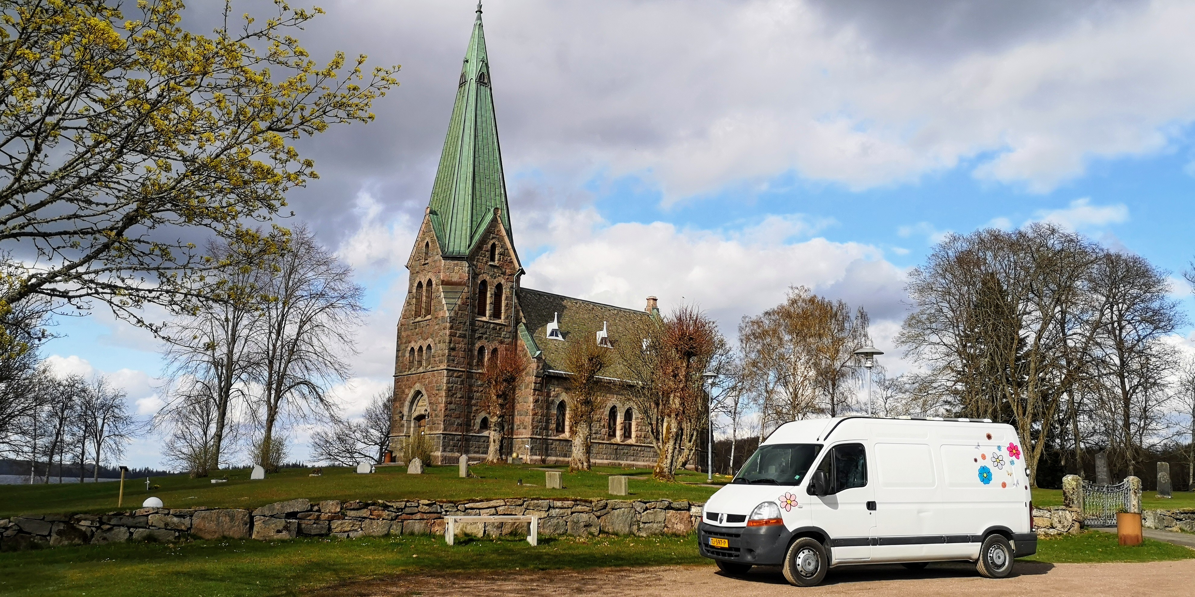 Vanuit de bus kijken we op het kerkje dat in Neogotische stijl is gebouwd, met muren van uitgehouwen graniet en dikomlijste puntige bogen om de ramen en massieve houten deur. Rondom het kerkje staan oude verweerde grafstenen onder knoestige bomen.