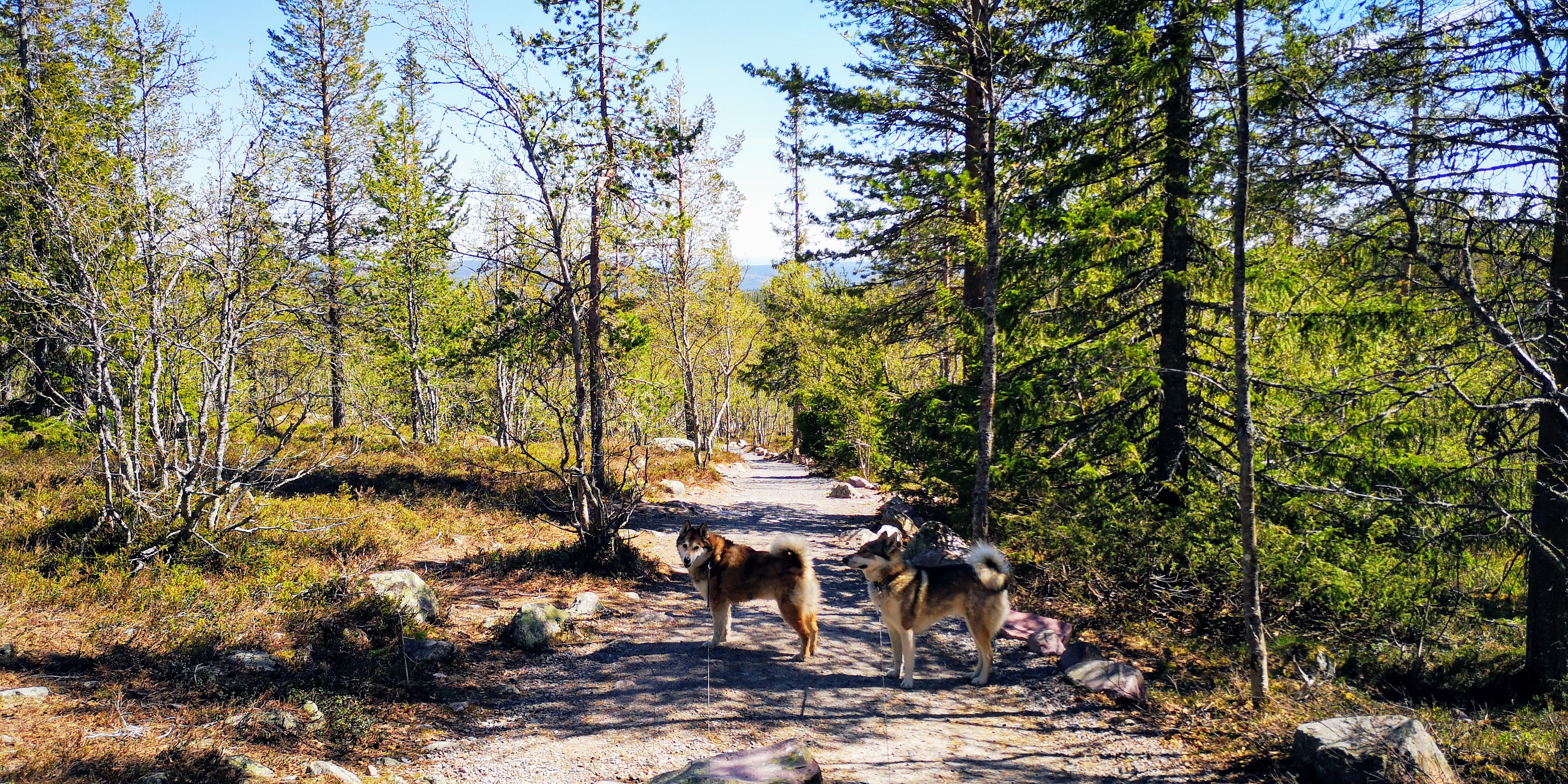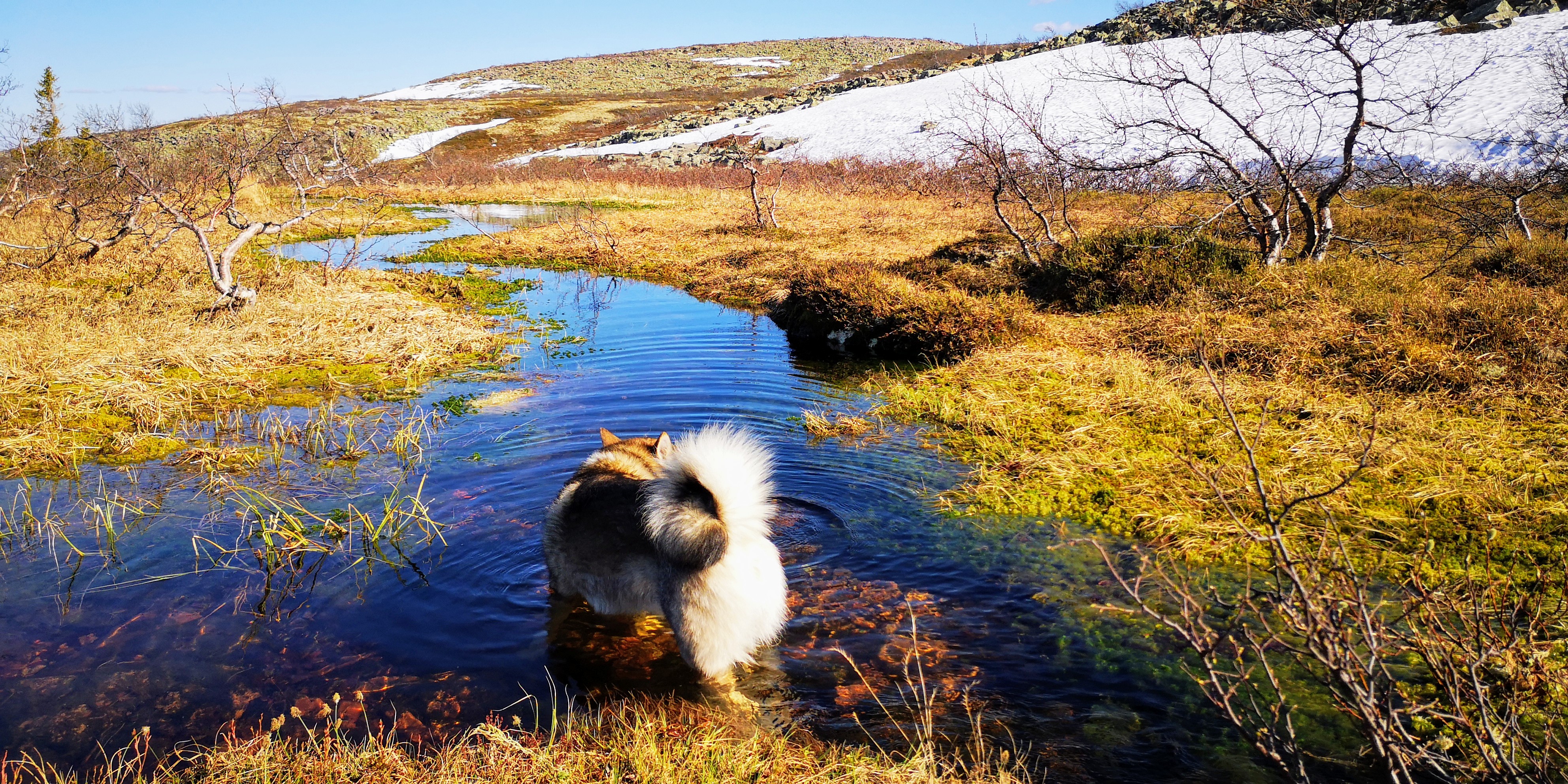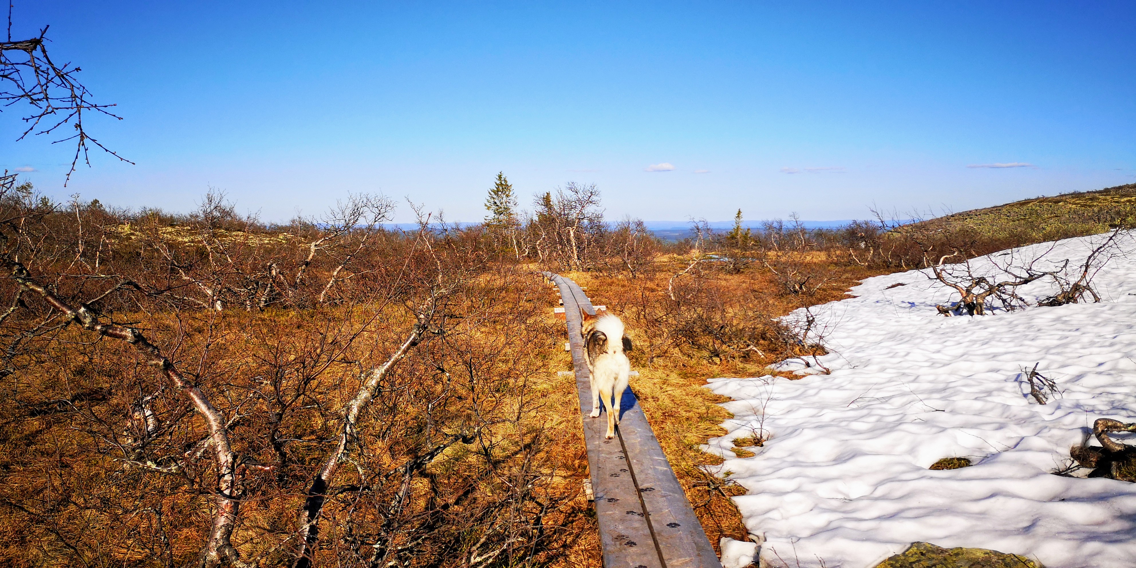 We lopen over aangelegde houten planken en bruggetjes, en zien kleurrijke korstmossen en helderblauwe meren om ons heen. Daartussen groeien kleine gekromde berkenboompjes, vaak bestaande uit meerdere kleine stammetjes die niet langer dan anderhalve meter hoog zijn. Overal liggen nog grote dotten sneeuw, ondanks dat we maar op achthonderd meter hoogte zitten en het rond de twintig graden boven nul is. De grond moet hier nog wel heel koud zijn.