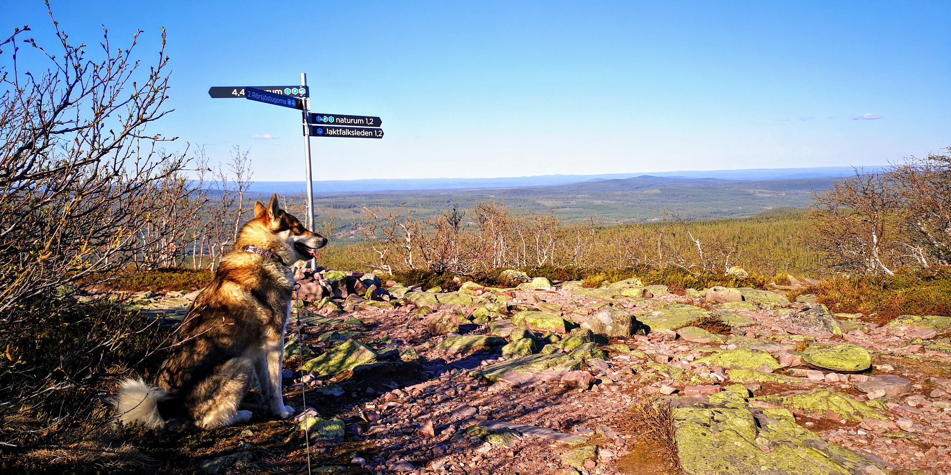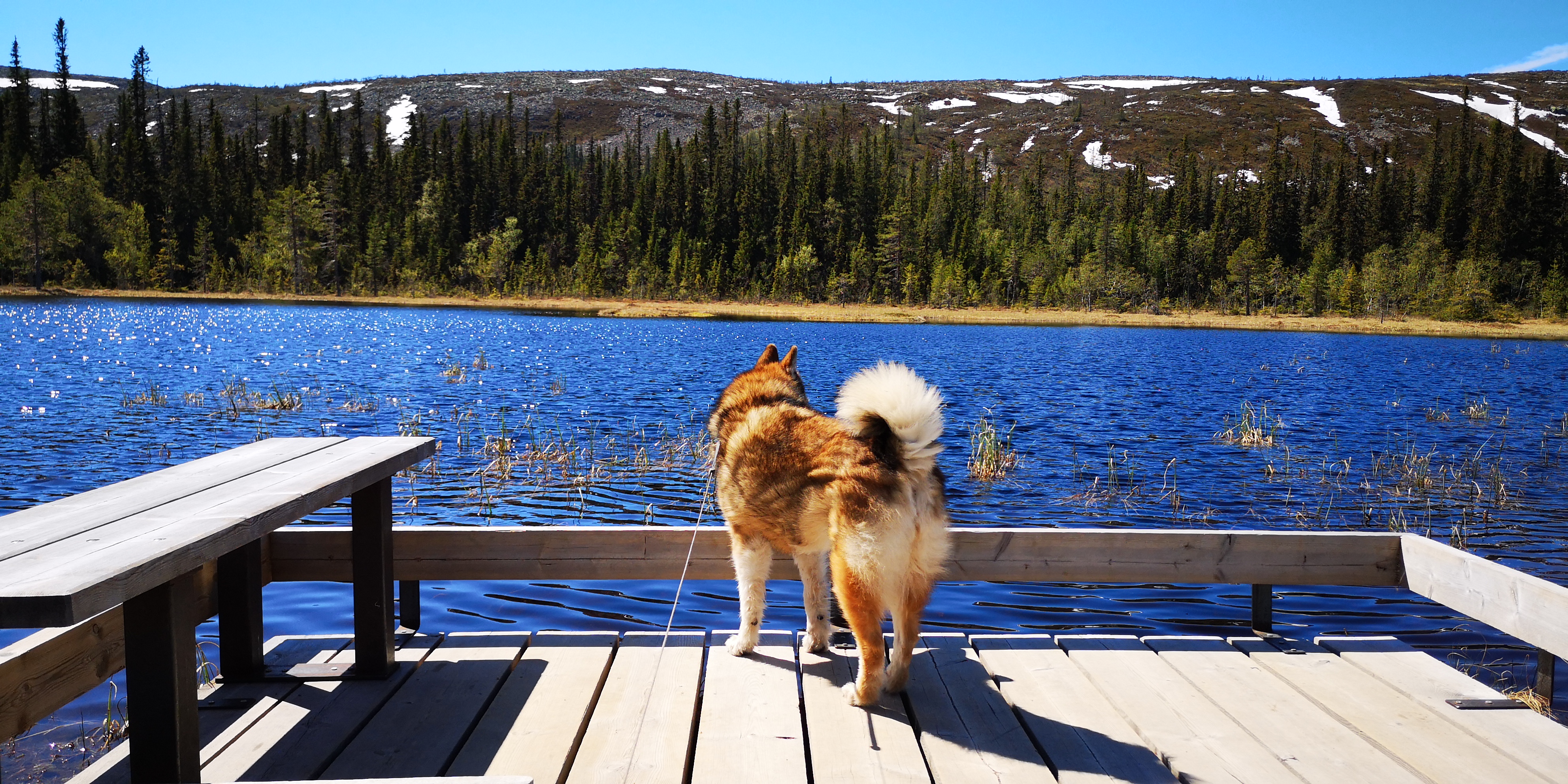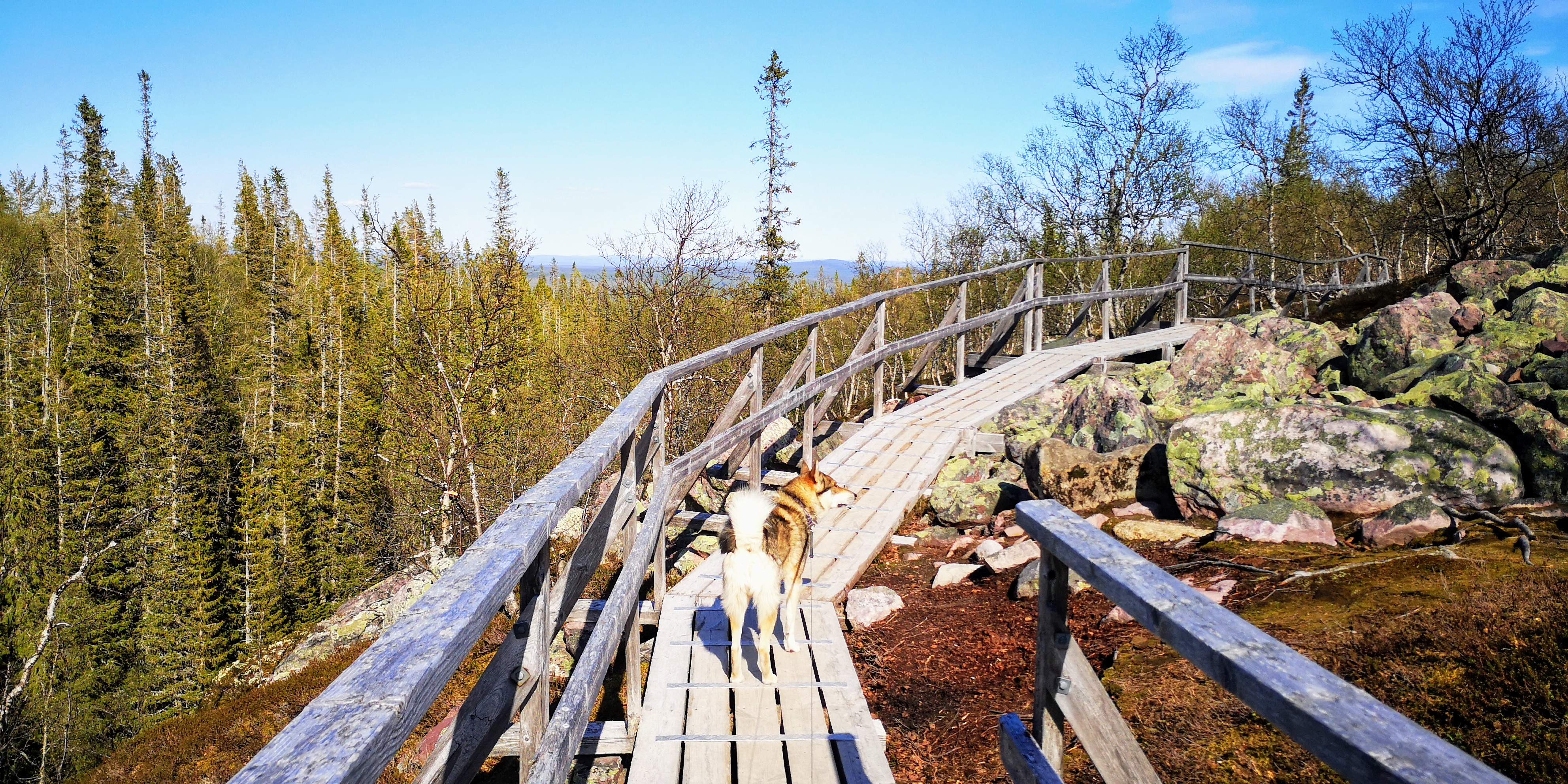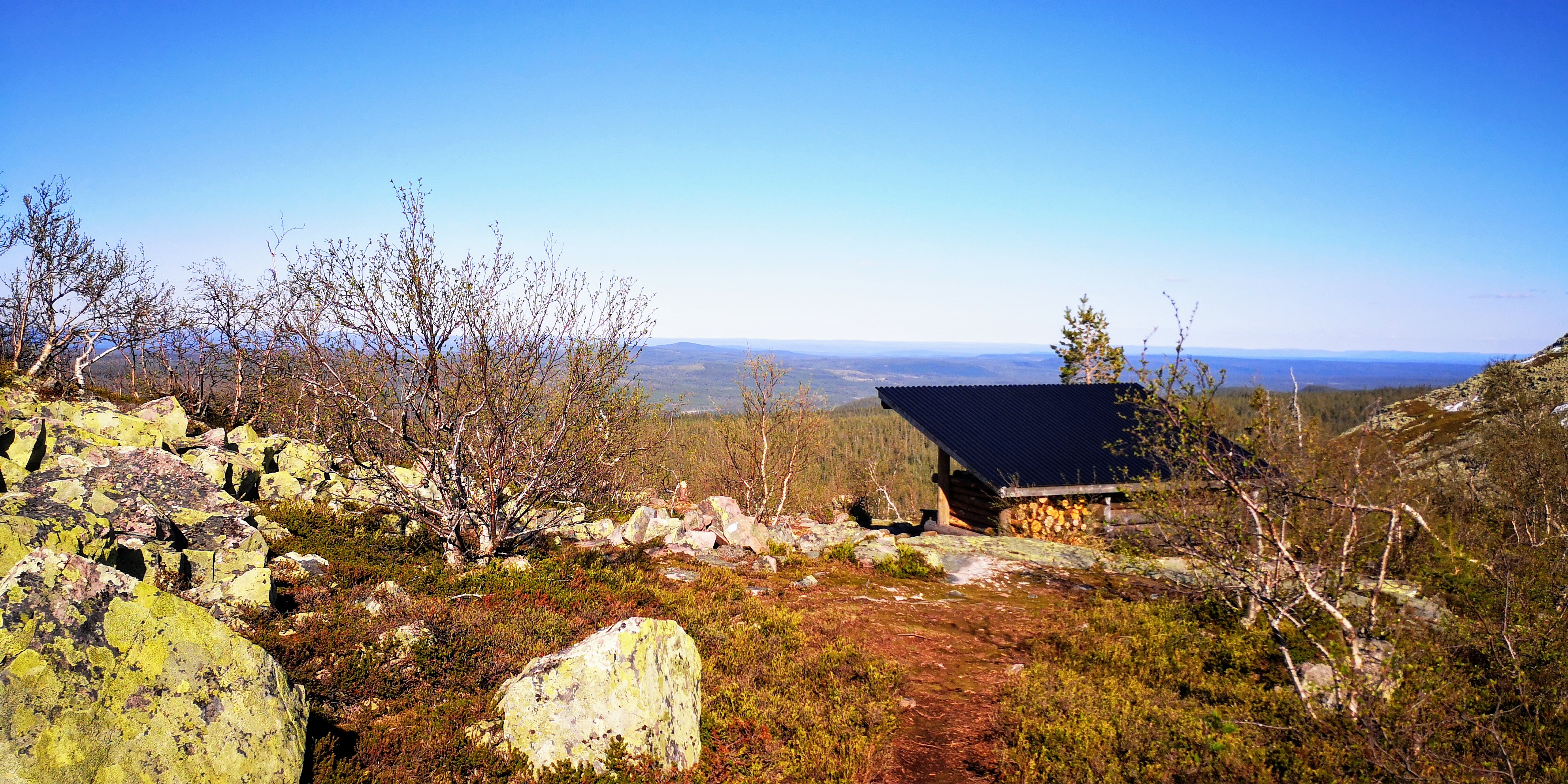We lopen over aangelegde houten planken en bruggetjes, en zien kleurrijke korstmossen en helderblauwe meren om ons heen. Daartussen groeien kleine gekromde berkenboompjes, vaak bestaande uit meerdere kleine stammetjes die niet langer dan anderhalve meter hoog zijn. Overal liggen nog grote dotten sneeuw, ondanks dat we maar op achthonderd meter hoogte zitten en het rond de twintig graden boven nul is. De grond moet hier nog wel heel koud zijn.
