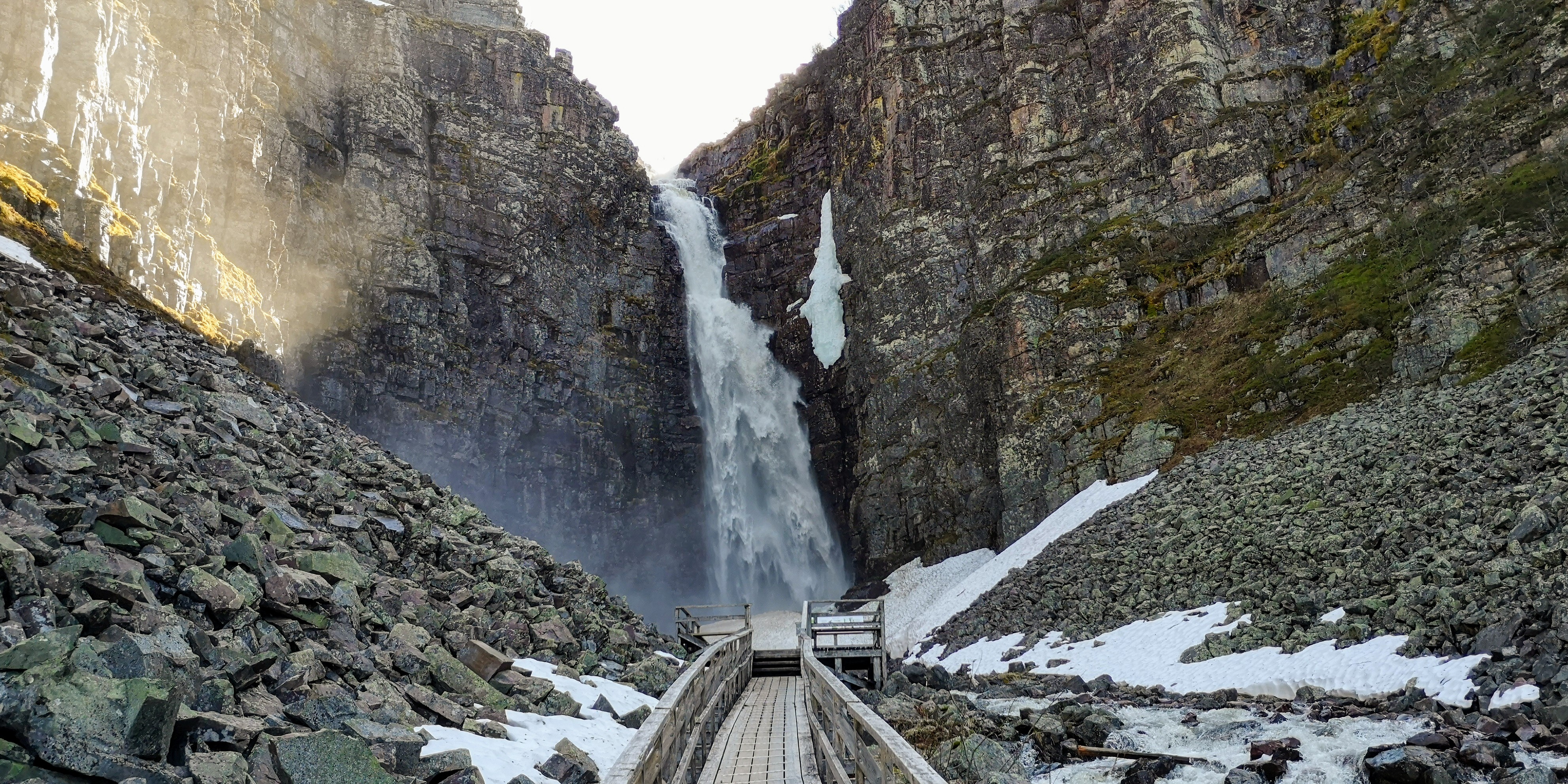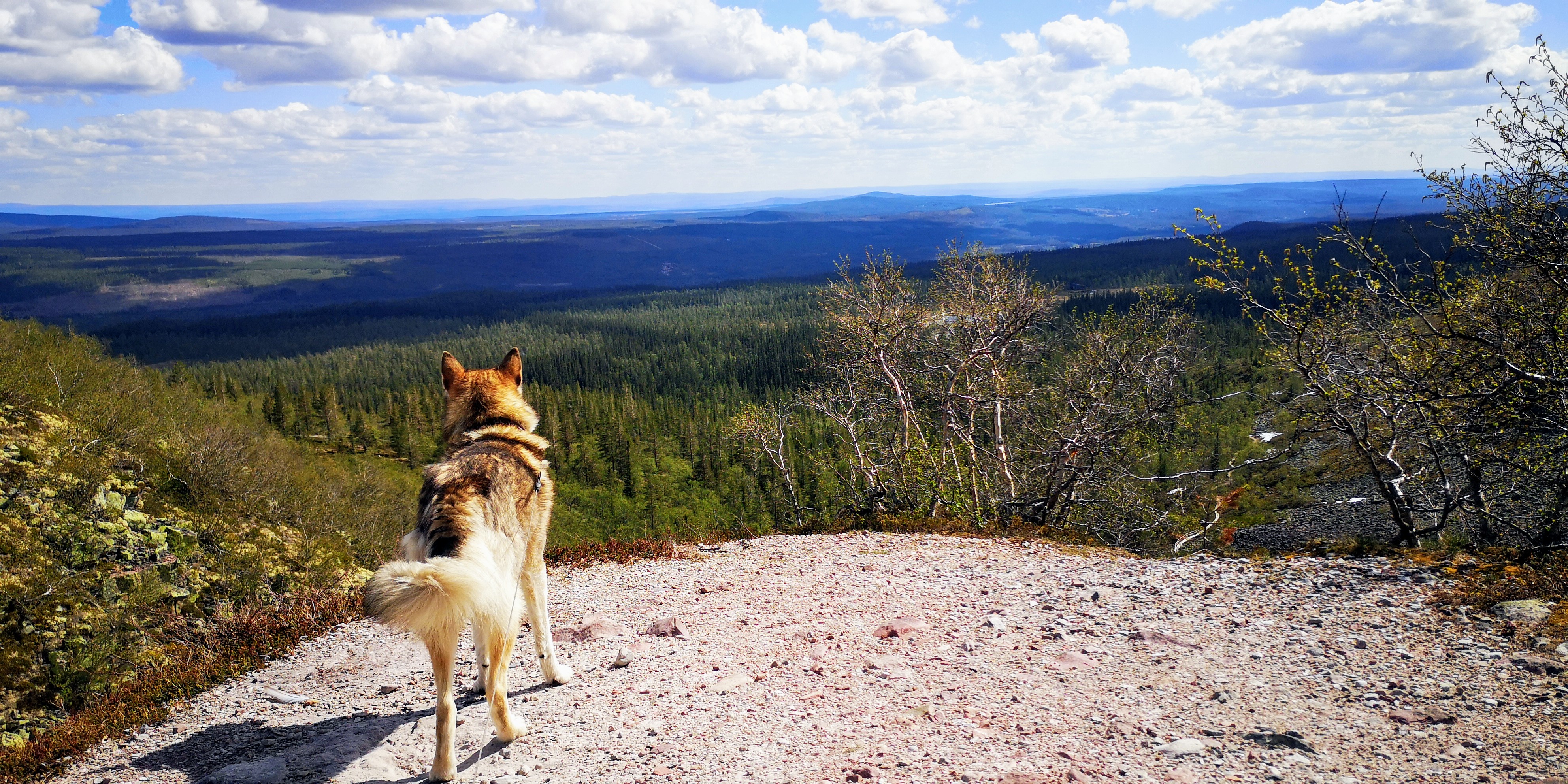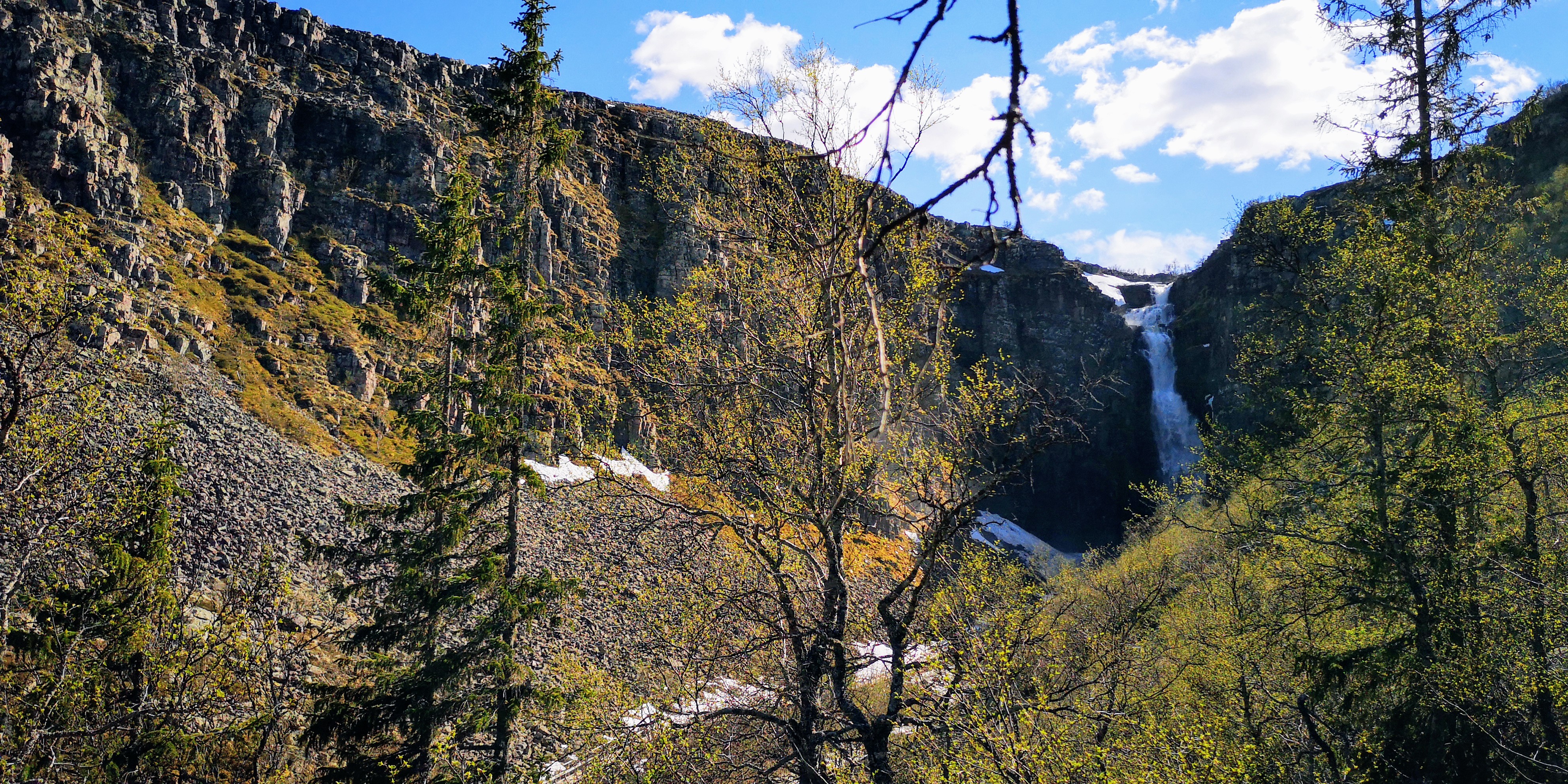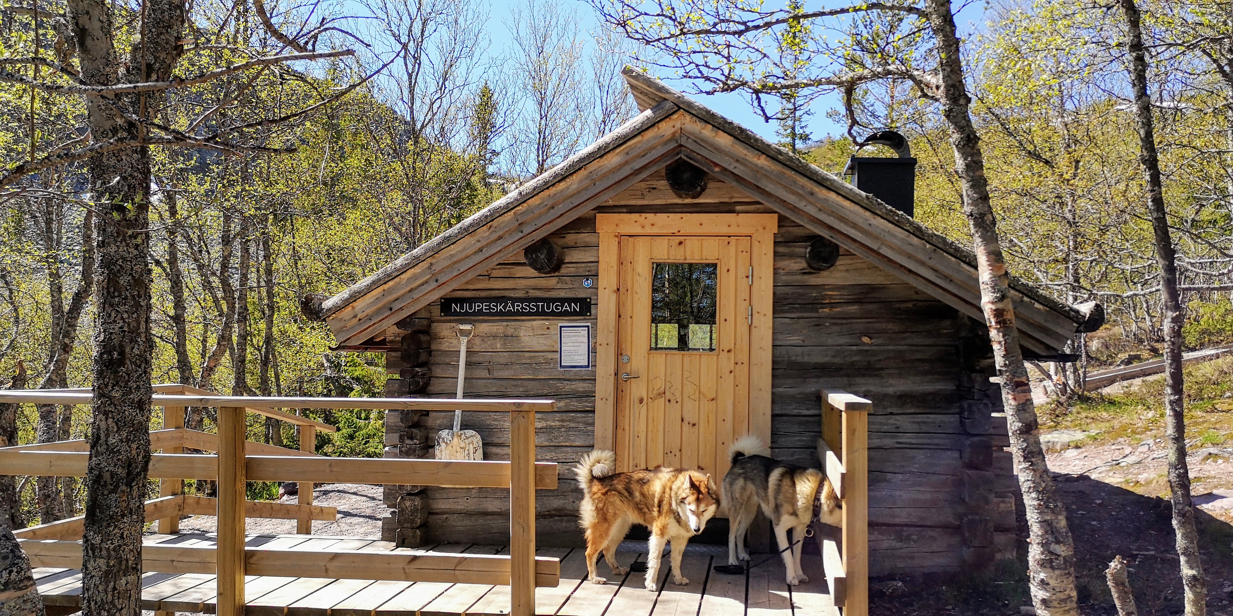 Samen met de honden lopen we een rondje van nog geen vier kilometer naar Njupeskär, die met zijn 93 meter een van de hoogste watervallen van Zweden is. Hoe dichterbij we komen, hoe oorverdovender het vallende water is. Het zorgt voor een zware regenmist tussen de massieve rotswanden in. Er komt veel kou vanaf en ik trek een vest aan, maar de honden staan graag nog even met de pootjes in het ijskoude water.