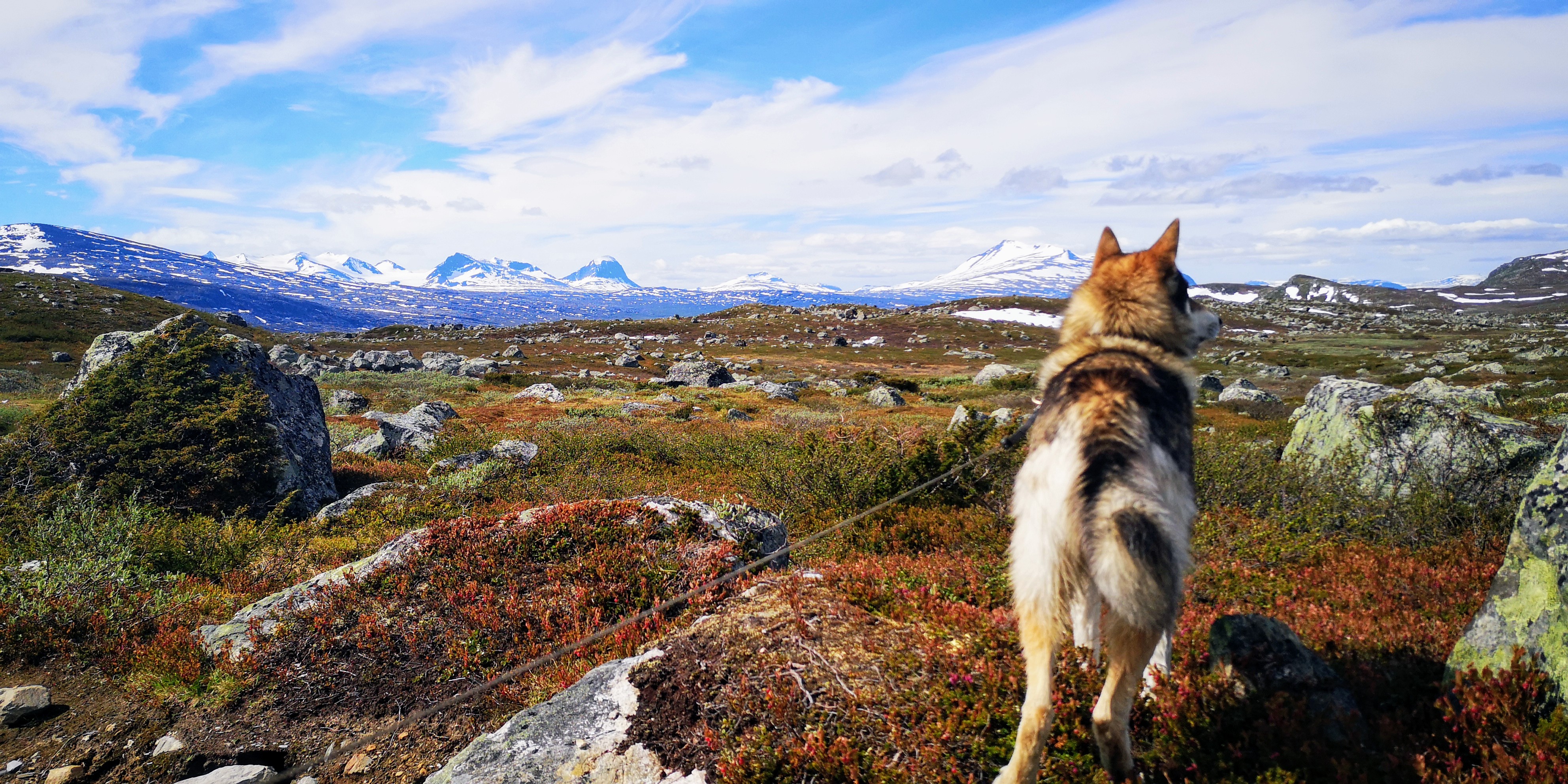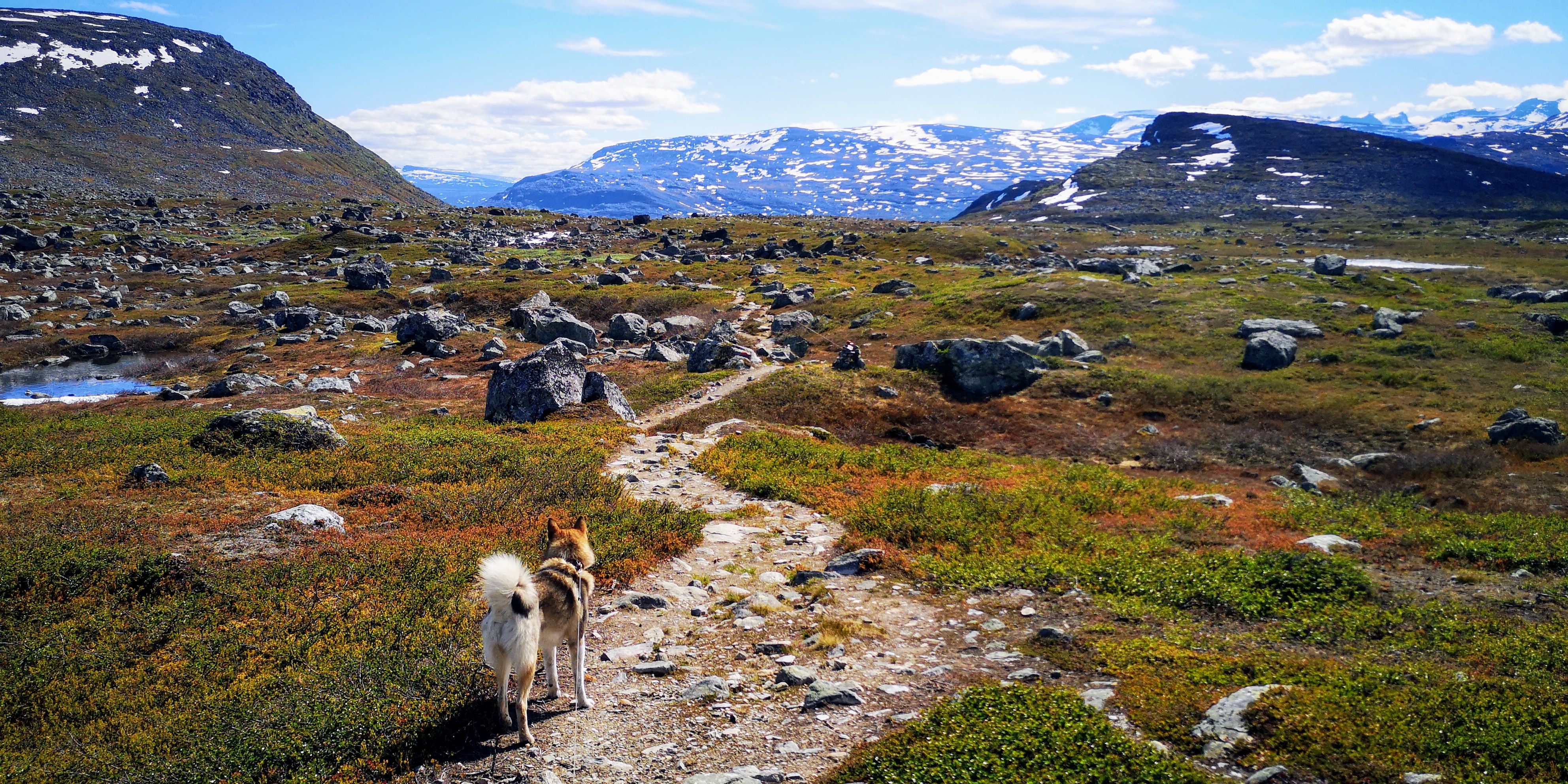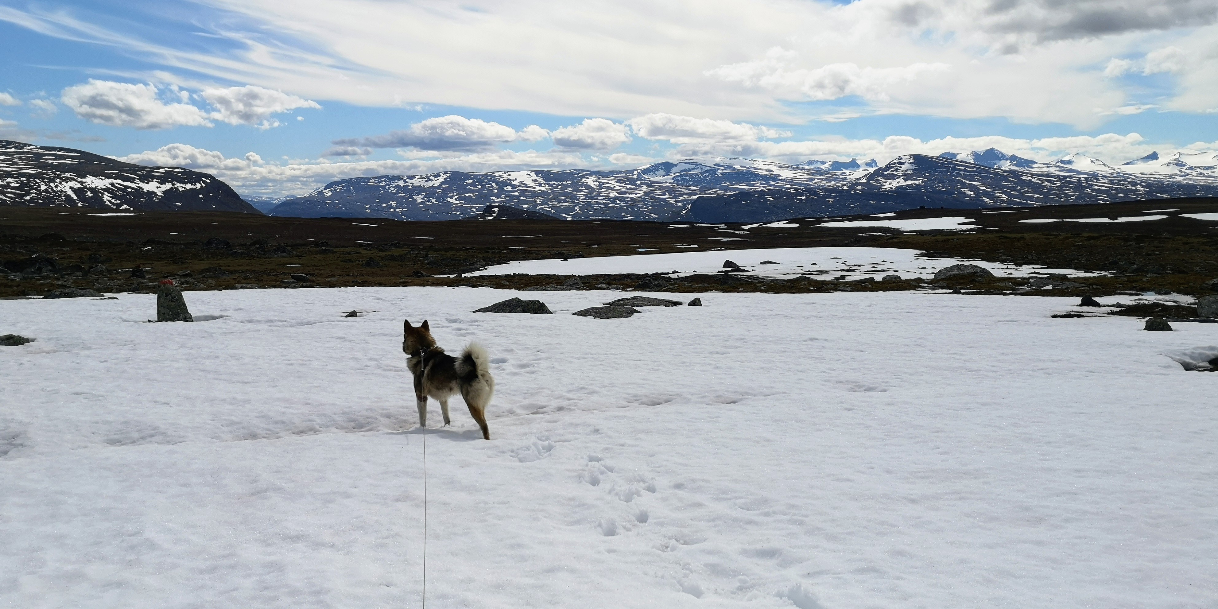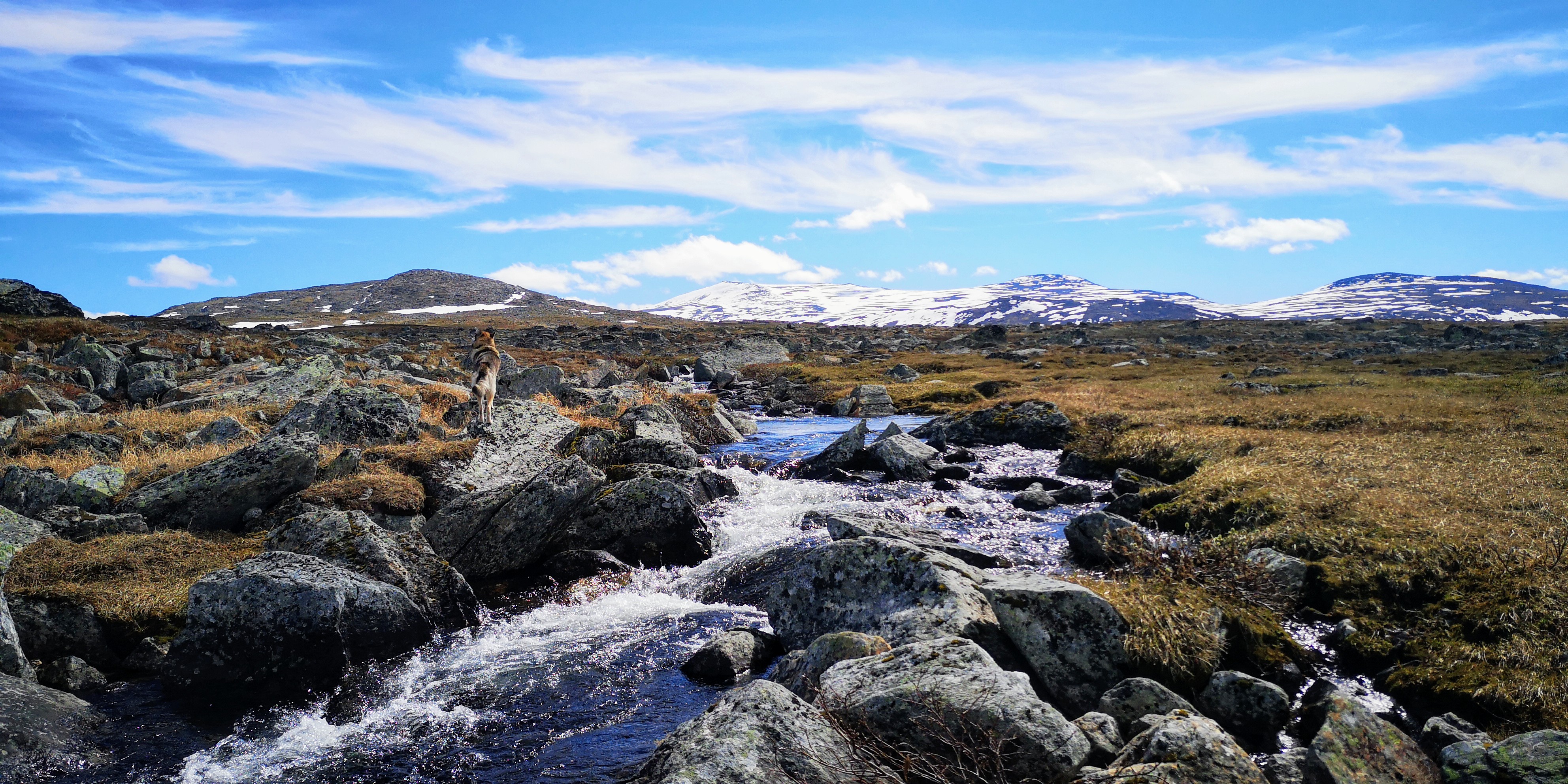 Geknield bij een snel stromend riviertje drink ik het heldere water. Het is ijskoud en proeft bijna alsof het gezoet is. Mika staat met alle vier de pootjes in het water om af te koelen. Er staat weliswaar een fris windje, maar de zon schijnt fel op de bergen. De sneeuw smelt en overal vormen zich kleine waterstroompjes, die hun weg naar beneden vinden.