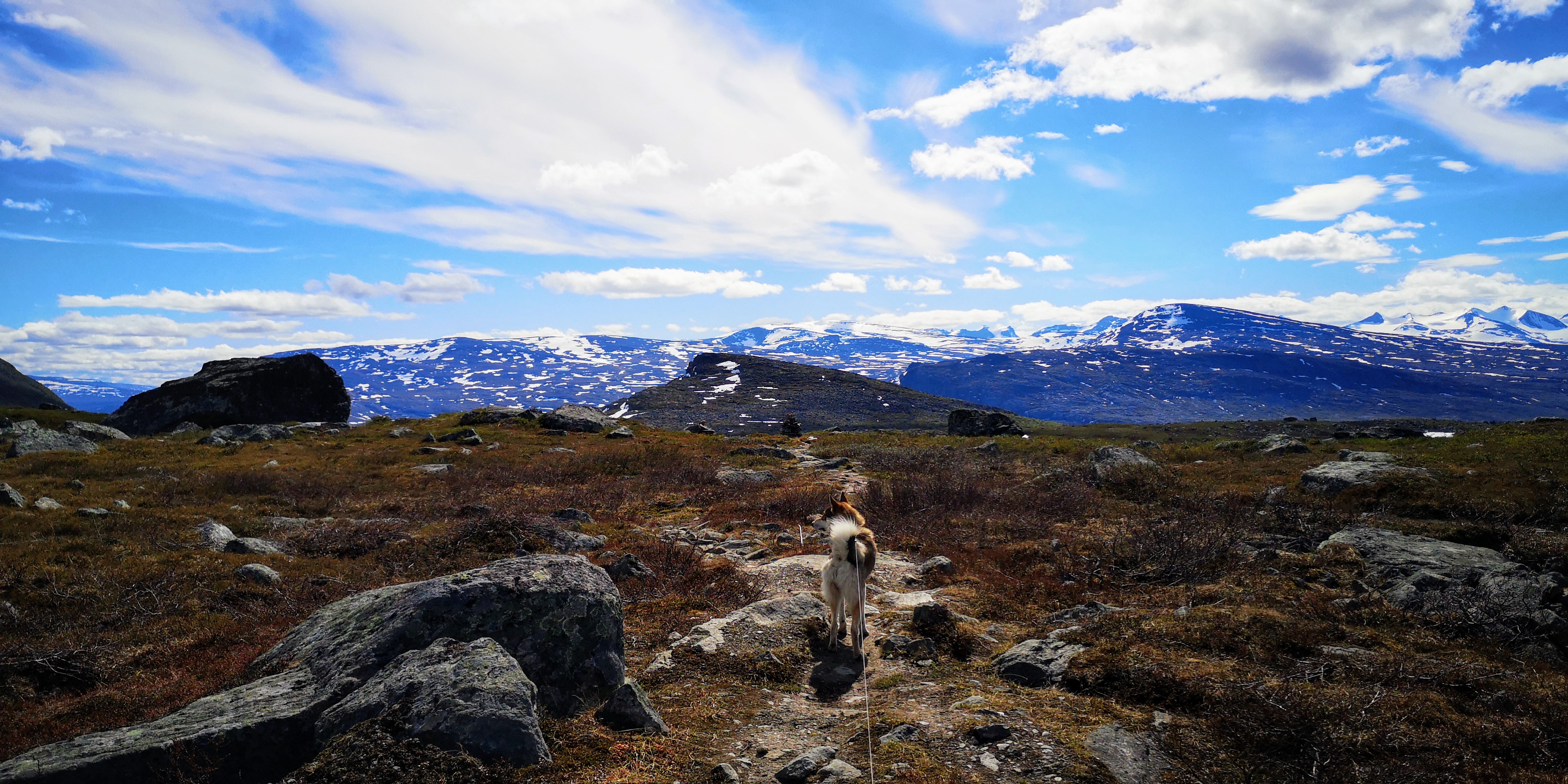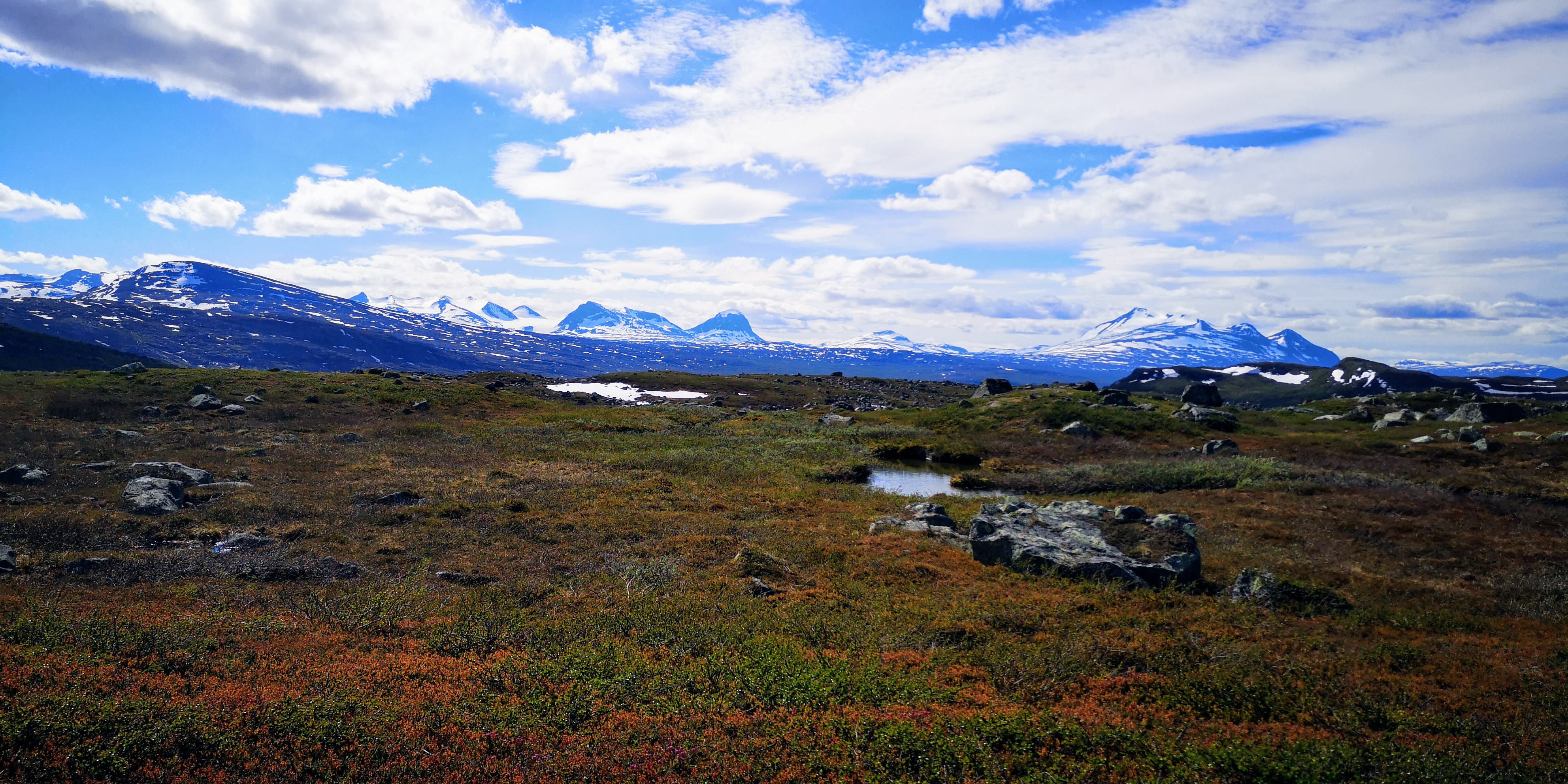 Vanaf de berghut Vakkotavare zijn Mika en ik de Kungsleden track gevolgd richting de volgende berghut Teusajaure. We zullen de hut niet bereiken, want deze is 17 kilometer lopen, en dat heen en terug redden Mika en ik niet. In drie kwartier klimmen we omhoog uit de vallei, en lopen vervolgens over met stenen bedolven bergplateaus. Rondom ons vormen zich de meest prachtige besneeuwde bergketens, die oneindig lijken door te lopen. Links zien we de Kallaktjakka van ruim 1800 meter hoog en iets verder weg aan de rechterkant is de bijna 1500 meter hoge Nieras. De wolken lijken de toppen van de bergen aan te raken. Een vederlichte aanraking, die de aarde met de lucht verbindt.