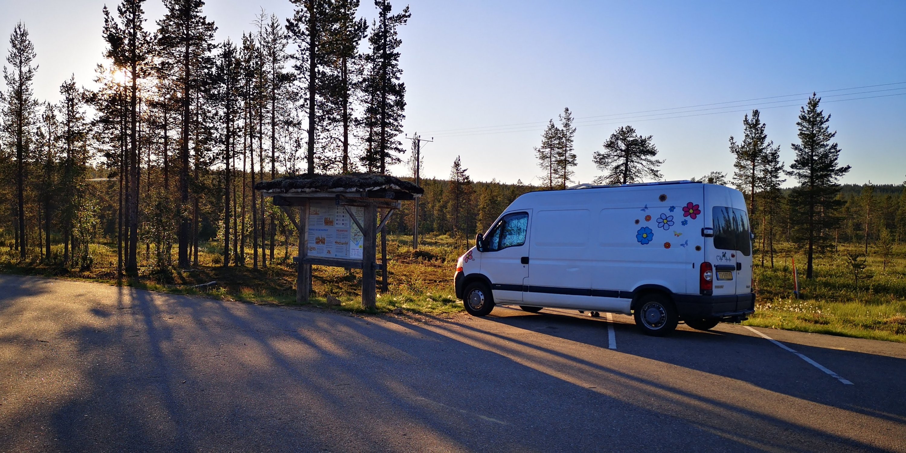 Rond een uur of negen in de avond schijnt de zon nog steeds fel op de bus. Ik word chagrijnig van de warmte en van de kleine zandvliegen en muggen, die continu om ons heen zwermen. Ik besluit om het laatste uur naar het natuurgebied Pallas-Yllastunturin ook maar te rijden. De airco biedt ons een heerlijke koelte tijdens het rit. Er staan een paar auto’s en campers op het grote parkeerterrein een paar honderd meter voor het Pallastunturi bezoekerscentrum. Hier brengen we de nacht door.