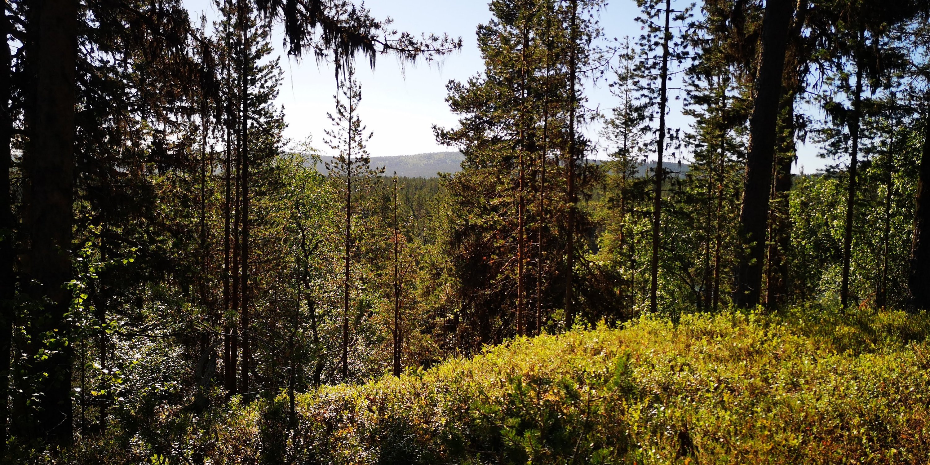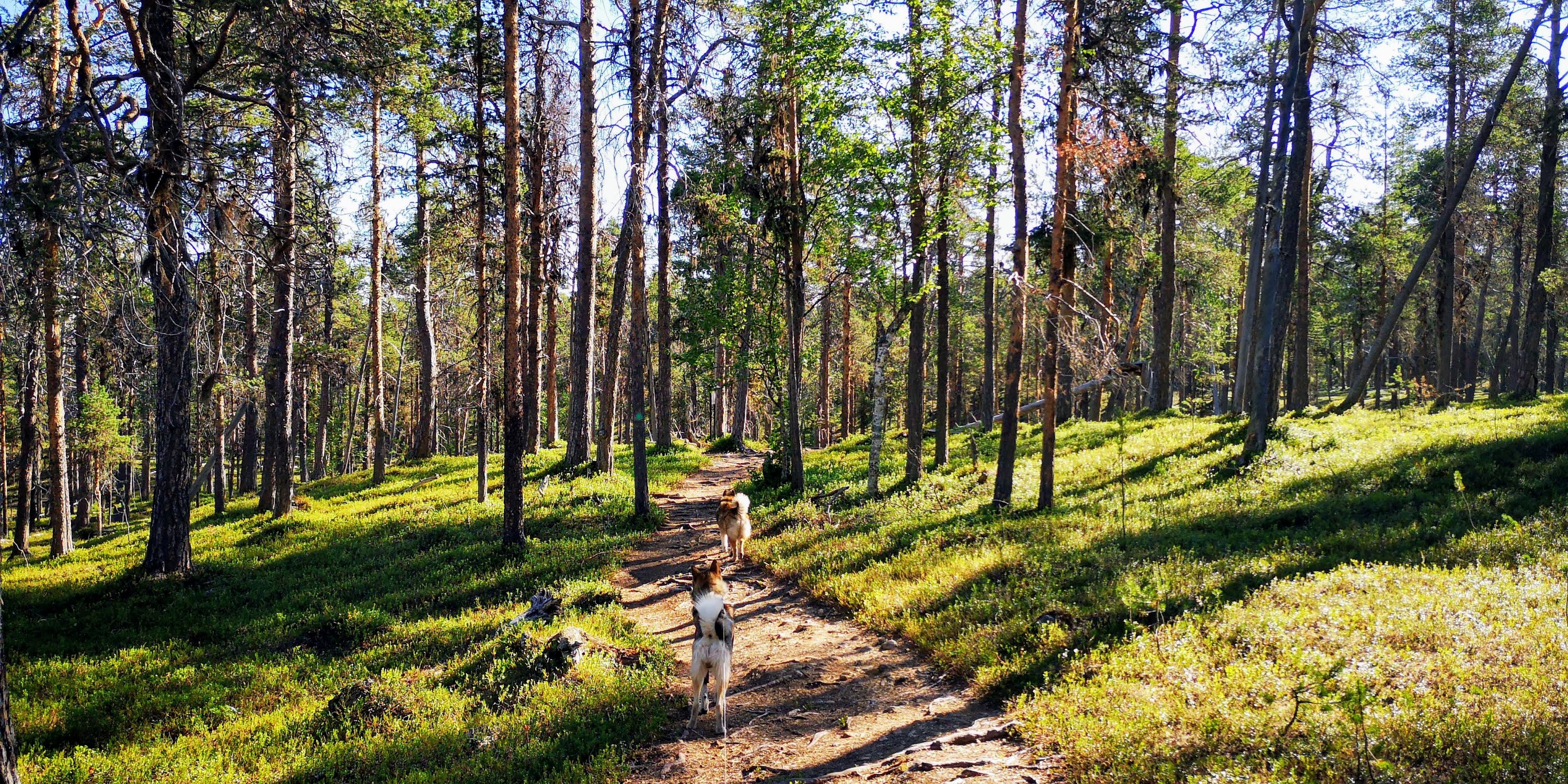 De volgende ochtend schijnt de zon om zes uur alweer op de voorkant van de bus. Het warmt snel op. Een halfuurtje later lopen we de Luontopolku route door het koele bos, een rondwandeling van vier kilometer. Het diepgroene sparrenbos doet bijna sprookjesachtig aan. De zon werpt lange schaduwen over de bemoste bosgronden, met daartussen verscholen kleine meertjes en meanderende beekjes. De stilte wordt alleen onderbroken door lichte vogelgeluiden en het gezoem van talloze insecten. De geur van het kruidige hars verspreid zich op het verkoelende windje dat tussen de bomen doorwaait. Marte en Mika lopen met lichte tred over het smalle paadje, dat door het bos heen kronkelt.