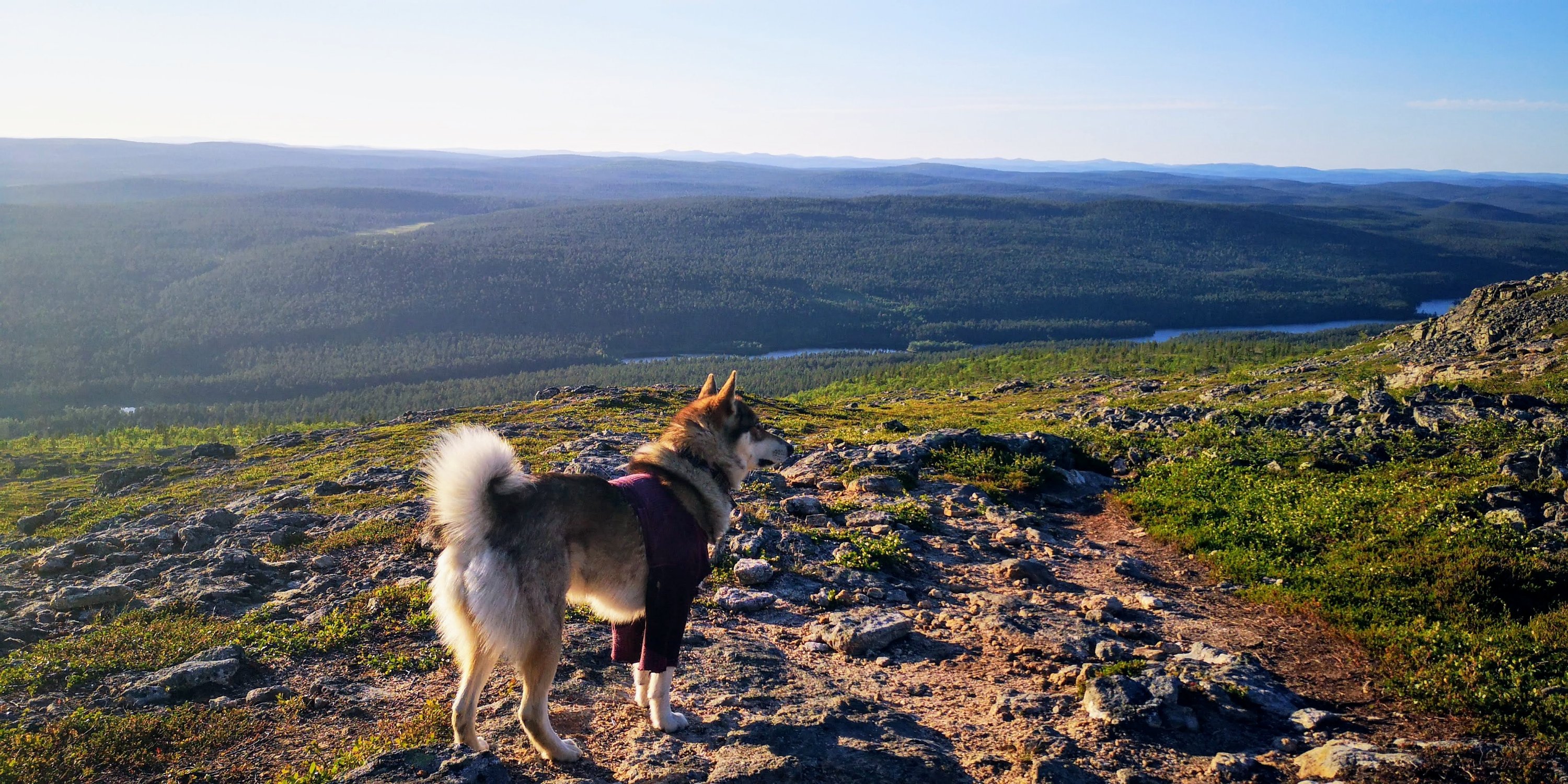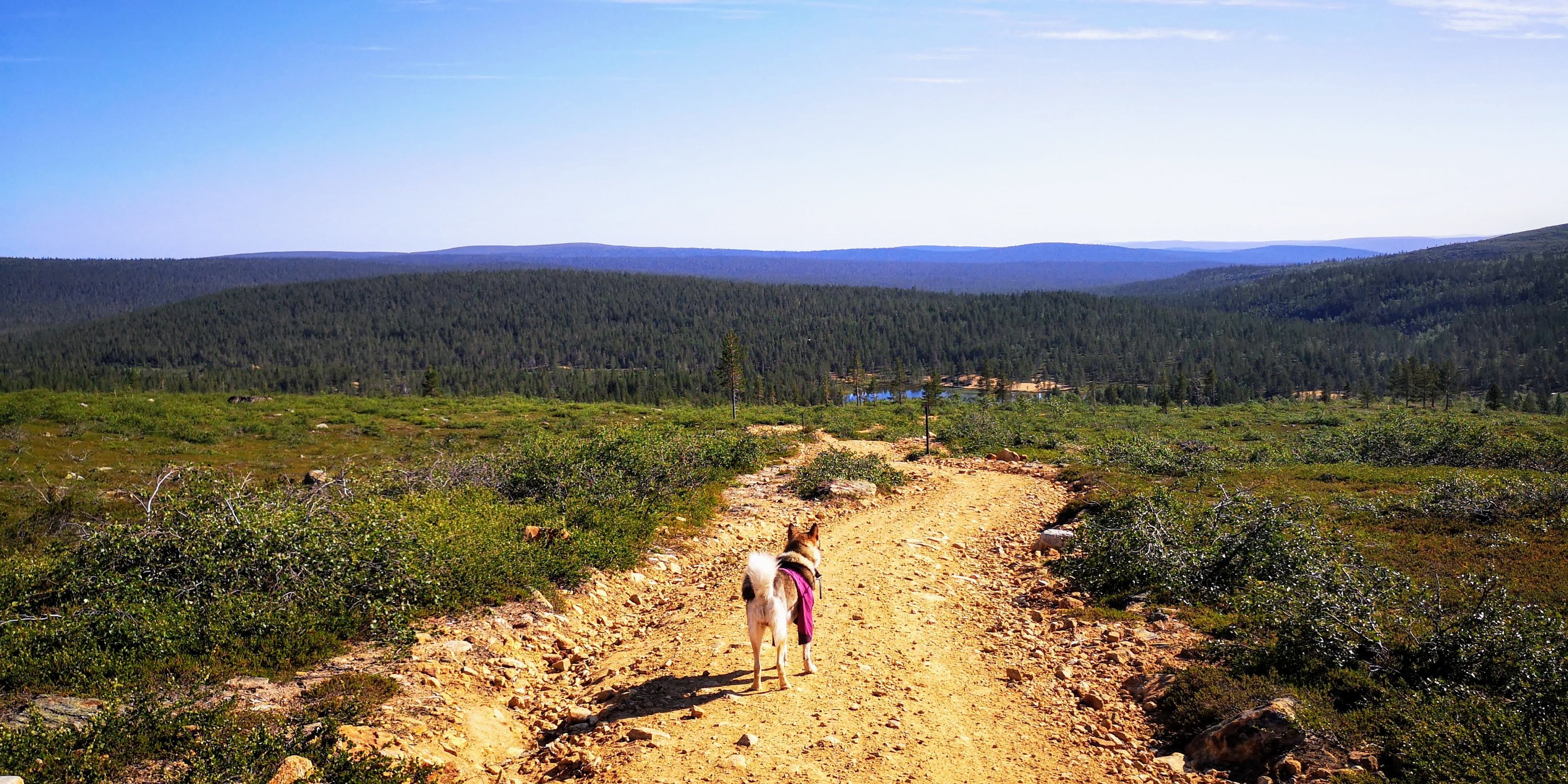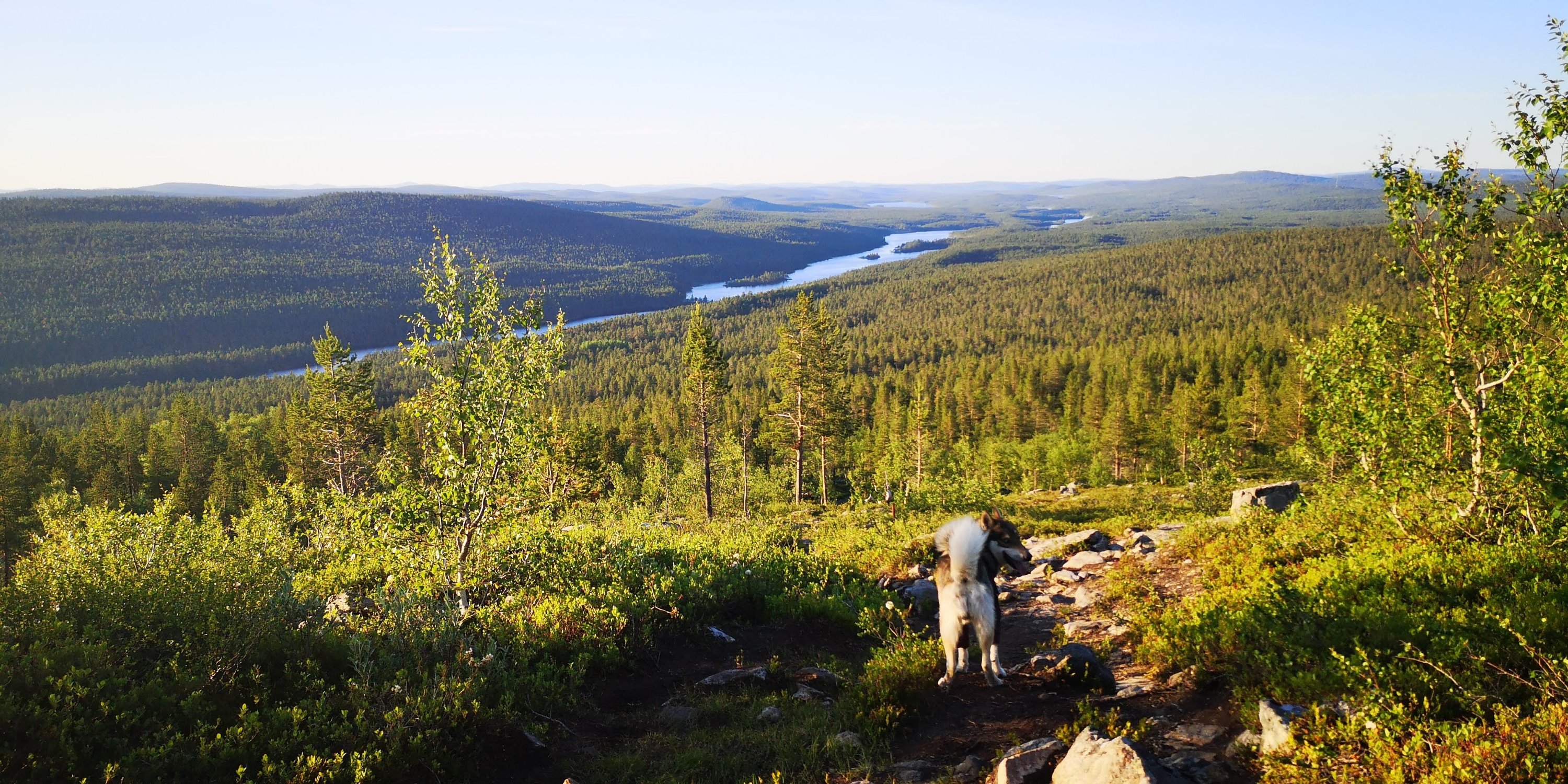 Rond een uur of half acht in de avond, koelt het wat af. Ik laat Marte achter in de bus met de schuifdeur op een kier en het muggengordijn ervoor. Ik doe het niet graag, maar deze plek voelt redelijk veilig, en Mika en ik hebben er beiden behoefte aan om te lopen. Mika moet zijn energie kwijt na een hele dag liggen slapen, en ik moet de spanning eruit lopen. Deze middag ontdekte ik dat de huishoudaccu het niet meer doet, en dat maakt dat ik wat aanpassingen moet doen en mijn telefoon wat minder kan gebruiken. Ik heb een korte broek en t-shirt aan, iets wat ik zelden draag in de natuur. Meestal heb ik een lange broek en iets met lange mouwen aan in het bos, vanwege alle insecten en stekelige planten. Maar omdat het toch nog warm klammig is, spuit ik mijn armen, benen, nek, gezicht en zelfs mijn schoenen helemaal onder met insectenspray. Het lijkt ze op afstand te houden. We lopen de Joekielinen route van zestien kilometer. Het eerste stuk lopen we over een klein paadje door het bos. Het voelt onwerkelijk om zo alleen in de avond door een bos in een groot natuurgebied te lopen. Ik ben extra alert op het volgen van de bordjes. Het zou toch heel vervelend zijn om hier in een groot bos te verdwalen. De laatste tweeënhalf kilometer klimmen we omhoog. Bovenop de Joenkielinen, van net boven de 500 meter hoog, hebben we een mooi uitzicht op de omringende bergen. De terugweg lopen we over het Kultareitti pad, zo genoemd omdat hier een eeuw geleden goud uit rivier Lemmenjoki werd gedelfd. Vier uur later, om half twaalf ’s avonds, zijn we terug bij de bus. De zon schijnt nog steeds laag over de bomen heen. Marte springt blij de bus uit en glijdt prompt uit over het bruggetje. Even later zit ze sipjes in de bus voor zich uit te kijken met een dikke lip en een pijnlijke voorpoot. ‘Verdorie,’ denk ik, ‘het zit ons even niet mee.’