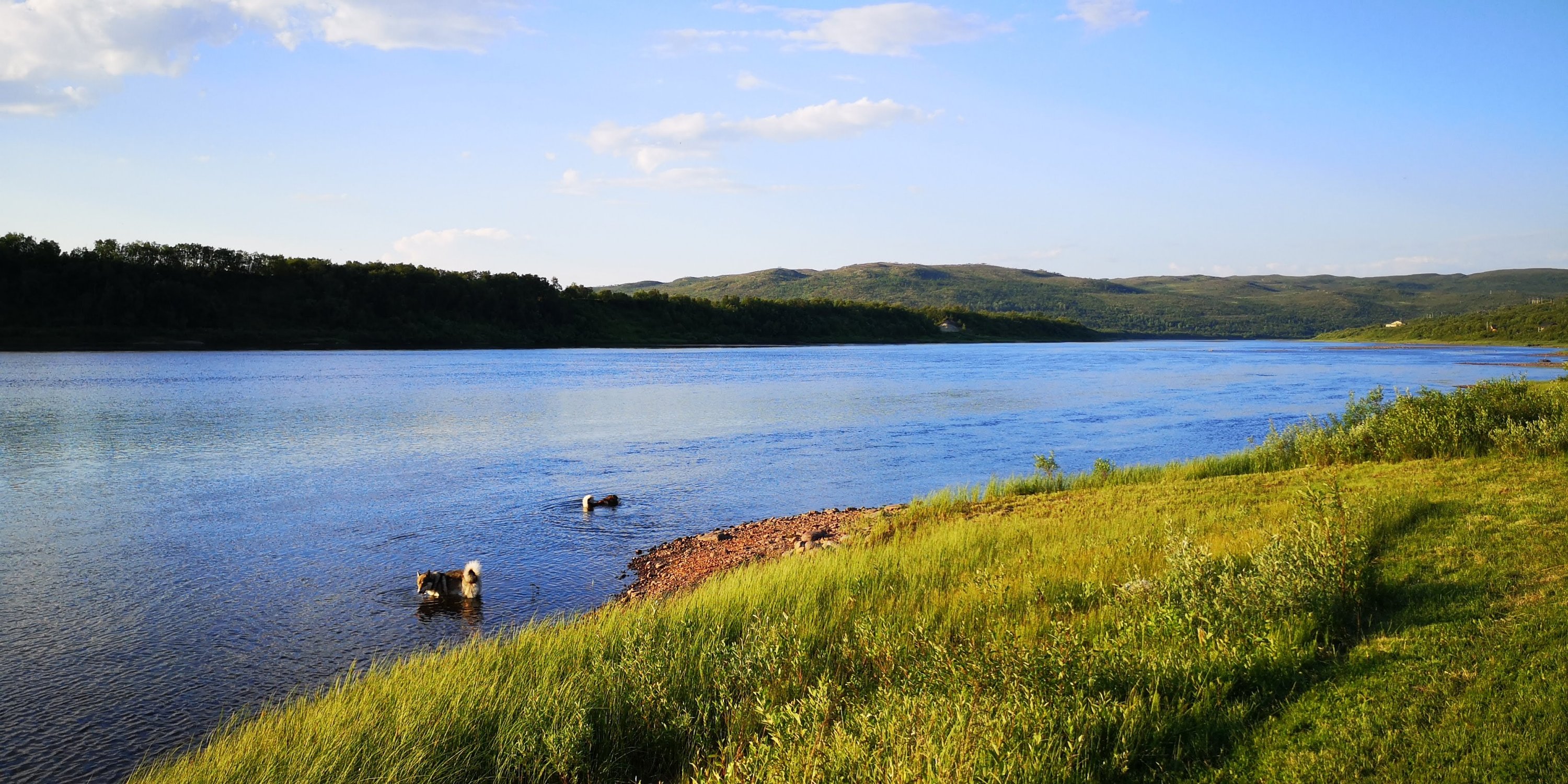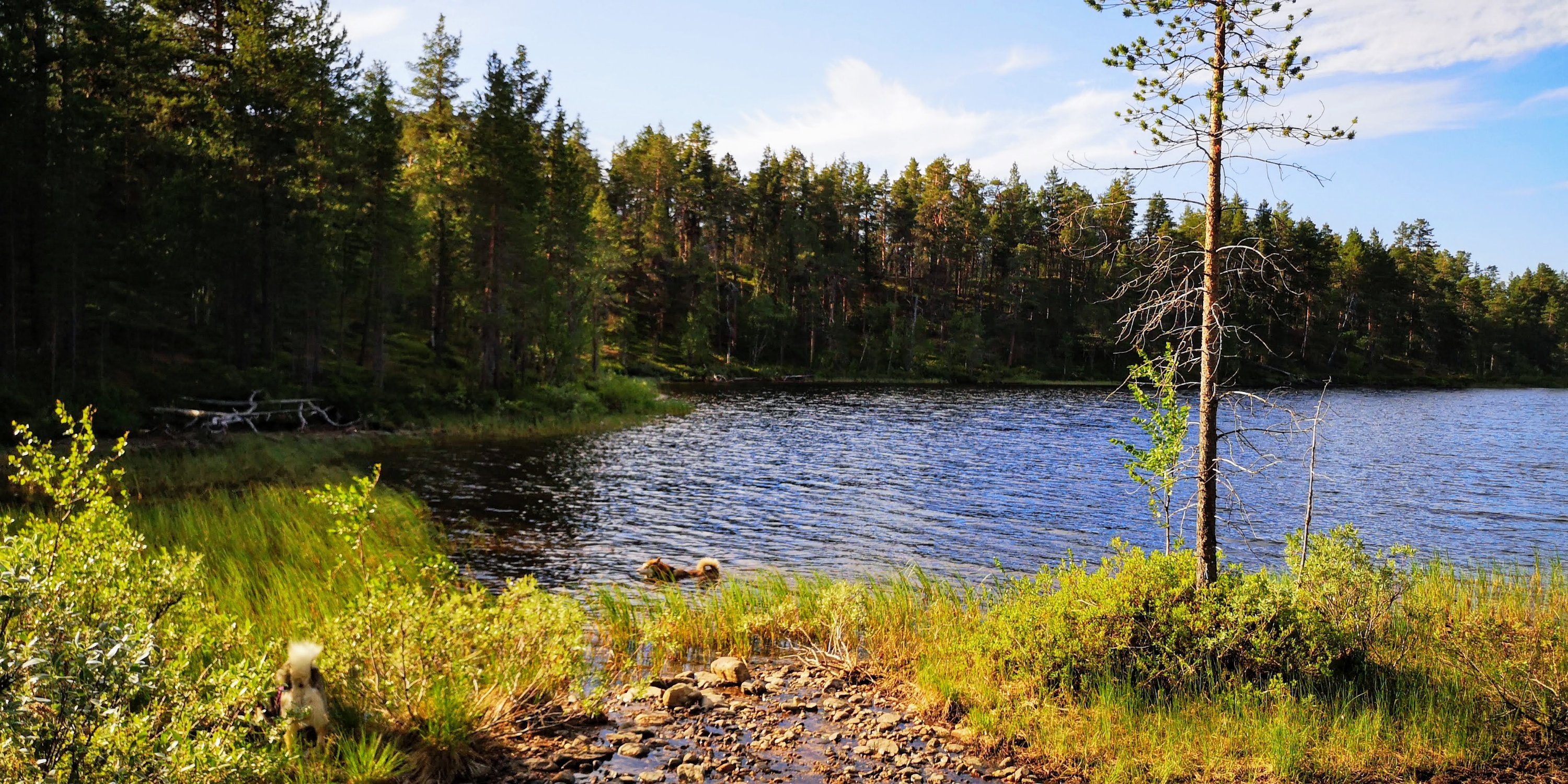 Het parkeerplaatsje diep weggestopt in Lemmenjoki Nationalpark is een verademing. De bomen aan de zijkant bieden schaduw tijdens deze warme dagen. Er staat een toilethuisje en een grote bruine vuilcontainer. Vanaf deze parkeerplaats starten veel wandelroutes, grote en kleine. Samen met de honden loop ik de Muurahhaislampi route van nog geen kilometer naar een klein meertje, of eigenlijk een aftakking van de rivier Lemmennoki, die dwars door het  natuurgebied loopt en zijn naam aan heeft te danken. Marte en Mika plonsen luidruchtig door het water.