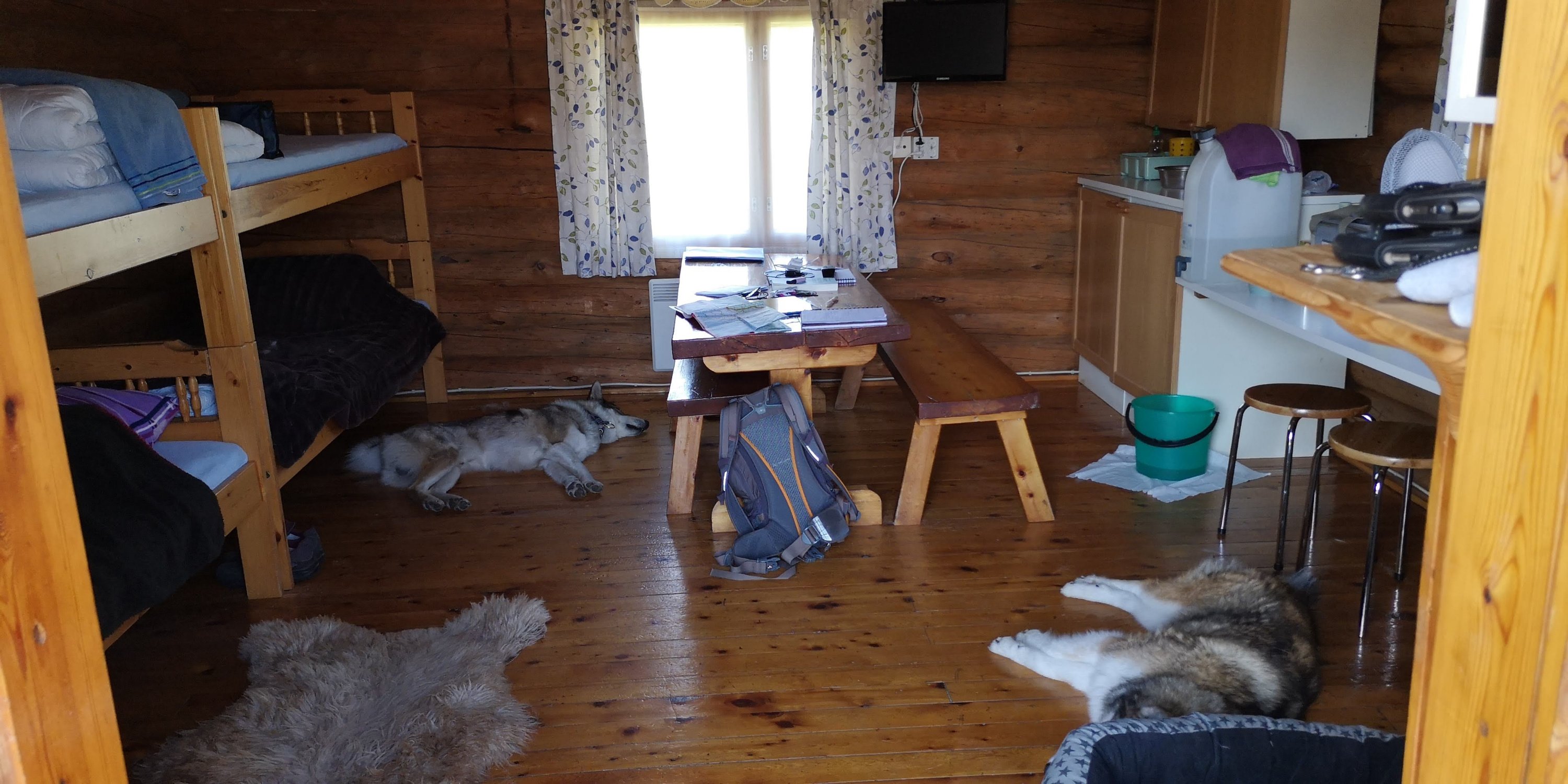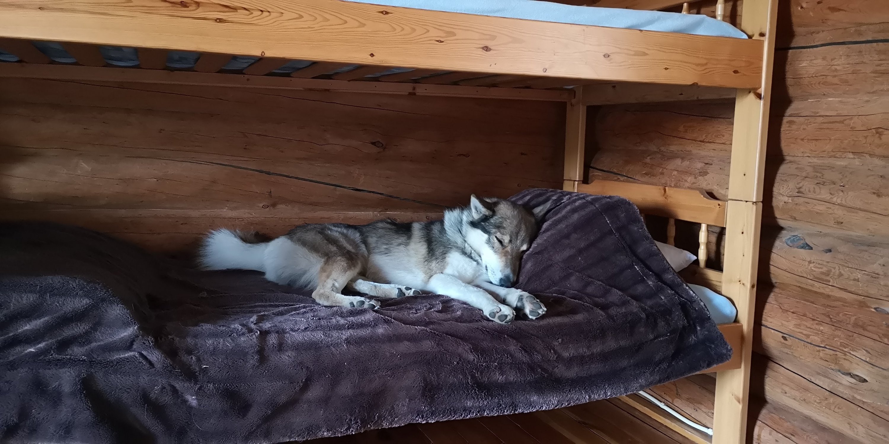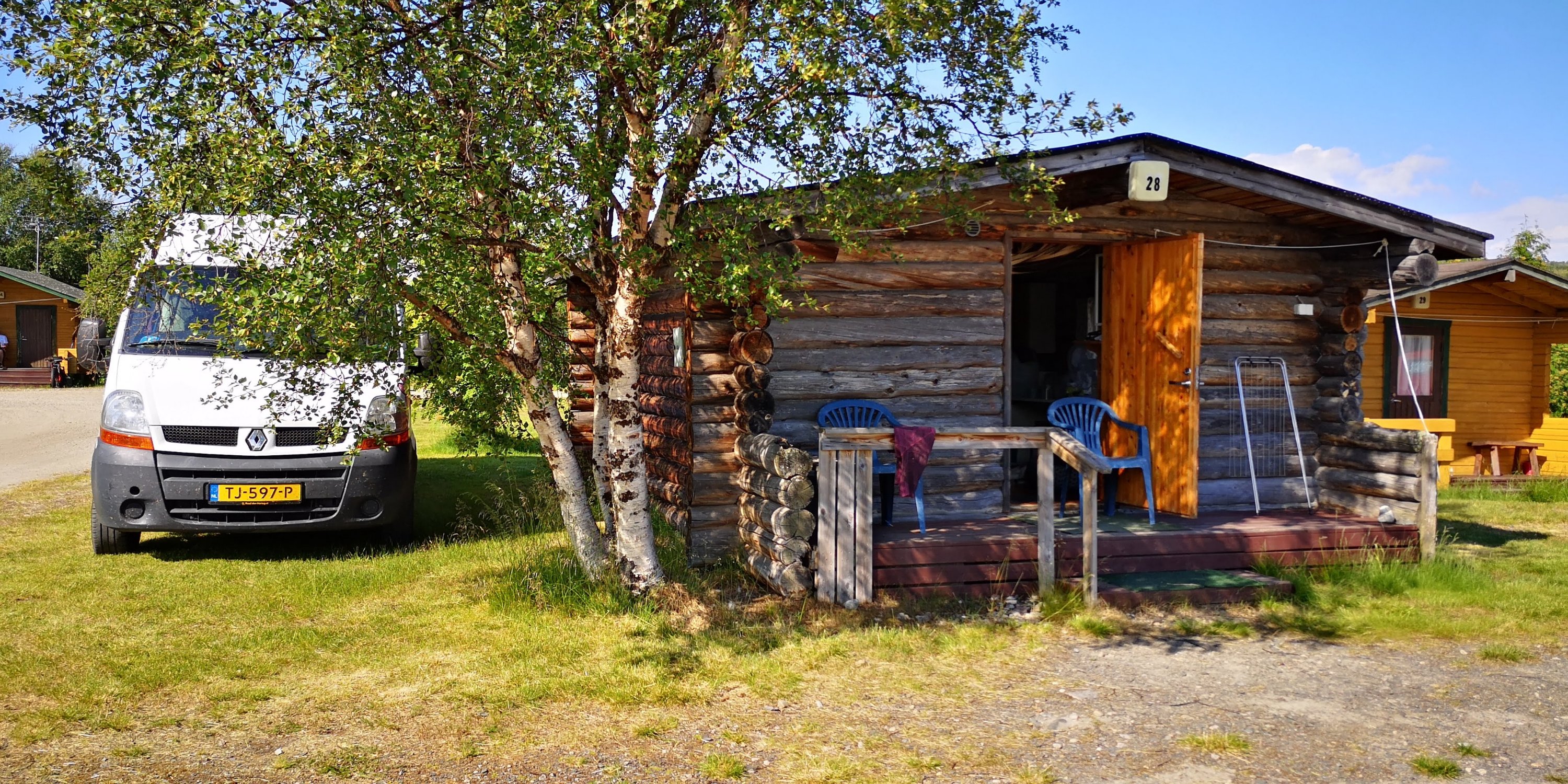 Ik start de bus en zie tot mijn schrik dat er een lampje op mijn dashboard brandt. ‘Dit kan niet waar zijn.’ De bus gaat niet in z’n automaat en het lukt niet om te schakelen. Met trillende handen blader ik de handleiding van de bus door. Ik vind het symbooltje en lees dat er iets mis is met de versnelingsbak. Ik zet de motor uit en zit verslagen achter het stuur. ‘Nu weet ik het echt even niet meer.’ Na even zo gezeten te hebben, probeer ik het nog een keer en start de bus. Het lampje brandt, maar gaat daarna uit en schakelen lukt weer. ‘Mischien was ‘ie even in de war,’ hoop ik tegen beter weten in. Met een knoop in mijn maag rijd ik naar de camping in Utsjoki. Daar aangekomen stel ik altijd een paar standaard vragen over de aanwezigheid van faciliteiten, zoals WiFi, wasmachine en douches. Volgens de eigenaar van de camping mag de wasmachine niet worden gebruikt vanwege Corona. Tegen beter weten in, maar omdat ik al onder spanning sta vanwege alle tegenslagen, ga ik in discussie. ‘Hoezo?, kan ik Corona krijgen van de wasmachine?’ Er komt een ingewikkelde uitleg, en ja, ‘de WiFi doet het ook niet, en de grens naar Noorwegen is hier gesloten. Daarvoor moet u nog verder rijden naar Nourgam.’ Ik bedank hem vriendelijk en zeg dat ik daar een camping opzoek. Ik start de bus en deze wil weer niet in de automaat. Het lampje brandt weer. Uiteindelijk, na diverse pogingen, lukt het. Maar ik weet nu dat er echt iets mis is met de bus. De kapotte huishoudaccu lijkt niet zo belangrijk meer. ‘Die bus moet gewoon goed rijden.’ Veertig kilometer verder stop ik bij Camping Holiday Village. Deze ziet er een stuk beter uit, dan die in Utsjoki, maar is dan ook meteen een stuk duurder. Dertig euro voor een plek en acht euro voor gebruik van de wasmachine. Ik kruip weer achter het stuur om naar de voor mij aangewezen plek te rijden. De bus wil niet meer starten. Ik probeer het wel een keer of tien, maar er komt geen geluid meer uit. De zon schijnt fel op de bus, en het wordt steeds warmer. Ik kan de honden zo niet laten zitten. Er zit niets anders op dan een cabin te boeken. De goedkoopste kost 65 euro per nacht. Snel haal ik de honden uit de bus en loop naar cabin 28. Deze is gemaakt van boomstammen, met in het midden een lage deur, waar ik met mijn 1.68 meter net onderdoor kan. Aan de linkerkant staan twee stapelbedden. Aan de rechterkant een kleine keukenopstelling met een koelkast, twee elektrische kookplaatjee, magnetron en wat pannen, borden en bestek. Verder is er een televisie, kachel en zelfs een ventilator, die ik meteen op hoog aanzet. Marte en Mika gaan op de houten vloerplanken liggen, terwijl ik de bus uitpak. ‘Ik heb altijd al eens in zo’n cabin willen slapen. En nu doe ik het,’ zeg ik tegen ze. Ik draai een was in de wasmachine en neem, na een maand, eindelijk weer eens een douche. De campingeigenaar komt ook nog even naar de bus kijken, en zo waar start deze weer, maar de foutmelding blijft staan. Ik besluit om morgen naar de dichtsbijzijnde garage te gaan. ‘Misschien moet de bus alleen gereset worden,’ hoop ik. Die avond kijk ik voor het eerst sinds vijf maanden televisie. De laatste keer was in dat luxe appartement in Portimao, Portugal. Ik kijk naar een oude James Bond film, een beetje bloederig, maar het leidt in ieder geval een beetje af.
