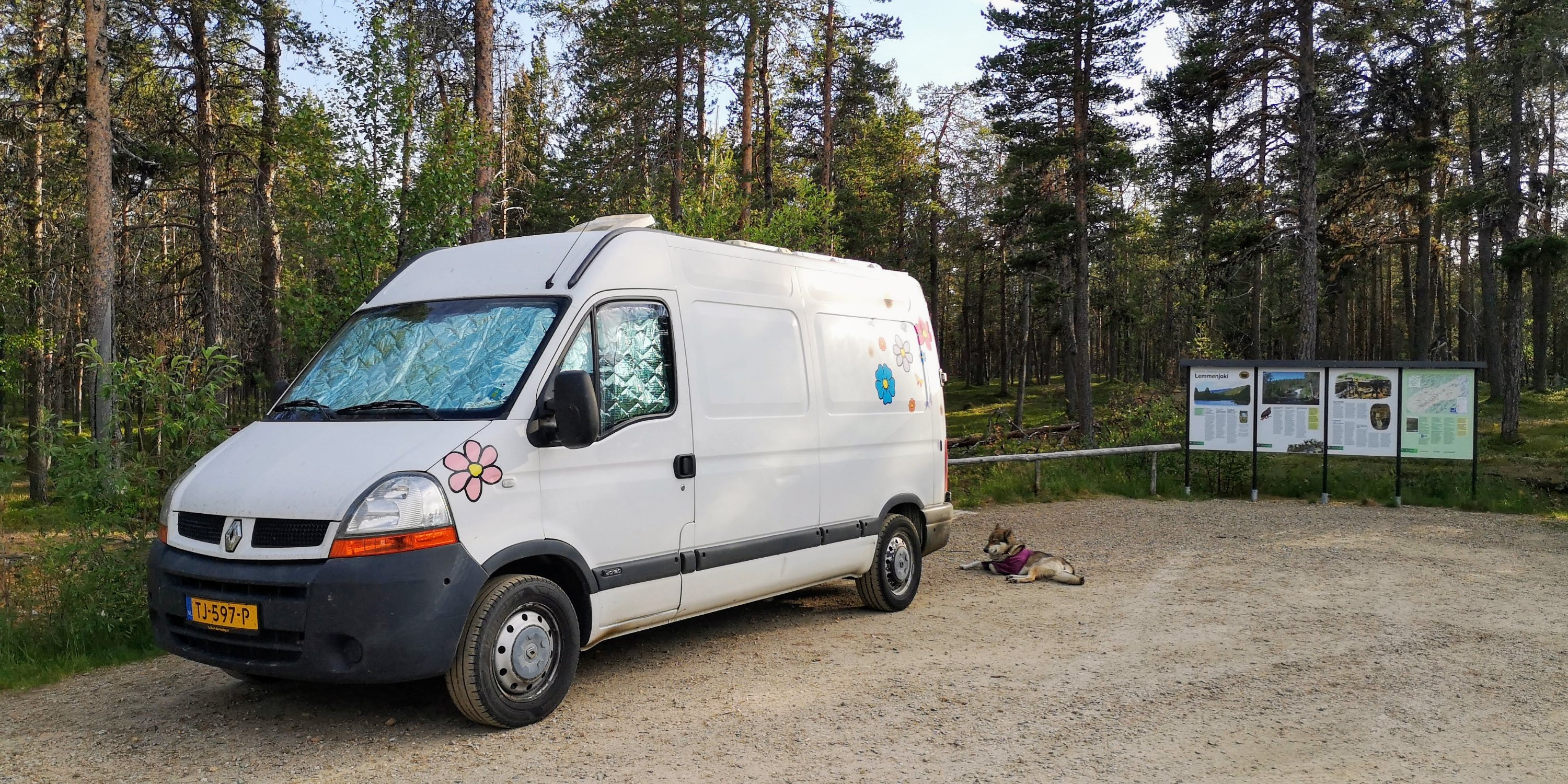 Om negen uur de volgende ochtend sta ik al bij de garage in Nourgam, en ik word gelukkig meteen geholpen. Al snel blijkt dat ik een nieuwe triptonic pomp nodig heb. De garage eigenaar zegt dat hij niet de kennis heeft om een nieuwe triptonic pomp bij een Renault te plaatsen. Daarvoor moet ik naar Rovaniemi, een stad, iets meer dan 500 kilometer richting het zuiden. Even moet ik slikken. Ik had me zo verheugd op het volgende stuk reizen door het hoge noorden van Noorwegen. De grenzen lijken nu eindelijk weer open te gaan, en ik had hier speciaal op gewacht. Maar het is niet anders, ik durf niet met een kapotte pomp verder te rijden. Volgens de garage eigenaar kan ik in een rustig tempo richting Rovaniemi rijden. Mocht de bus er onderweg mee ophouden, dan moet ik maar een sleepbedrijf bellen. Ik keer terug naar de camping, waar Marte en Mika relaxed in een koele cabin liggen. Vanaf woensdagavond daalt de temperatuur en gaat het zelfs een beetje regenen. Dat is voor de honden wel zo prettig, maar voor nu  brengen we nog een nachtje in de cabin door. Ik heb weinig eetlust en een beetje buikpijn van alle stress. ‘Maar…,’ schreef een mede-nomade, die ik in een van de Zweedse natuurparken had ontmoet, ‘Shit happens, er is altijd wel weer een oplossing, en wie weet wat dit nieuwe avontuur je weer allemaal brengt.’
