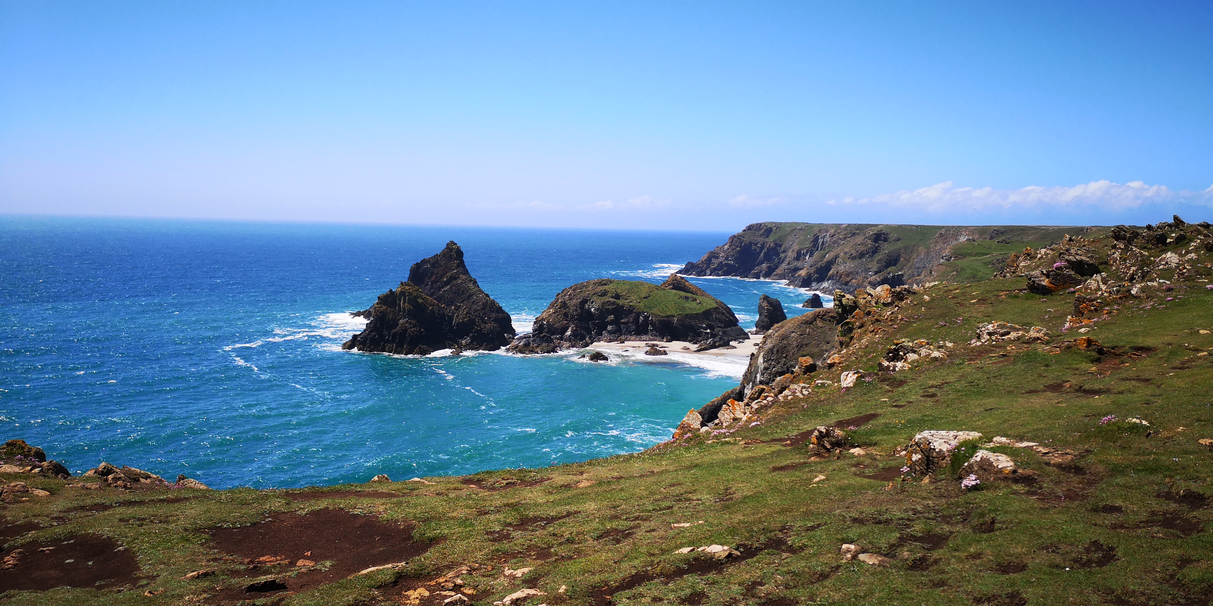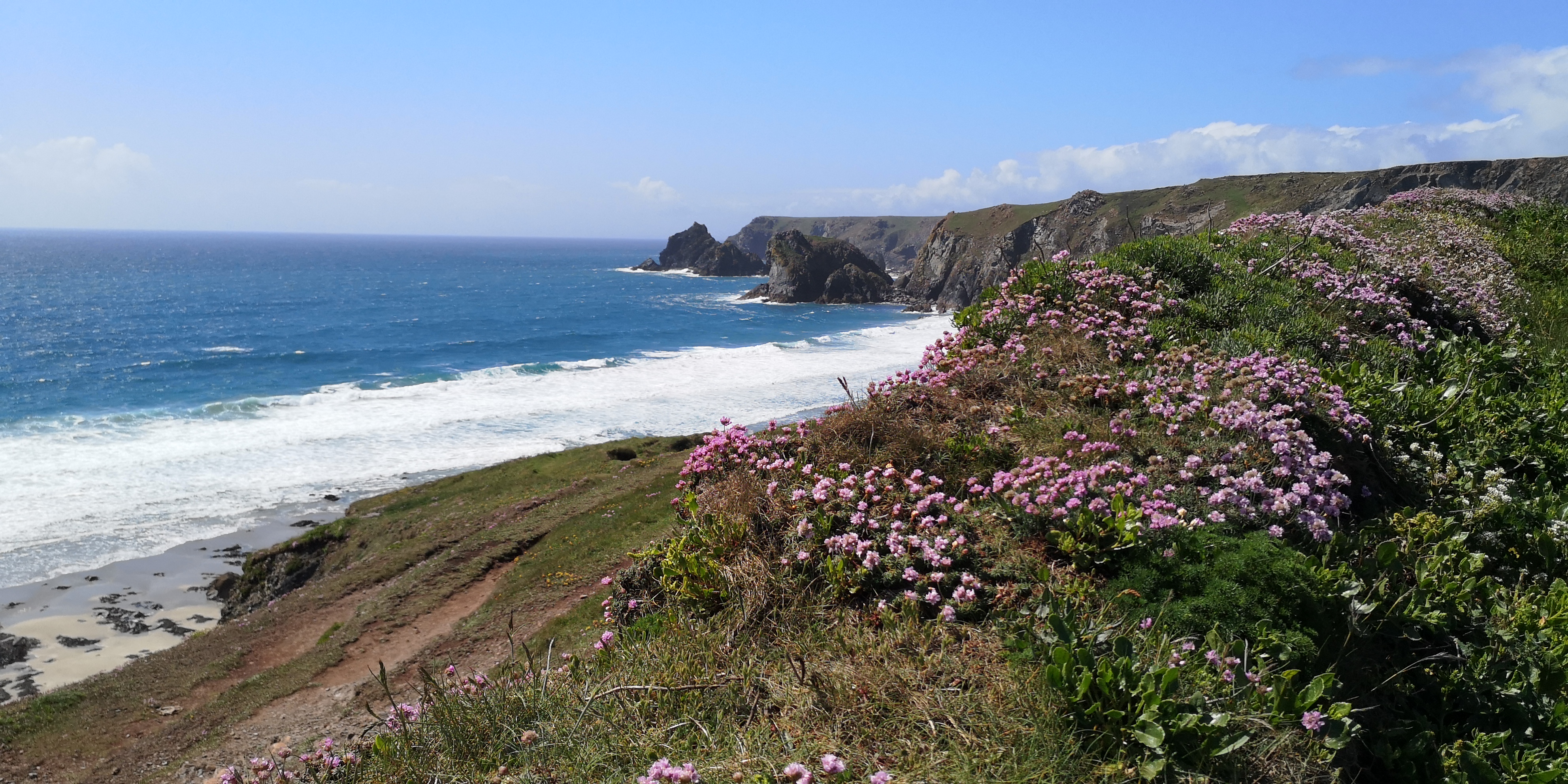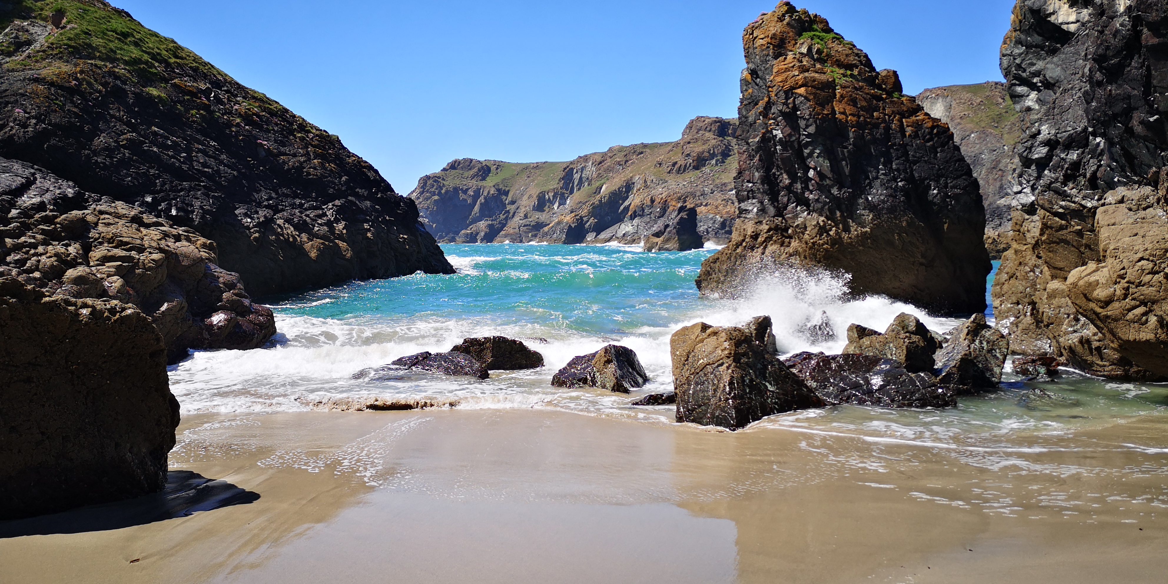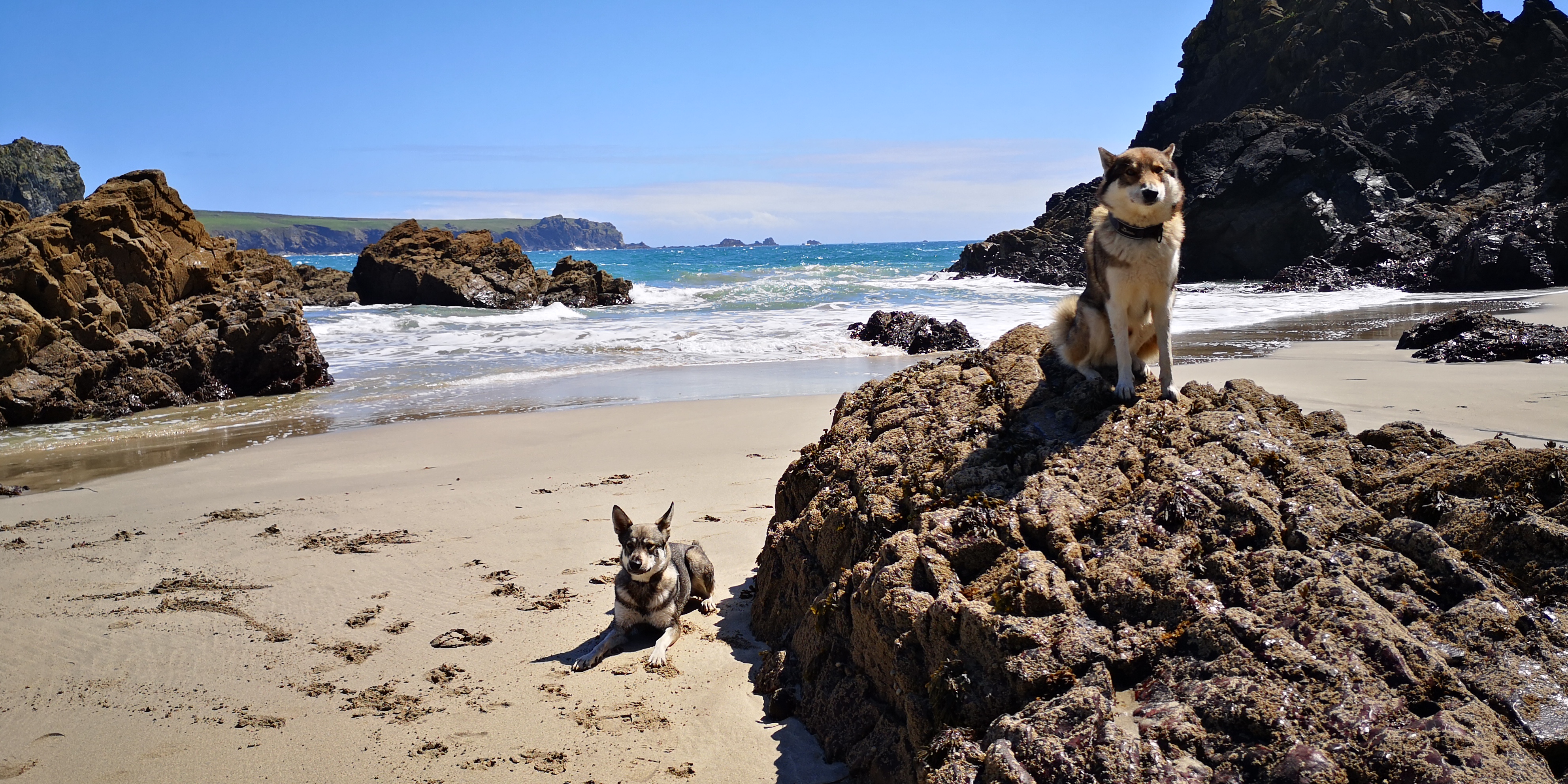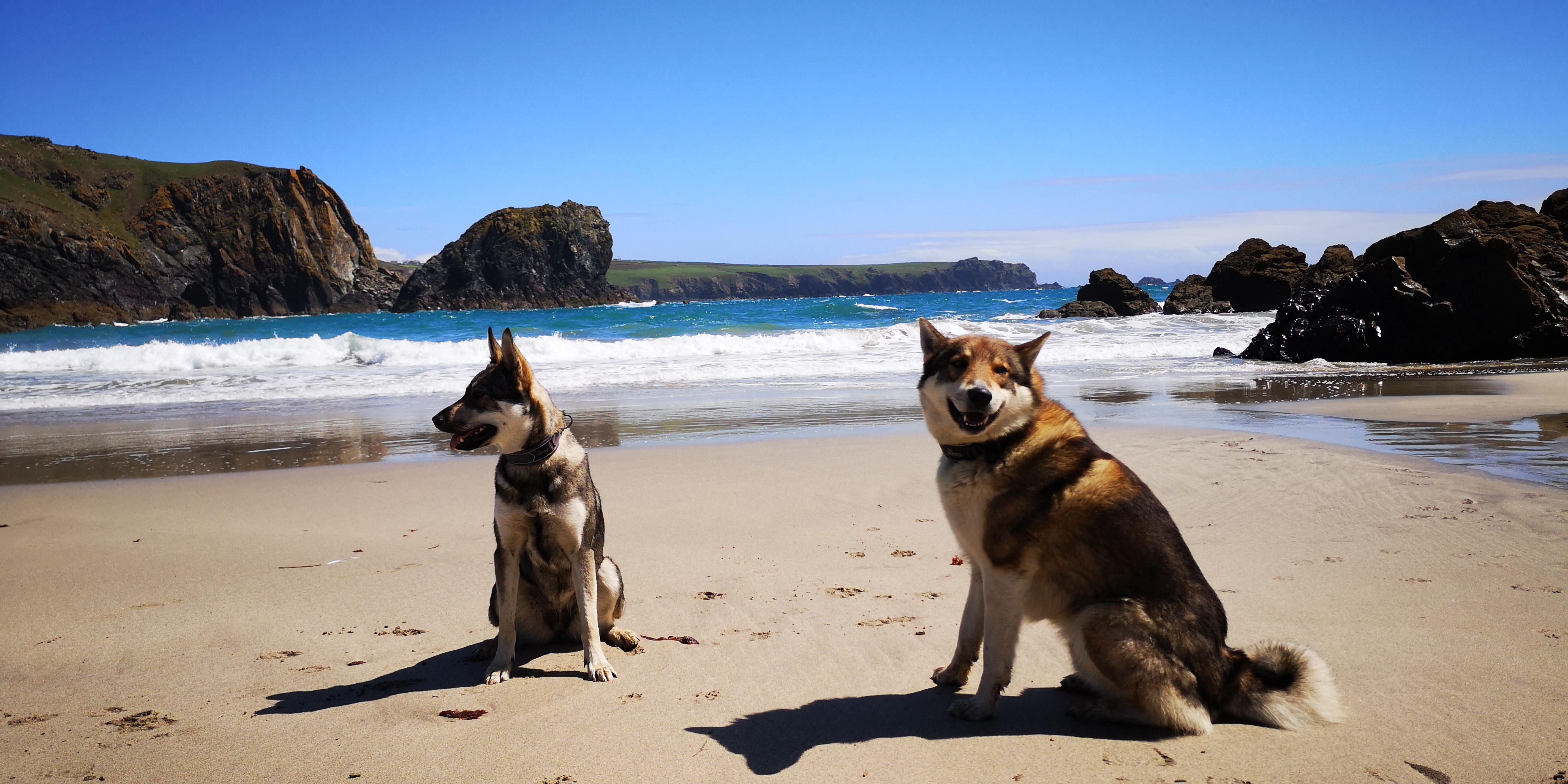 Grote golven tuimelen over elkaar heen en er staat een harde wind. De meeuwen scheren krijsend over onze hoofden en verdwijnen in de diepte achter de puntige klifwanden. Ondanks de koude wind heb ik het warm. De zon schijnt fel op ons neer. Zowel de honden als ik lopen te hijgen, terwijl we omhoog klimmen langs het South West Coast Path vanaf Lizard Point richting het zuidwesten. Het kustpad staat bekend als een van de meest afwisselende kustpadlandschappen op aarde. Na een uurtje klimmen en dalen over kleine rotspaden, opent zich een bijna mediterraans strand met goudgeel zand en turquoiseblauwe golven. Steile kliffen omgeven Kynance Cove, waardoor het verscholen blijft totdat je boven op een van de rotsen staat en de diepte inkijkt. We dalen de rotsen af tot aan het strand. Ik laat Mika en Moran van de riem, en ze rennen het water in. Met wapperende staarten klimmen ze vervolgens op de rotsen en spetteren rond in de kleine poelen die zich eromheen gevormd hebben. Toen ik vanochtend wakker werd op het bedrijventerrein, waar ik noodgedwongen de nacht doorbracht omdat ik even geen andere plek kon vinden, twijfelde ik of het nog wel zin had om verder naar het zuidwesten van Engeland te rijden, omdat de toeristische drukte alleen maar zou toenemen en ik waarschijnlijk helemaal geen overnachtingsplek zou vinden. Nu sta ik met mijn ogen op de zee gericht, en voel alleen maar dankbaarheid en blijdschap. De bus staat op een parkeerplaats bij Lizard Point met uitzicht op de zee. Wat zullen we goed slapen vannacht.