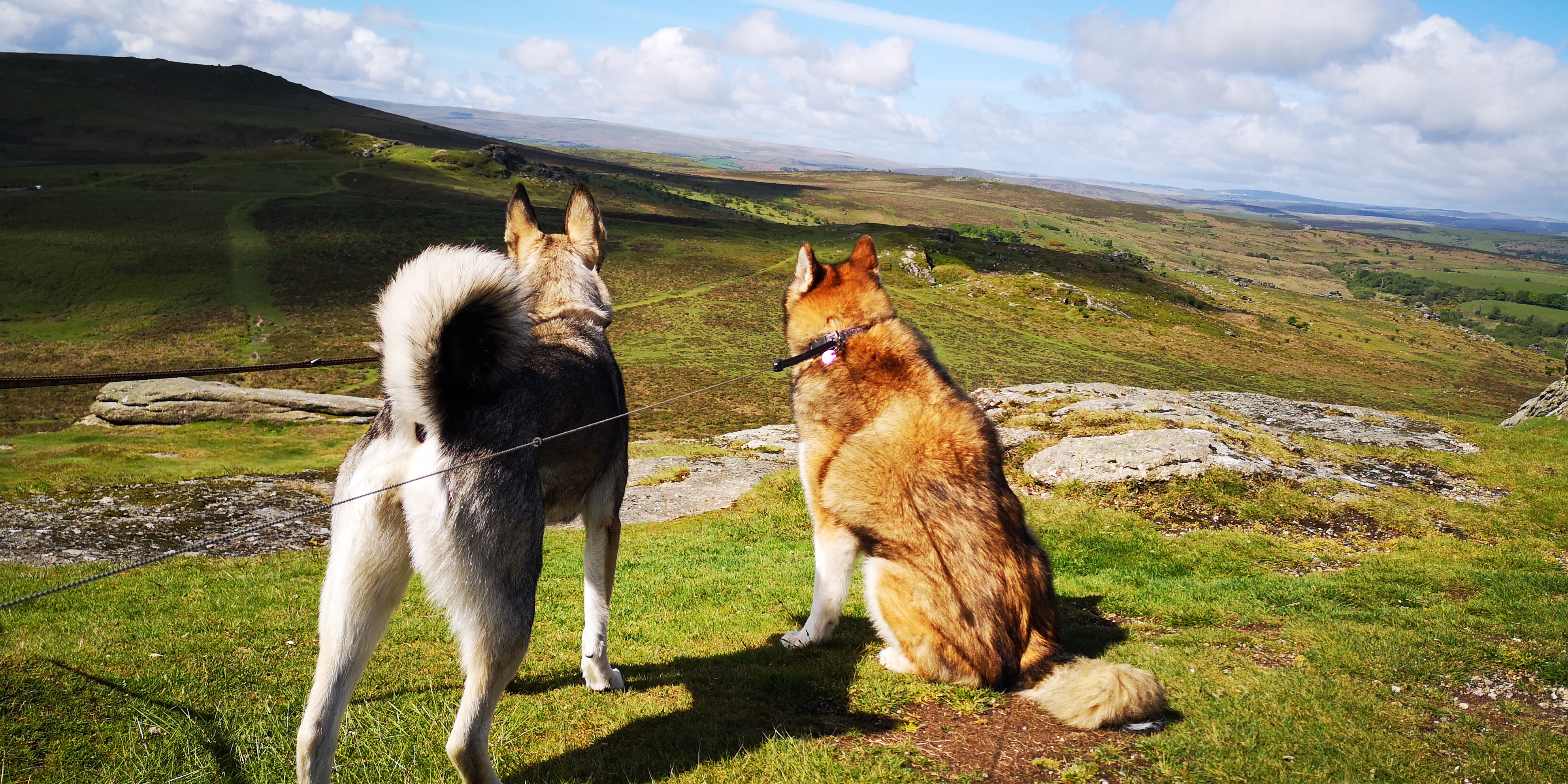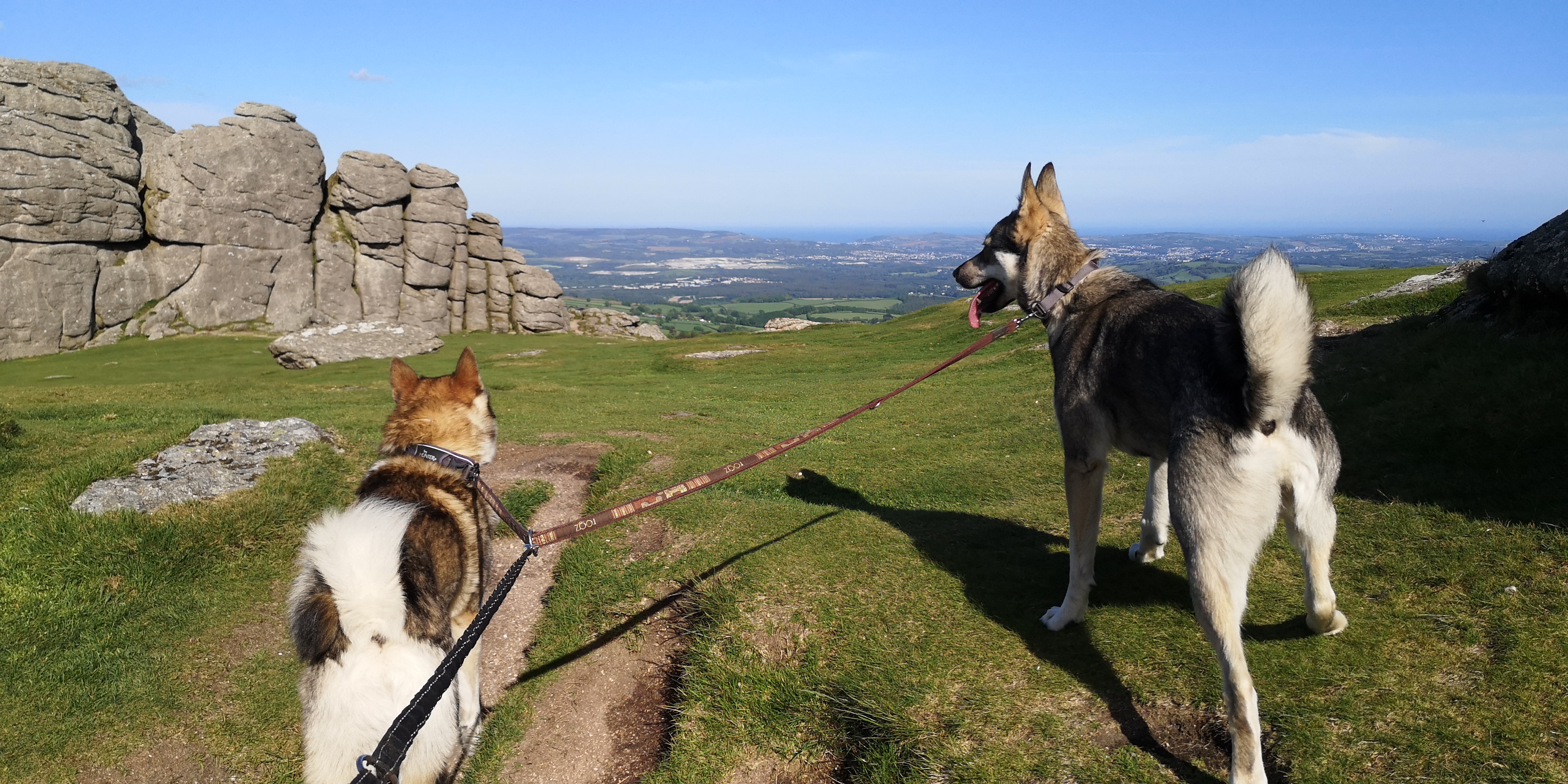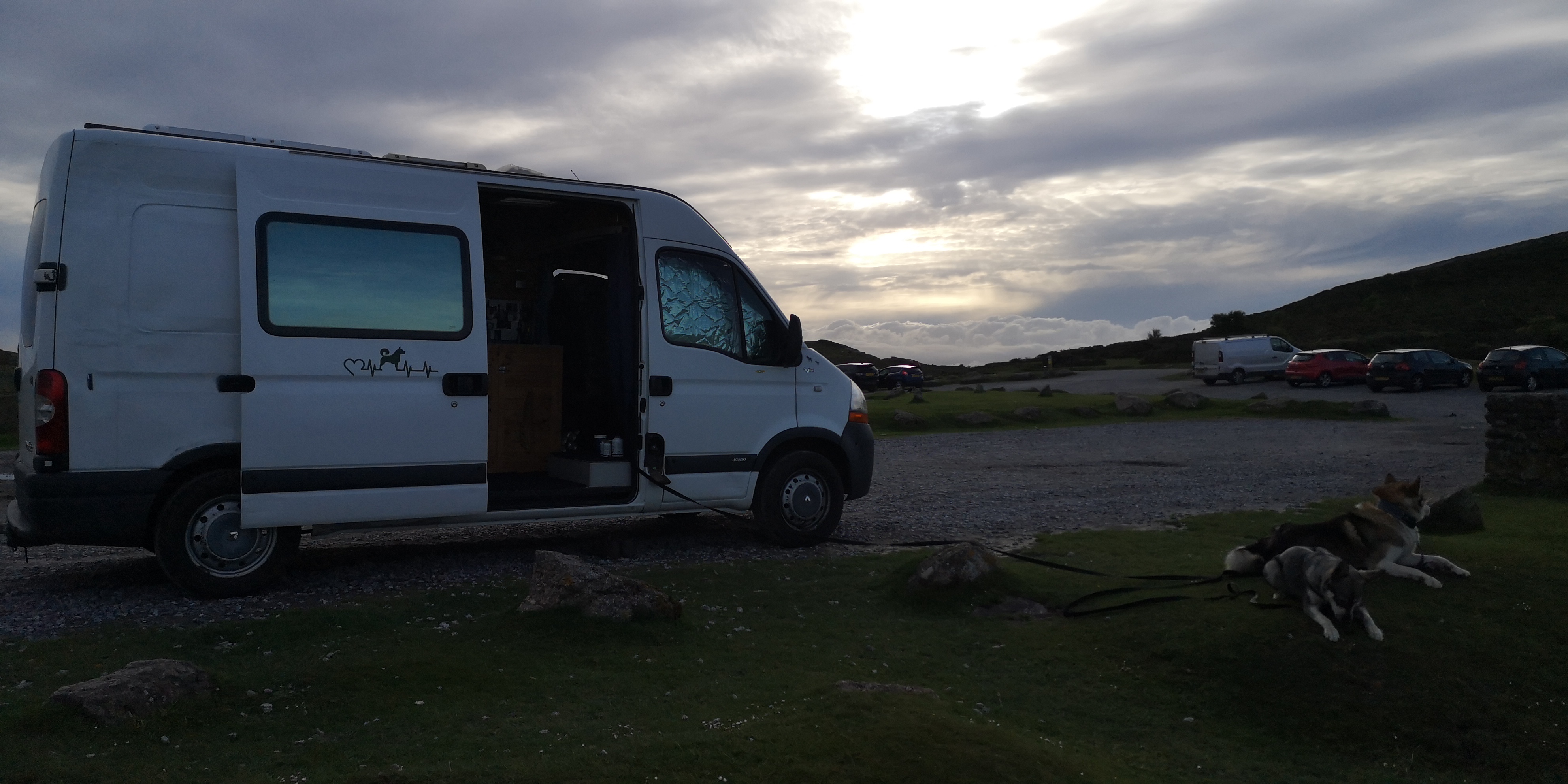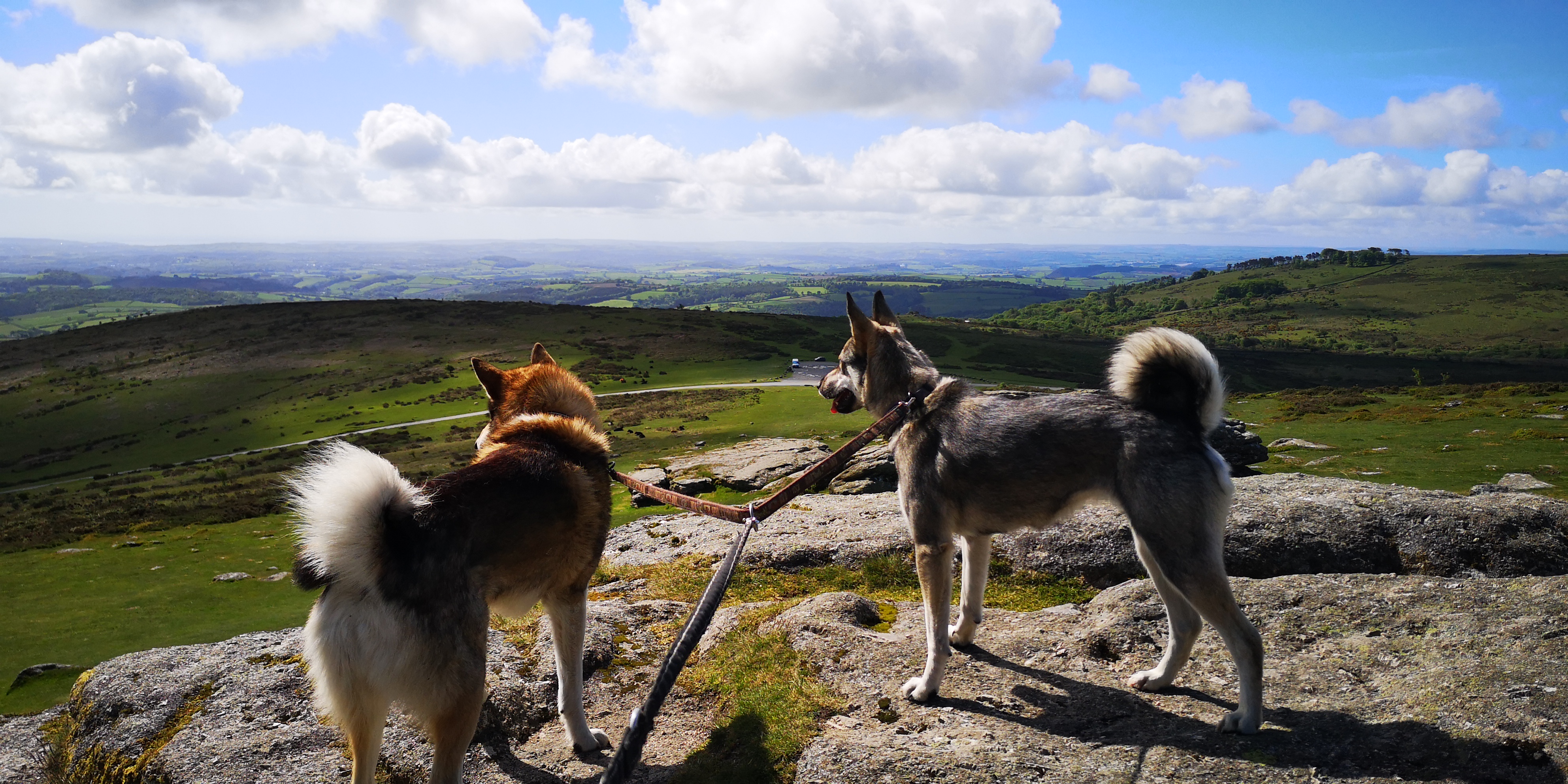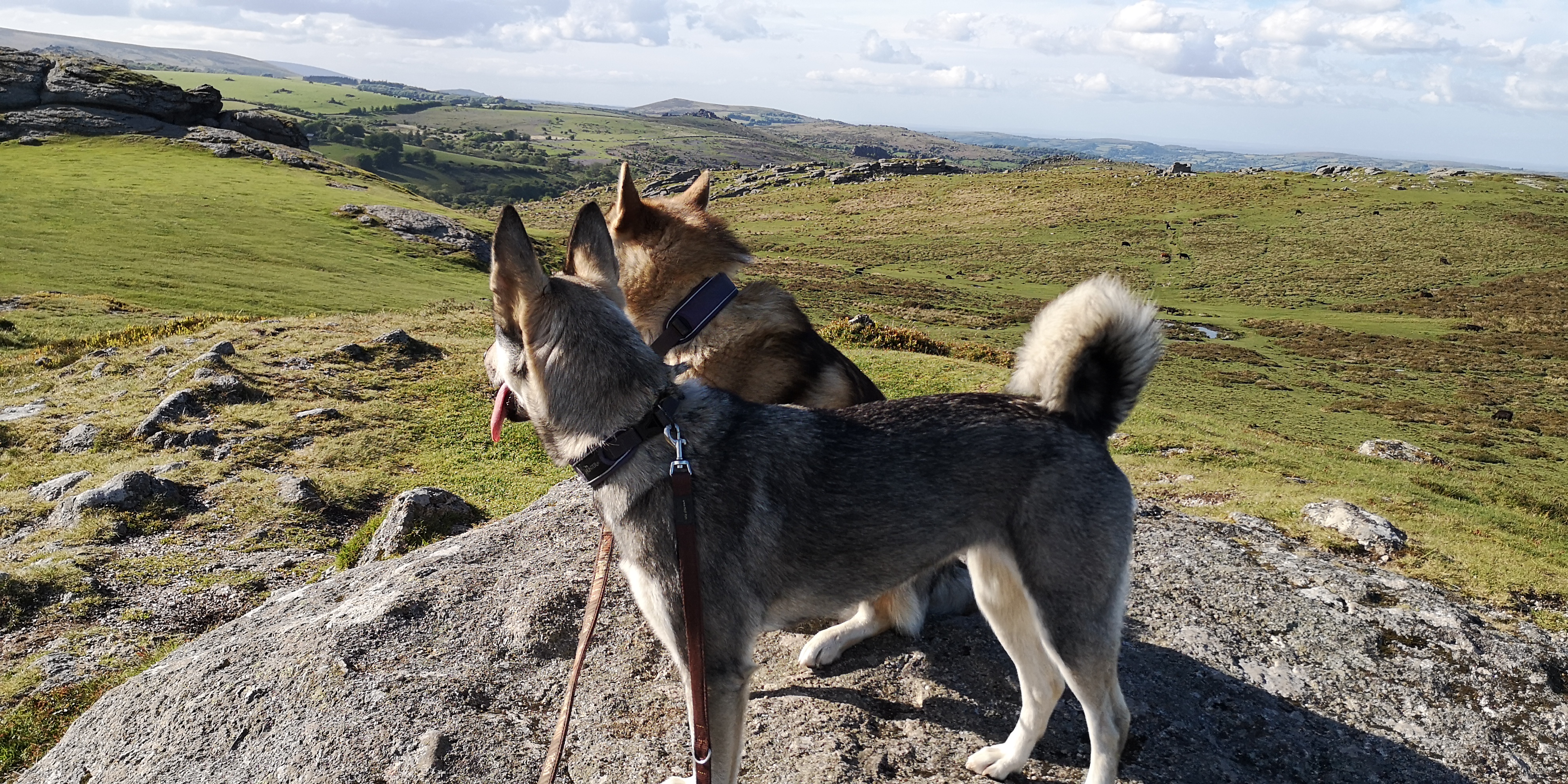 We zijn vanochtend vroeg vertrokken. Al snel zien we vanaf de weg de grijsblauwe zee achter de heuvels van het graafschap Devon verschijnen. Kleine dorpjes liggen in het dal en aan de kust. Talloze weggetjes kronkelen zich door het landschap. Na een halfuurtje rijden we landinwaarts en kijken we uit over de grote stukken bosheide van New Forest National Park. Het laatste stuk klimmen we omhoog naar Haytor Rocks, een granieten tor aan de oostelijke rand van Dartmoor National Park. Om tien uur ’s ochtends staat er maar een handjevol auto’s op de parkeerplaats, en ik parkeer de bus met het zicht op het dorpje Haytor Vale in het dal. We staan op een hoogte van ruim vierhonderd meter en het uitzicht is fenomenaal. Samen met de drie honden klimmen we het kleine stukje naar boven tot aan de tor. Er staat een koude wind. Dat doet Marte zichtbaar goed, en ze staat fier met haar neus in de wind. Voor ons strekt zich een tapijt aan groen uit, enkel onderbroken door stenen muurtjes en donkergroene struiken met scherpe doornen en gele bloemetjes. Grote stenen liggen verspreid door het graslandschap. De madeliefjes staan in bloei en de leeuwerikken kwetteren er lustig op los. Een eenzaam boompje groeit uit een rotsspleet, en trotseert daarmee de ruige en vaak zware strijd tegen de elementen van de natuur. Koeien en paarden lopen er vrij rond. Ik voel me vrij.