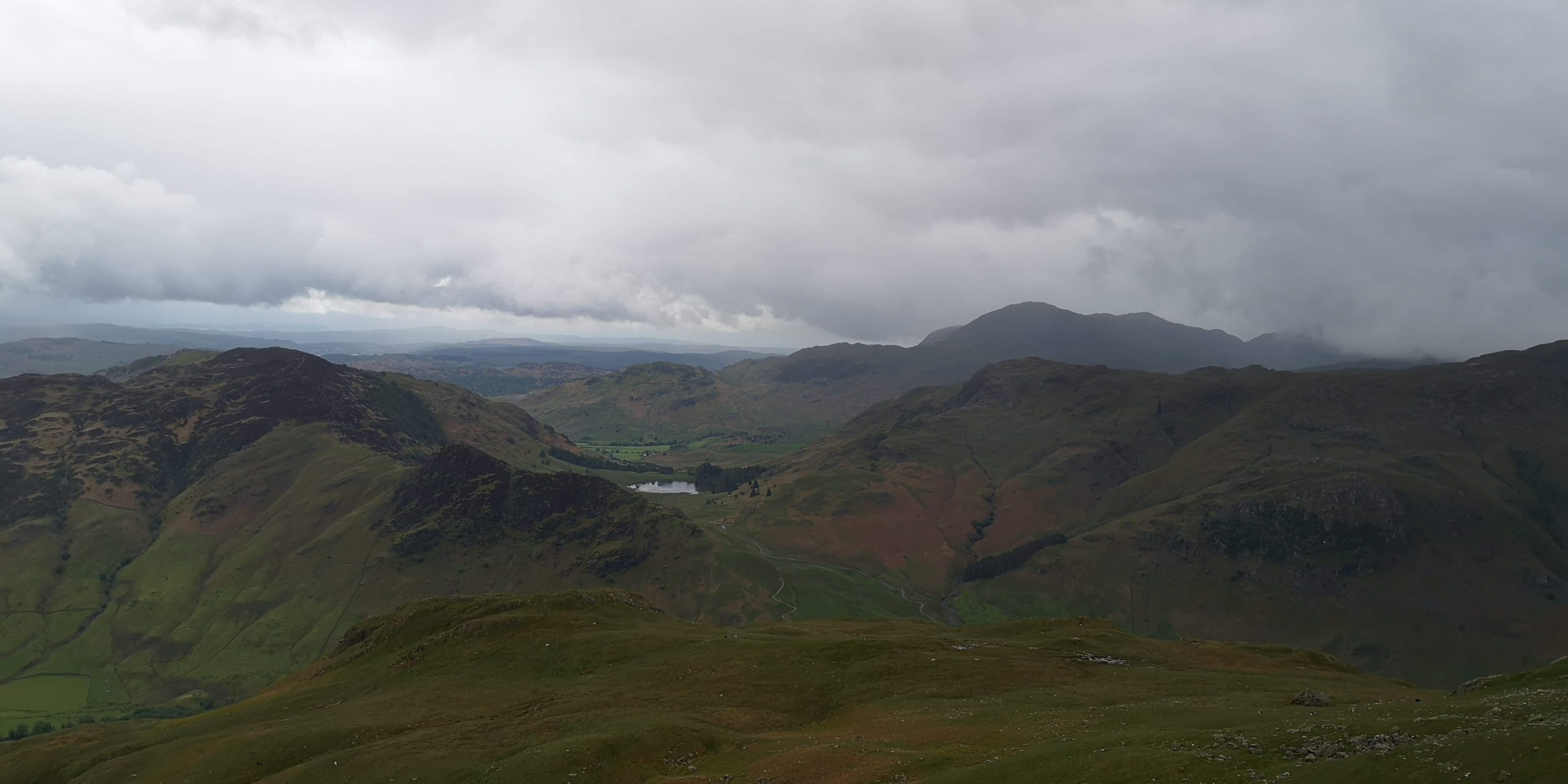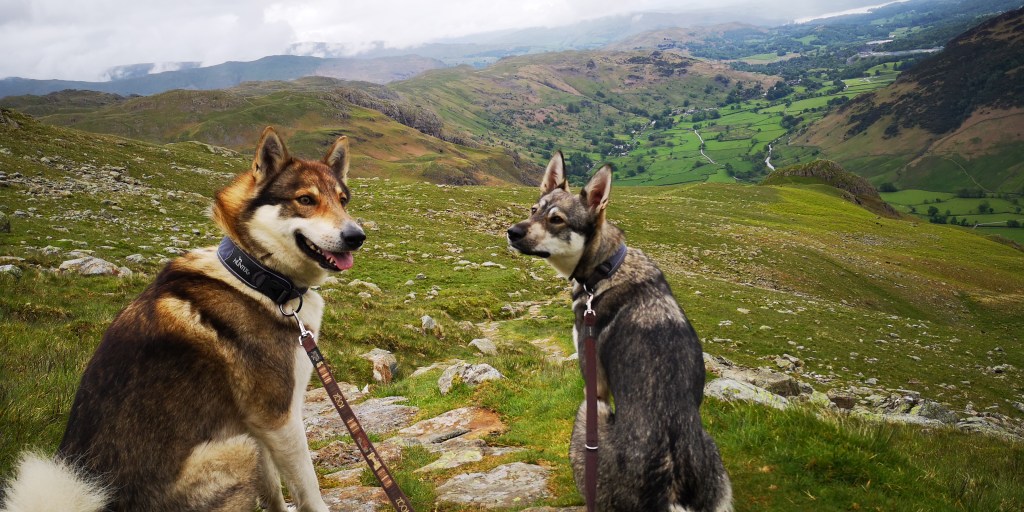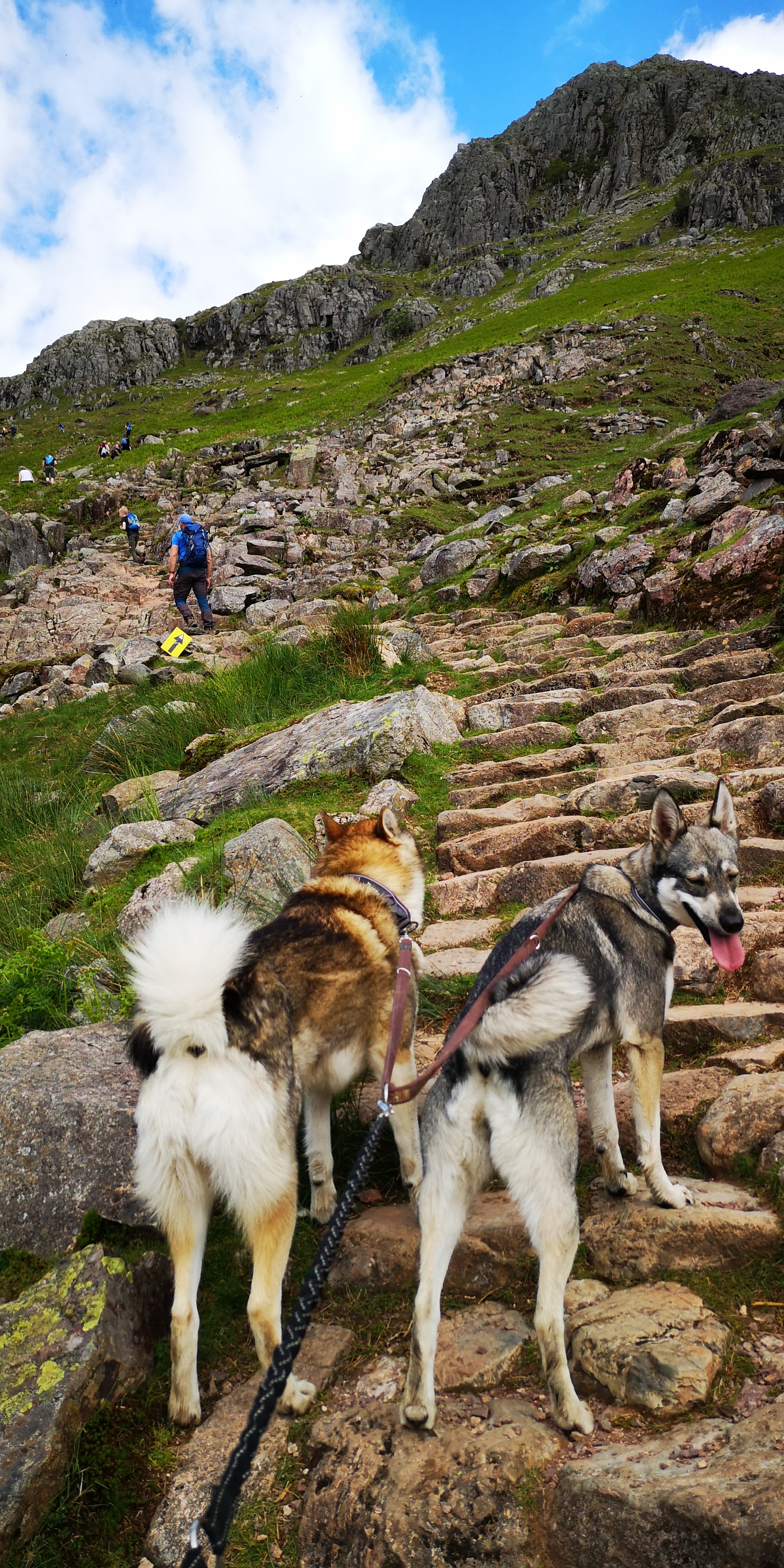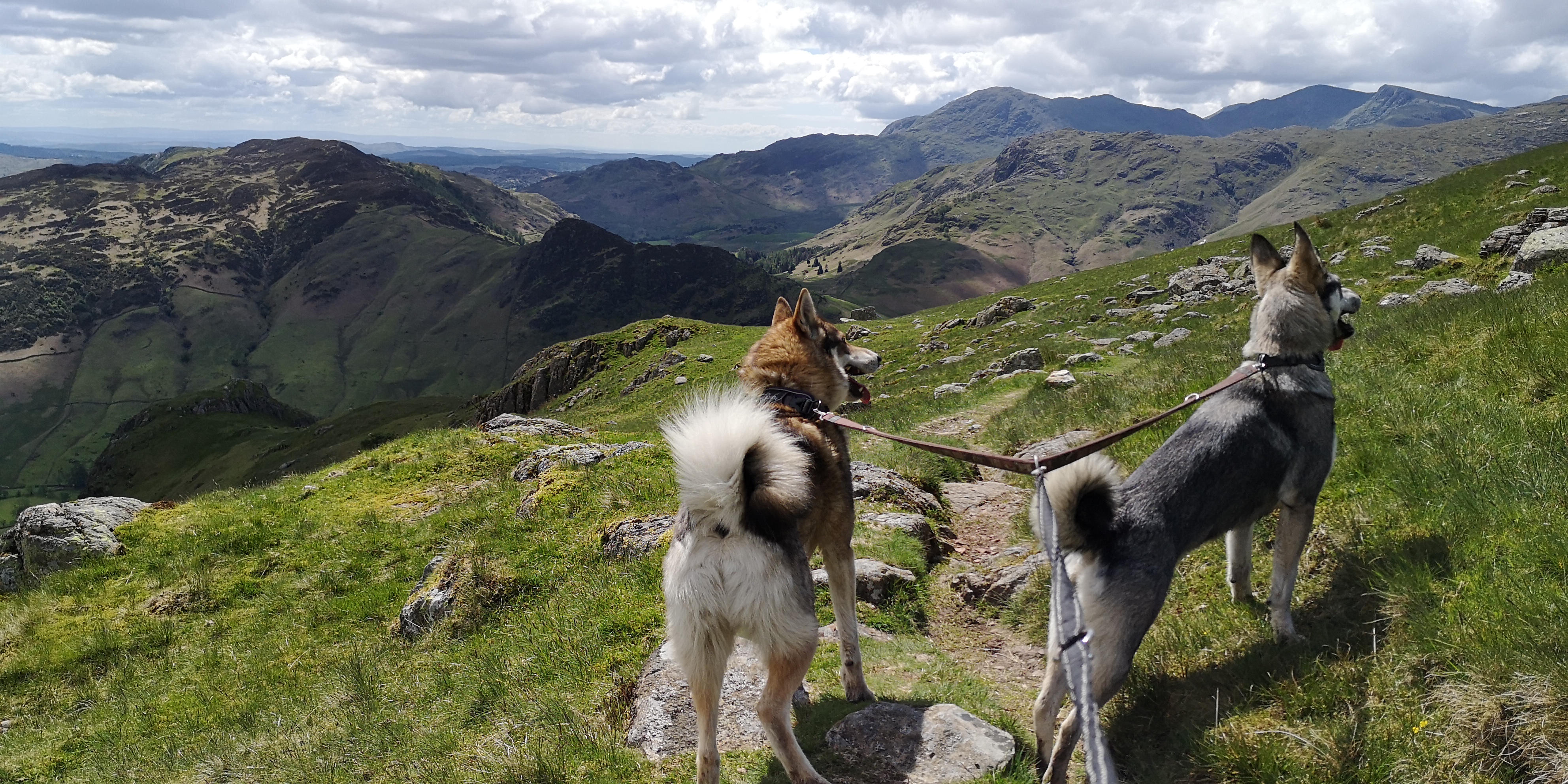 Het regent lichtjes, maar we gaan toch nog even de bergen in op onze laatste dag in Lake District. We klimmen steil omhoog langs glibberige stenen en rotsen. De wolken hangen laag over de bergtoppen, en de lucht voelt een beetje bedompt. Even verderop horen we het geruis van een riviertje, dat langs de rotsen de berg afstroomt. Mika en Moran stomen vooruit, en trekken mij mee aan de heupriem. We gaan tot aan de rotskam. ‘Dit wordt echt te steil voor jou,’ zeg ik tegen Moran. Mika zou die grote sprongen nog kunnen nemen, maar met een soms nog onvoorspelbare Moran durf ik niet verder te gaan. We keren om en lopen naar beneden met een 360 graden panorama aan bergen om ons heen.