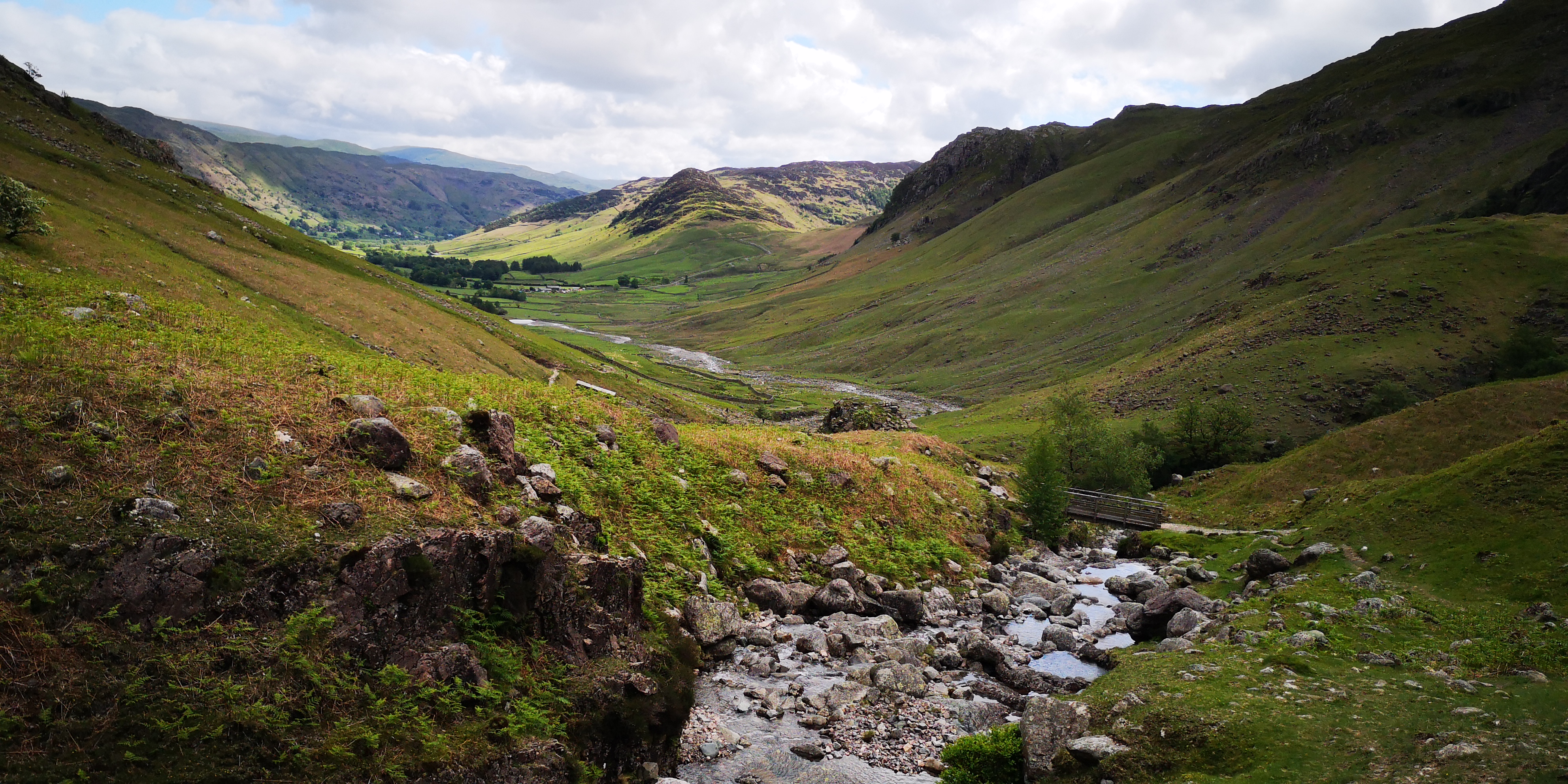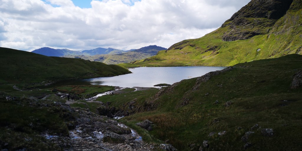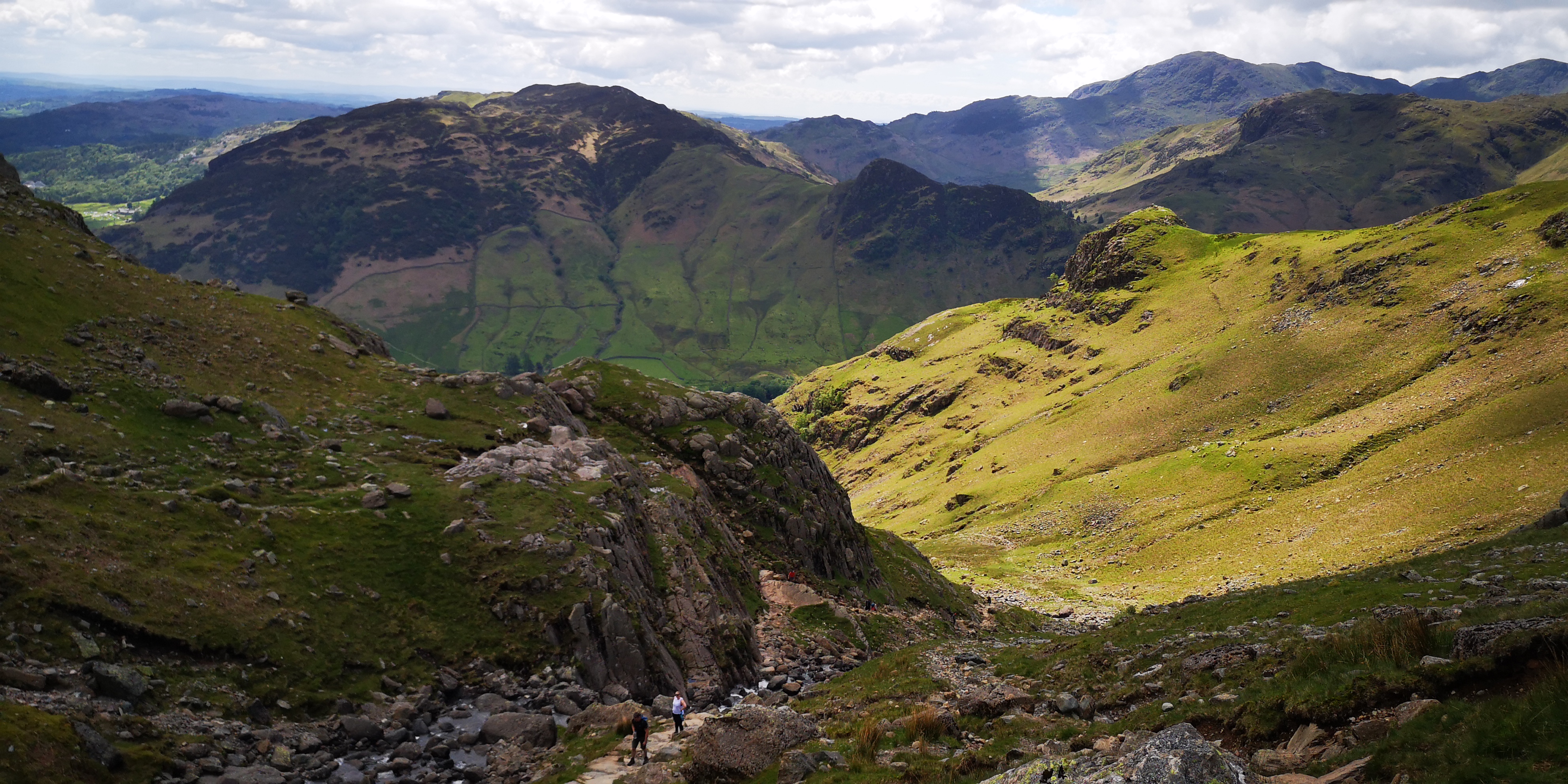 Met elke stap die we zetten ontvouwt zich een nieuw berglandschap voor ons. Achter elk rotspunt volgt een ander rotspunt, en klimmen we verder langs de Stickle Tarn Trail, de dag nadat we zijn aangekomen in het park. Naast ons horen we het geruis van een snelstromende rivier, die af en toe ontaardt in een waterval. De stenen op de bodem zijn goed te zien in het heldere water. Mika en Moran drinken uit de poelten, die zich onder de watervallen vormen. We springen van steen naar steen. Af en toe kijk ik achterom en tuur naar beneden in de vallei Lingmoor. Kleine boerderijen liggen her en der verspreid. Na een uurtje bereiken we Stickle Tarn, een helder bergmeer omgeven door stenen oevers. We lopen door langs de flanken van Harrison Stickle en Thor Crag. Er loopt een stenen pad steil langs de bergwand omhoog. Ik ontwaar kleine figuurtjes, die in vertraagde pas naar boven klimmen. Hoe graag ik ook nog verder zou willen gaan, het is niet verantwoord naar Moran toe. Ze is net een jaar oud, en ik vind dat dit fysiek en mentaal nog teveel van haar vraagt. In plaats daarvan laten we ons opwarmen in de zon aan het meer.