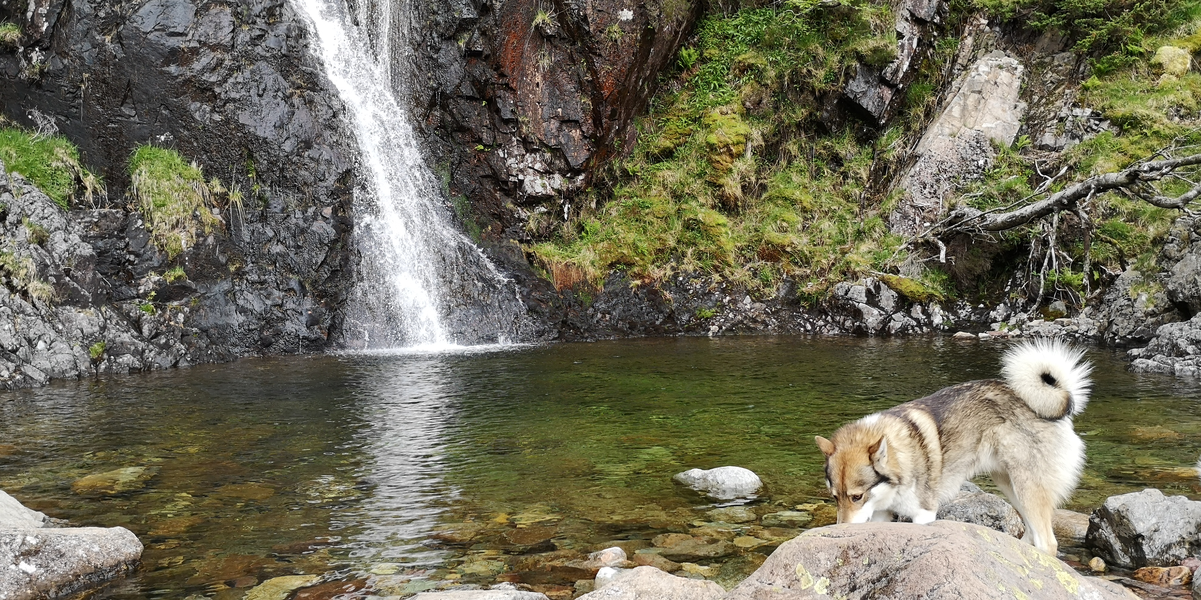 ‘Lopen we nog wel goed,’ vraag ik me af, terwijl we dwars over het erf van een boerderij lopen. Het is een oude boerderij gebouwd uit natuurstenen, net zoals de lage muurtjes, die de weides eromheen markeren. Vanuit een donkere stal hoor ik blatende lammetjes en er blaft ergens een hond. De wandelbordjes geven gelukkig goed aan welke kant we op moeten. We sluiten een laatste hek achter ons, en lopen verder over een stenen pad de heuvel op. Voor onze tweede volledige dag in Lake District heb ik een route gepland die onder langs de Scafell Pike en de Great Gable loopt. Het is een pittige rondwandeling van, ik schat, rond de vier uur. De Scafell Pike is met een hoogte van 978 meter de hoogte bergtop van Engeland. We zullen lang niet de top halen, want het laatste stuk bestaat uit grote stenen en zou ons minstens zes uur kosten om te bereiken. Ik lees dat er niet alleen mensen, maar ook honden met enige regelmaat van de berg worden gered. Ik zie het al voor me dat ik samen met de kleine drukke Moran en de overrompelde Mika met een helikopter van de berg moet worden afgetakeld. We klimmen gestaag omhoog langs een rivier dat nogal wisselt in grootte en veel aftakkingen heeft. We doorkruisen het water meedere keren, waarbij ik de honden van de heupriem laat, zodat we van steen naar steen kunnen springen. In de verte hoor ik het ruisen van een waterval, en even later komt deze in zicht. Het water stroomt over een richel tientallen meters boven ons, en we voelen de kou ervanaf komen. Mika en Moran springen rond in het water onderaan de waterval. De stenen poel laat een gloed van doorzichtig emarald groen zien, dat weerkaatst in de vroege ochtendzon. De waterval is omgeven door steile hellingen, en ik zie niet waar het pad zijn weg vervolgt. Ik kijk vertwijfeld om me heen. ‘Nou jongens, ik zie maar één weg uit deze kloof, en dat is het pad waarlangs we gekomen zijn. Een beetje teleurgesteld koppel ik de honden aan de riem en we lopen het pad naar beneden. Vlak voordat we bij de boerderij zijn, zie ik een pad naar links afbuigen. Verdorie zeg, die hadden we dus moeten hebben. Ik twijfel even op de kruising of we alsnog weer omhoog zullen klimmen, maar we hebben er al ruim twee uur opzitten, en dat vond ik genoeg voor Moran. Morgen is weer een dag.
