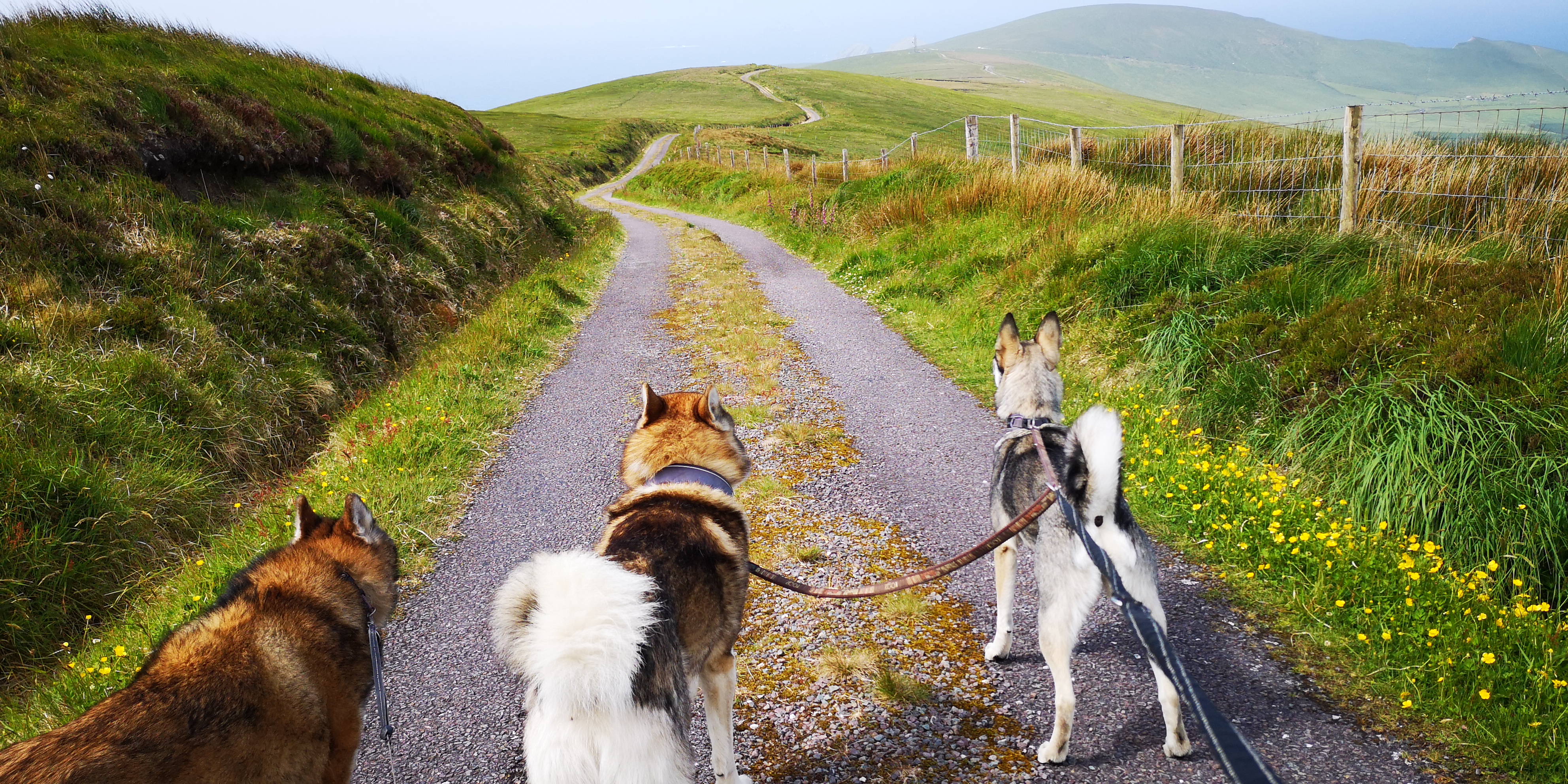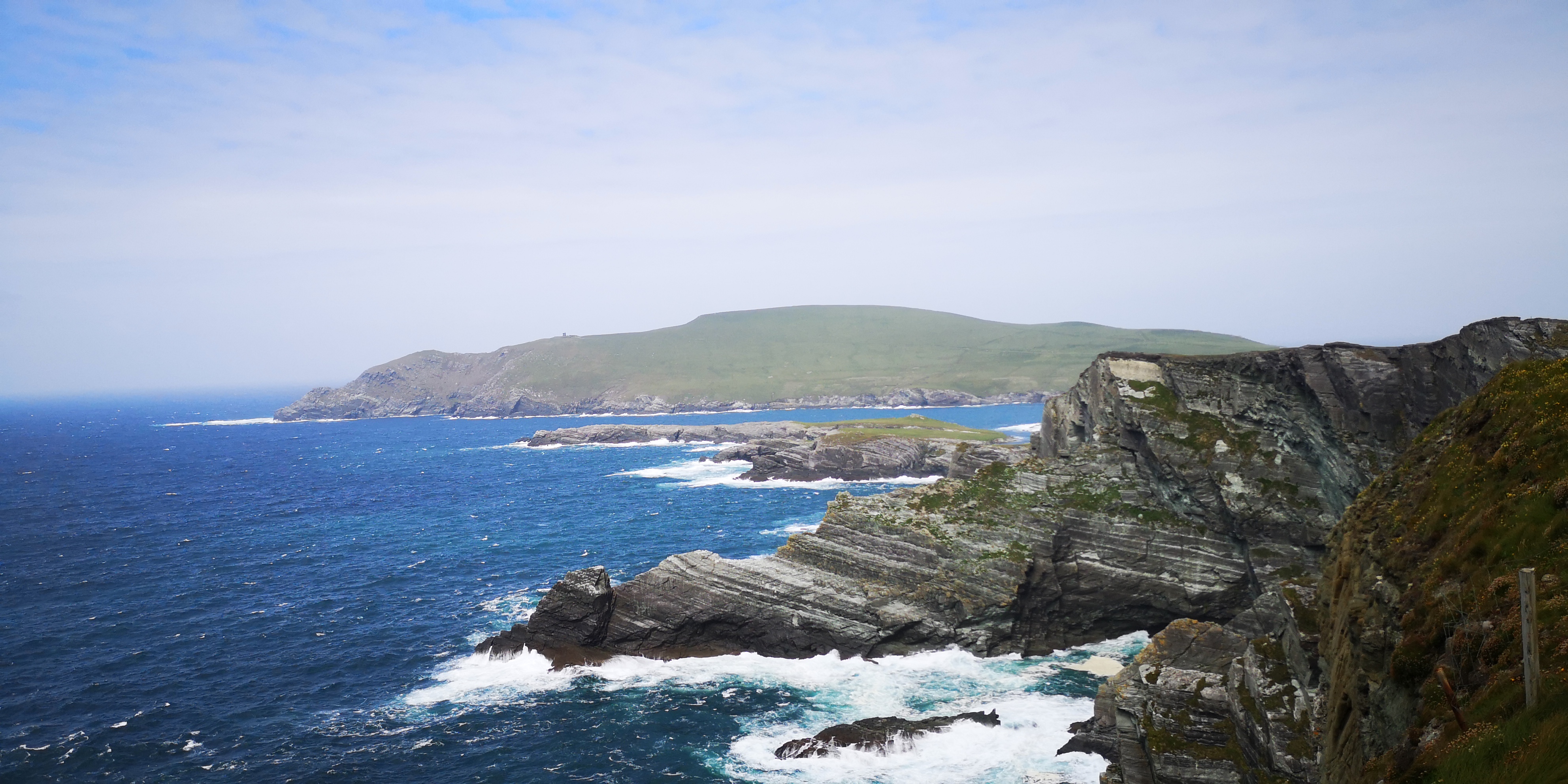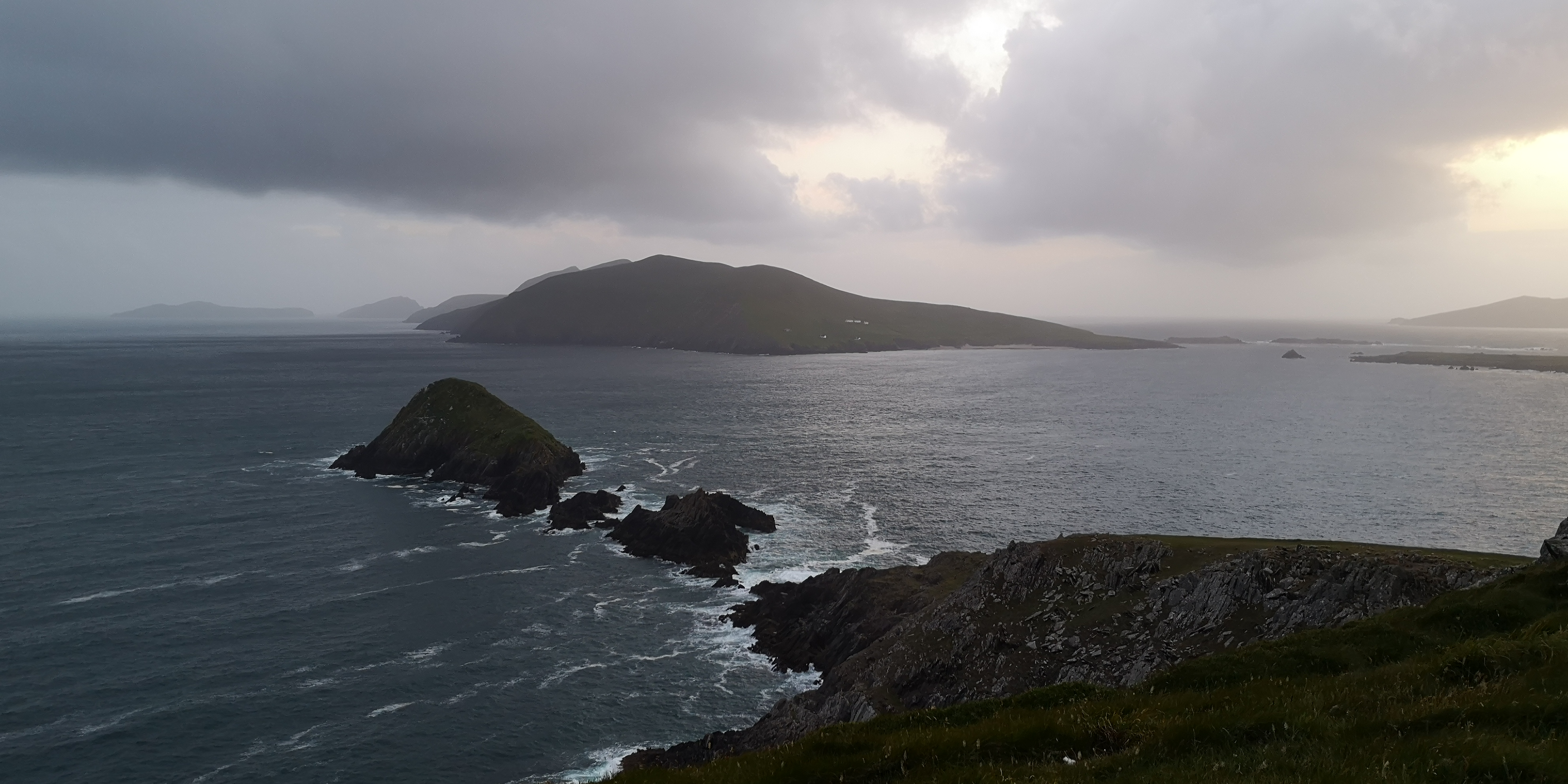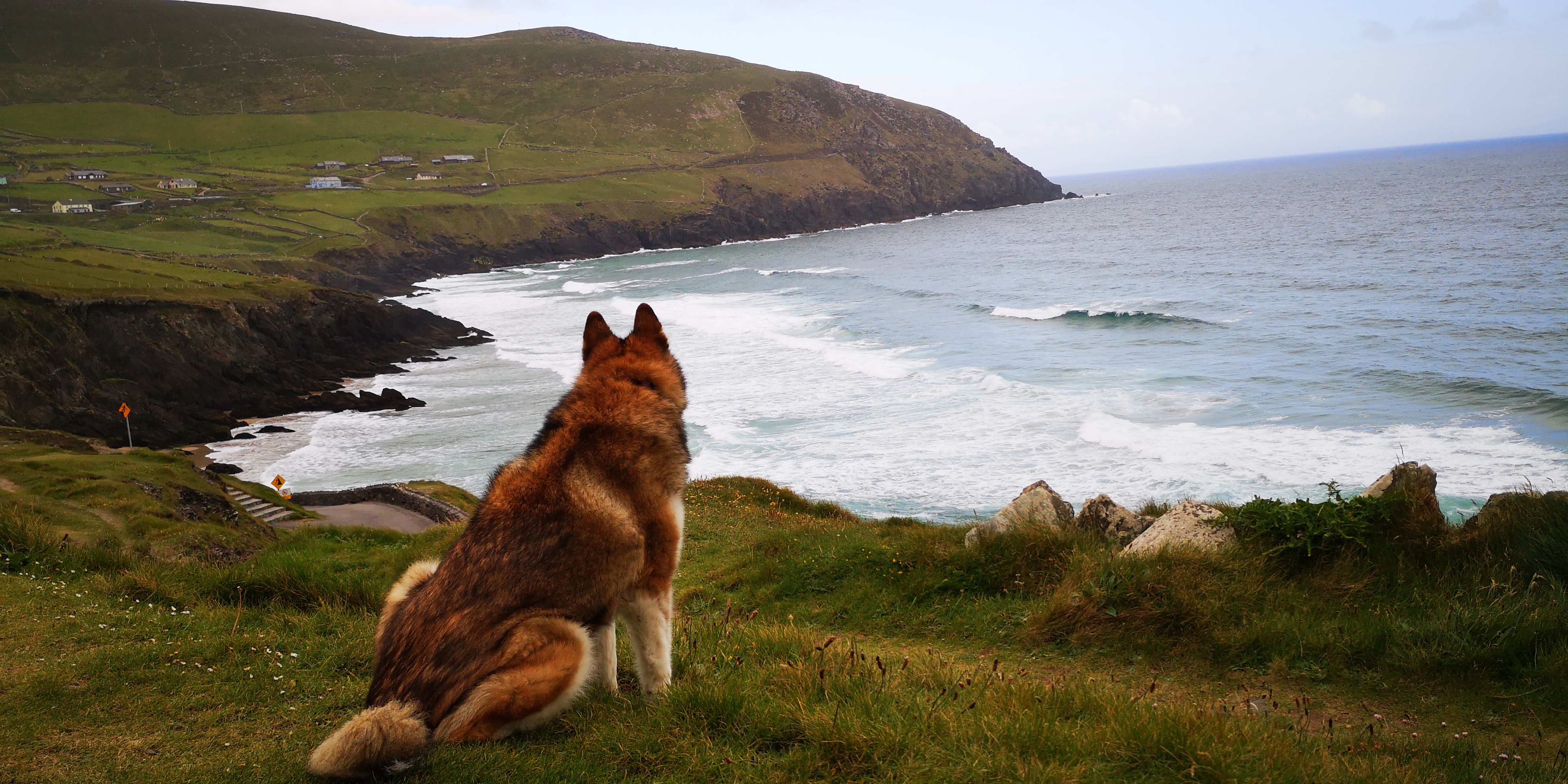 Vlak voordat we bij Kerry Cliffs aankomen, stop ik aan de Skellig Ring bij nog een Wild Atlantic Way Discovery Point. Ik ga er vanuit dat het vrij toeristisch is bij Kerry Cliffs, dus ik kan maar beter eerst hier een wandeling mef de honden maken. We klimmen tot tot bovenop de heuvel, en hebben vanaf daar een mooi uitzicht op de kustlijn rondom Kerry Cliffs en zien zelfs een groot gedeelte van Valantia Island liggen.
