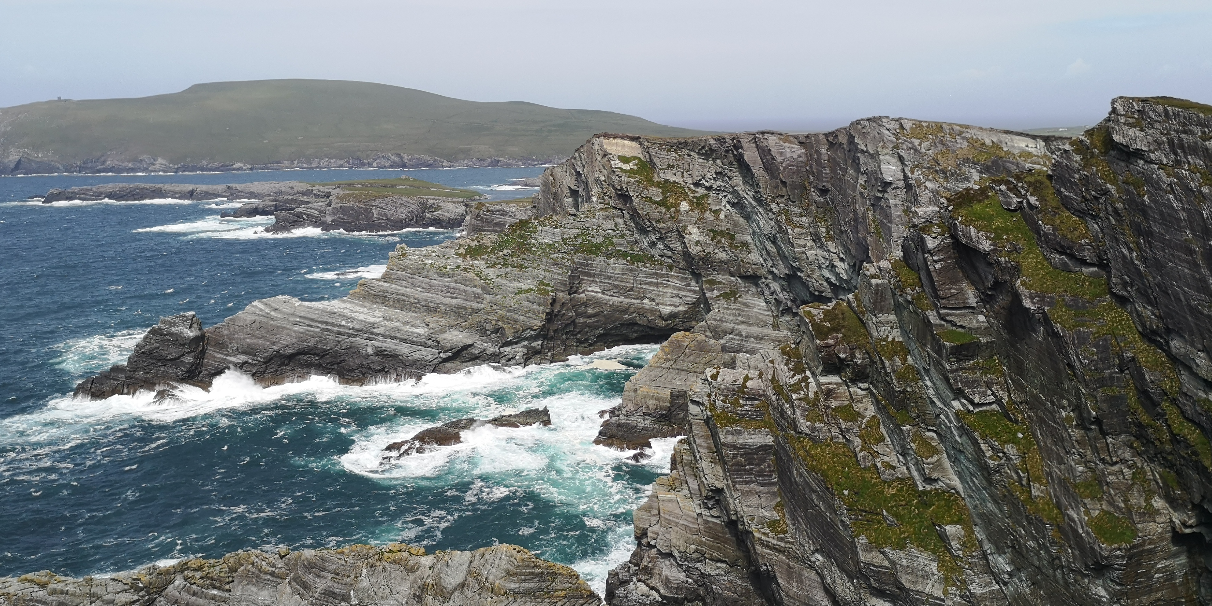 Kerry Cliffs blijkt ook weer onder particulier bezit te vallen. Een kaartje kost vijf euro. Voor vijftien euro mag je er ook blijven overnachten op het terrein. Er staan toiletten, en een karretje dat zelfgebakken scones en wat snoep verkoopt. De grijswitte gelaagde kliffen tornen op meer dan honderd meter boven de zee uit. Groene grassen groeien tussen de lagen. Boven de harde wind hoor ik de golven stuk slaan op de lange stenen uitlopers, die langzaam in de zee lijken te verdwijnen. Erboven vliegen de krijsende meeuwen. In een duikvlucht scheren ze langs de kliffen omlaag. Ik zweef mee op de wind en de golfslag van de zee.