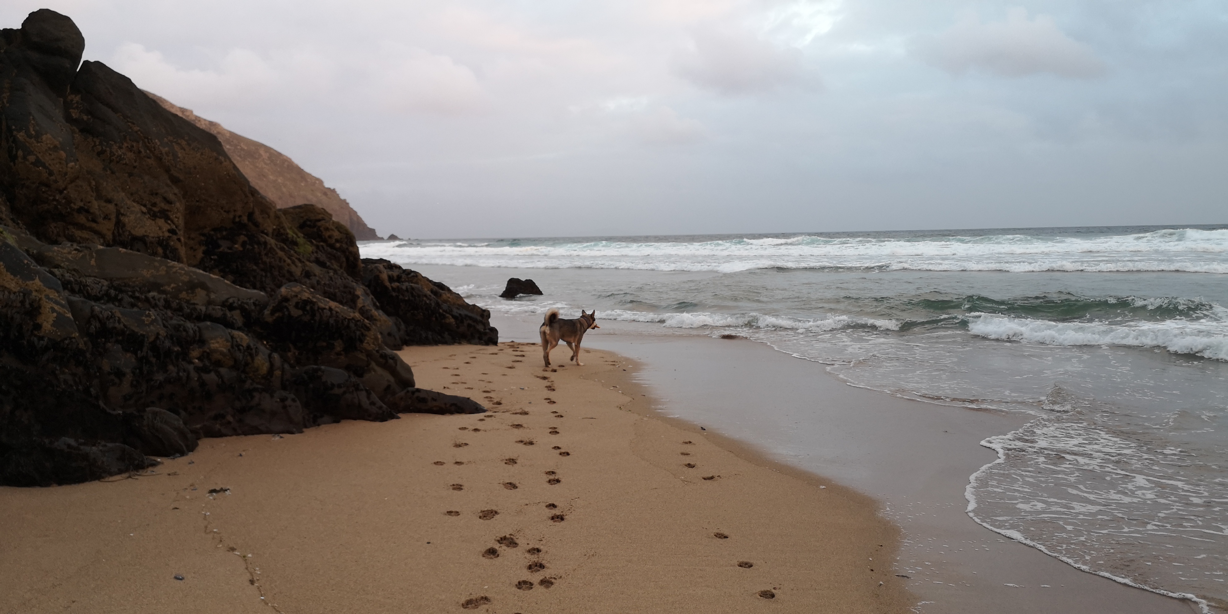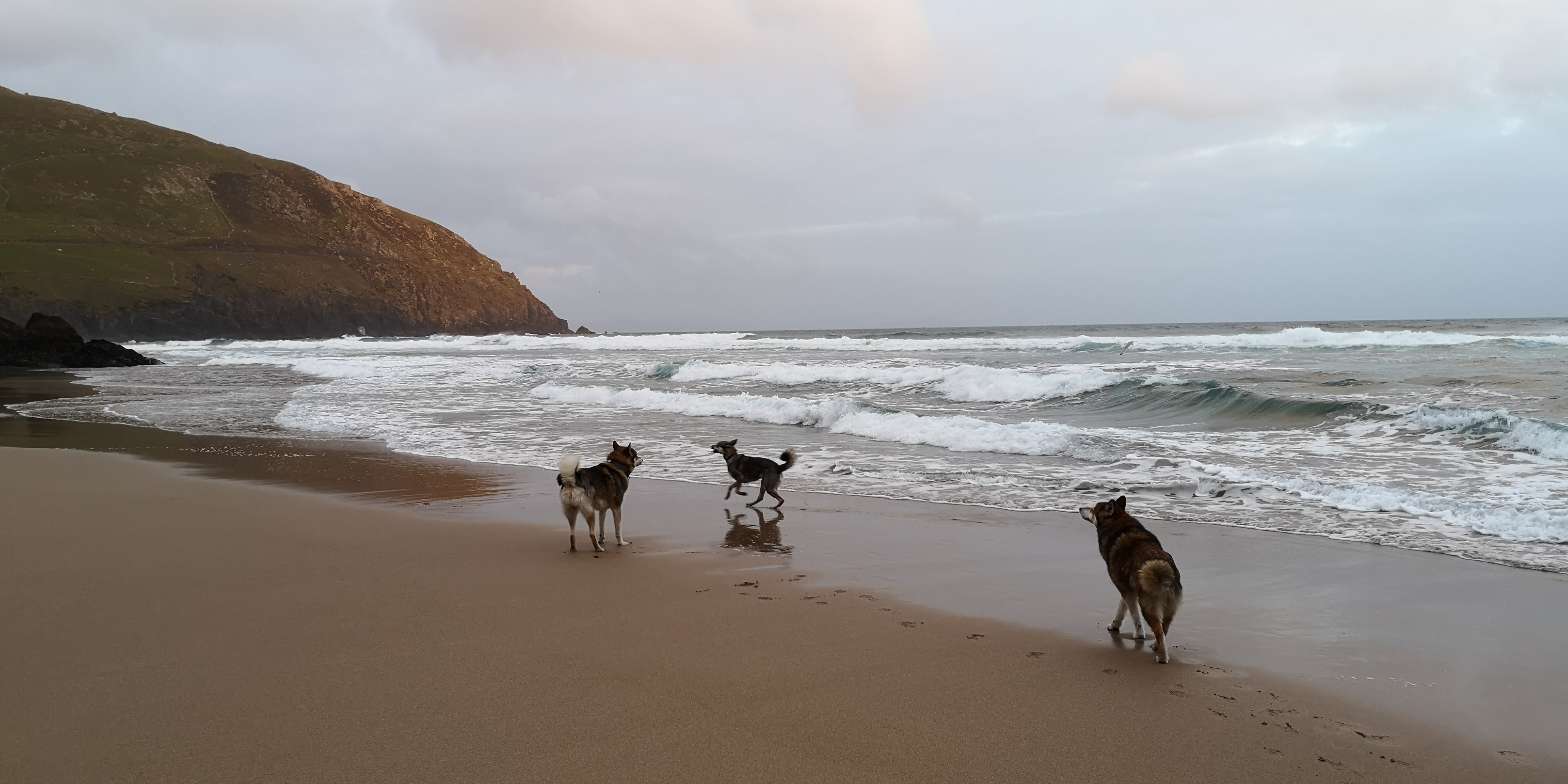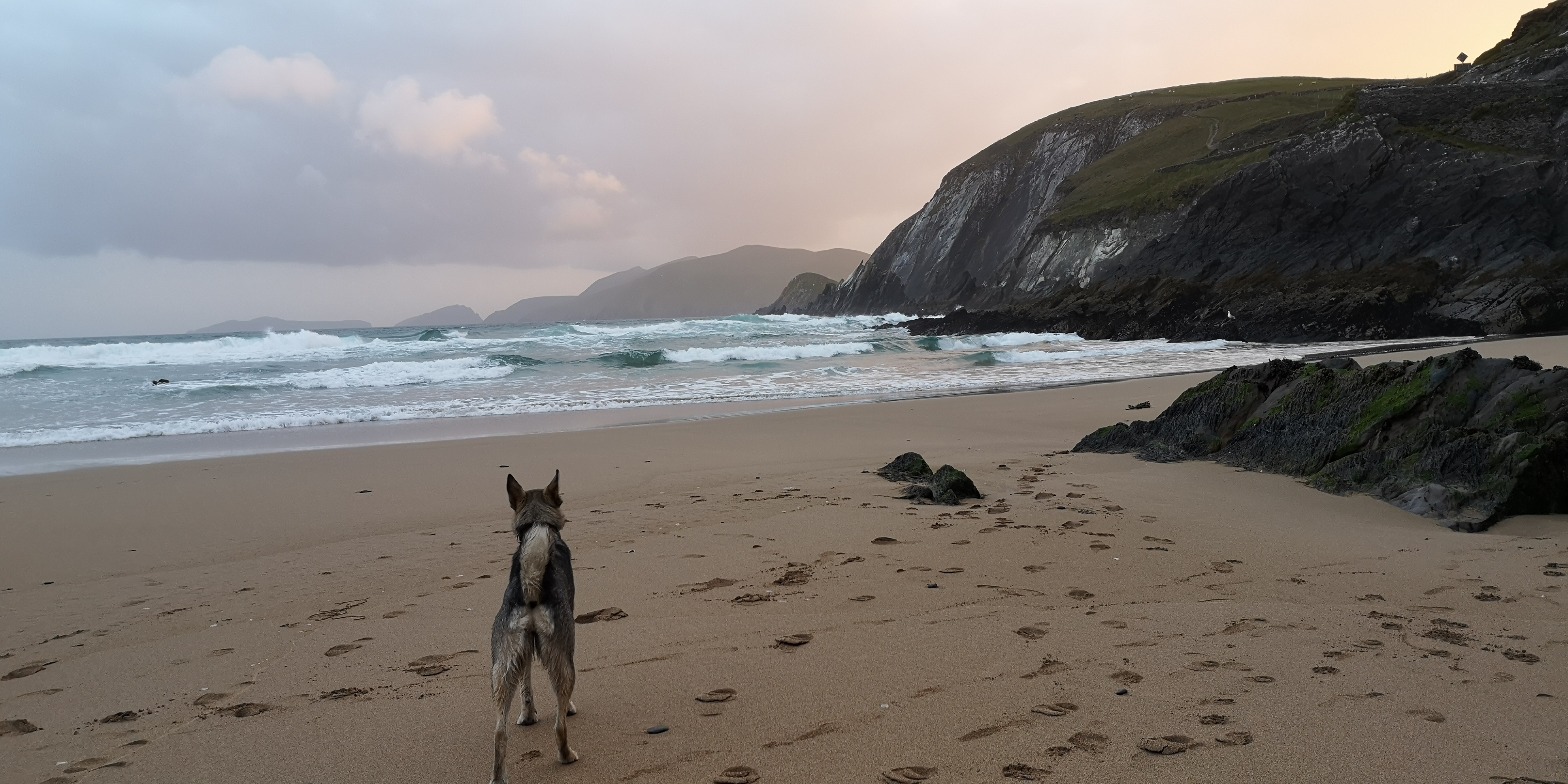 Aan het einde van de middag kom ik aan bij een parkeerplaatsje dat op de klif boven Coumeenoole Beach ligt. Het staat nog helemaal vol met auto’s. Ik wurm mijn bus erlangs en parkeer in de lengte langs het weggetje, dat doodloopt op het strand. Coumeenoole Beach is omgeven door kliffen. Er zijn flinke golven, waarvan het geluid weerkaatst tegen de hoek waarin het strand zich bevindt. Bovenop de klif, in de luwte van de achterliggende heuvels, staan een tiental huizen. Ik wil met de honden het stukje naar Dunmore Head lopen, maar ook hier staat weer een bord dat honden niet verder mogen.