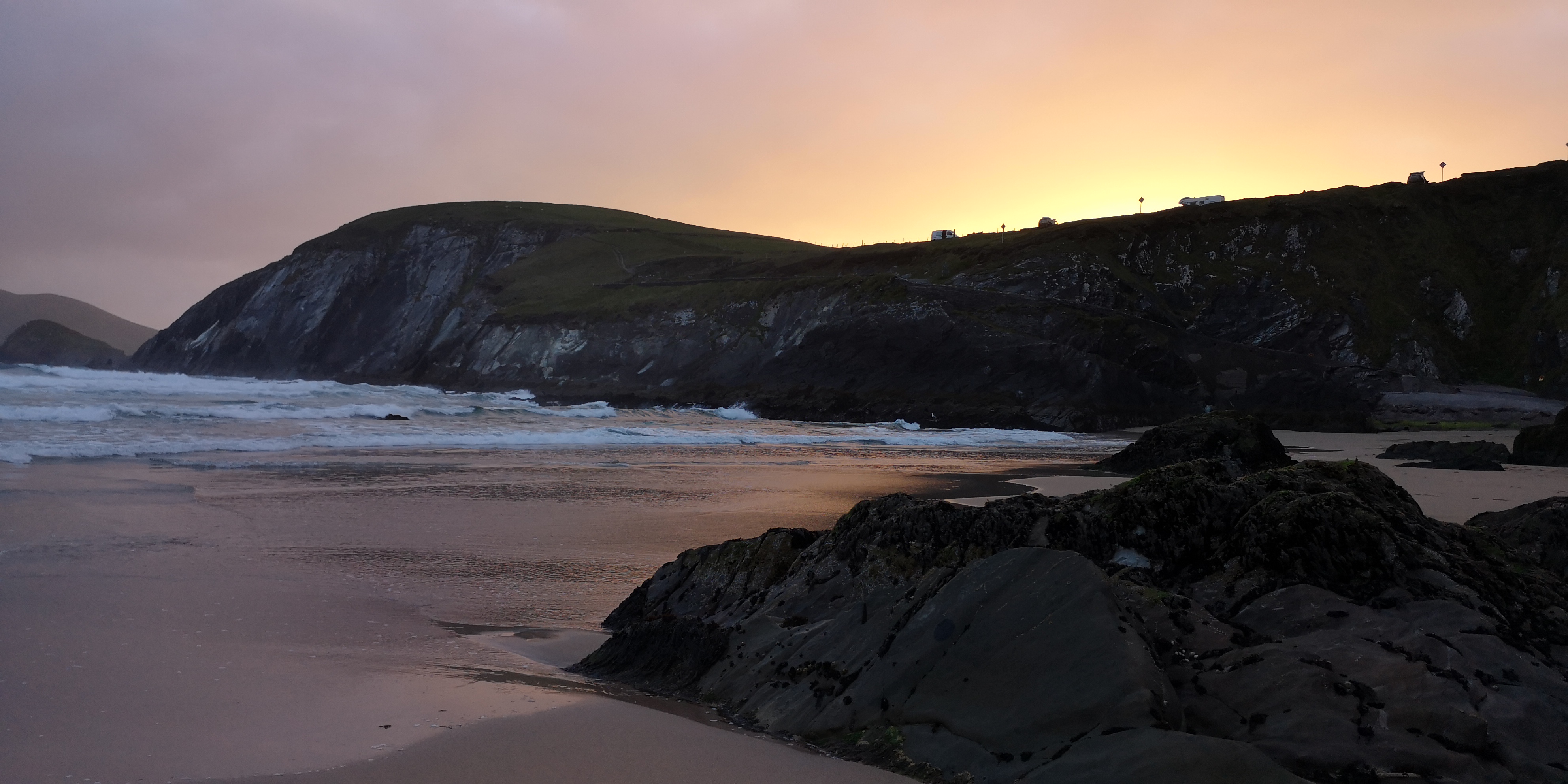 Dunmore Head is een voorgebergte in het meest westelijke deel van het schiereiland Dingle, en is tevens het meest westelijke plekje van Ierland, en dus Europa. Tegen de avond neemt de drukte af, en blijf ik samen met drie andere campers over bovenop de klif. Het begint te schemeren, en inmiddels is het eb geworden. Het strand blijkt tot aan de andere hoek van de baai te lopen. Ik daal met de honden de klif af, en we lopen over het natte zachte zand. Er stroomt een klein watertje langs de rotsen de zee in. De honden drinken ervan. Vanaf het strand zien we de zon langzaam achter de kliffen verdwijnen. Het laat een zachte roze glans op het water achter, en de bus bovenop de klif baadt in een oranje gloed.