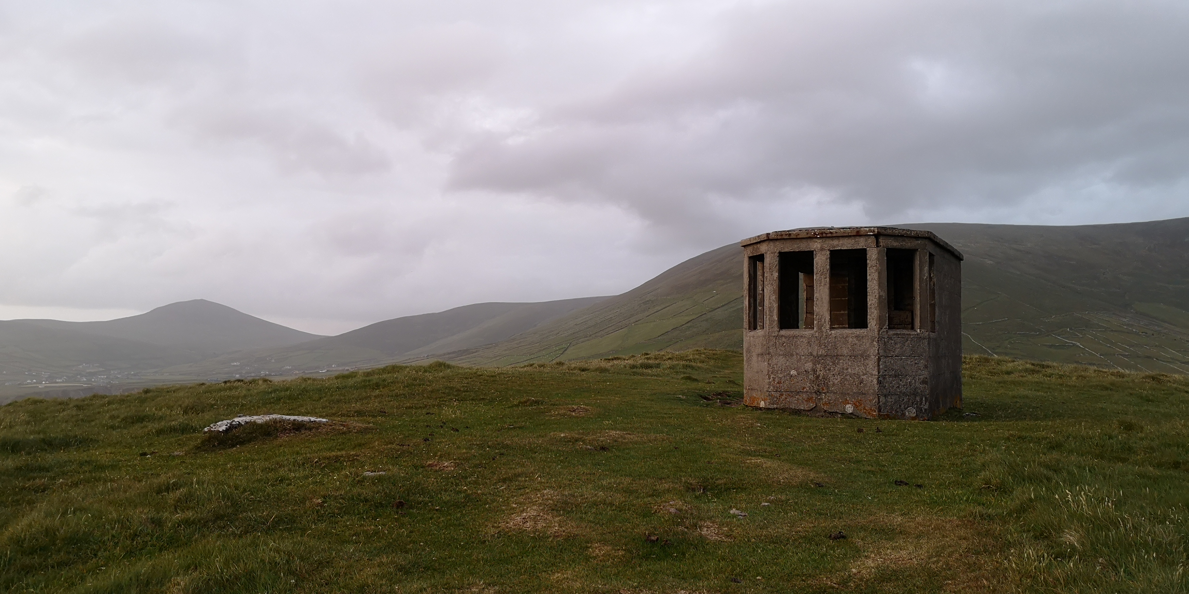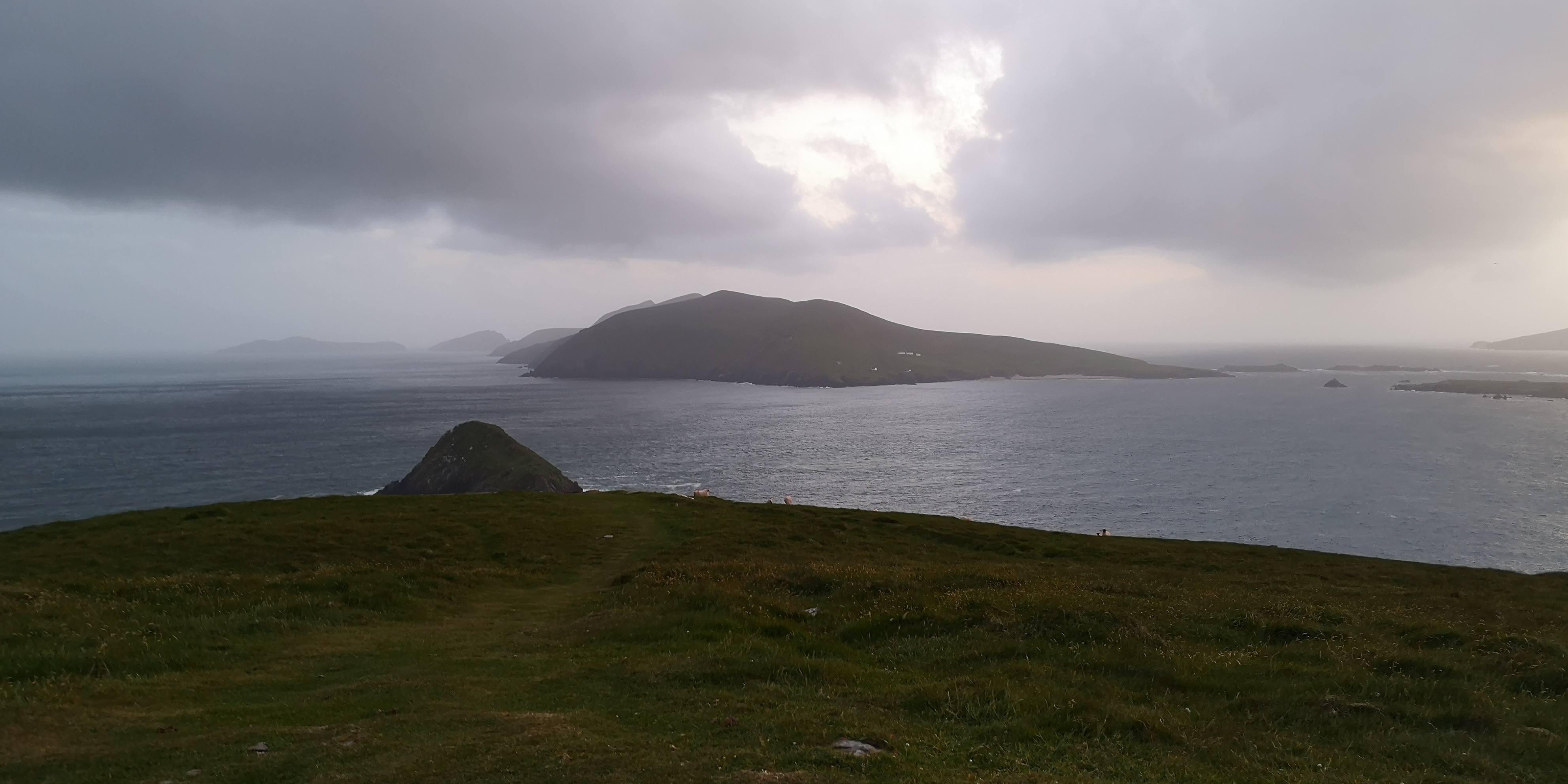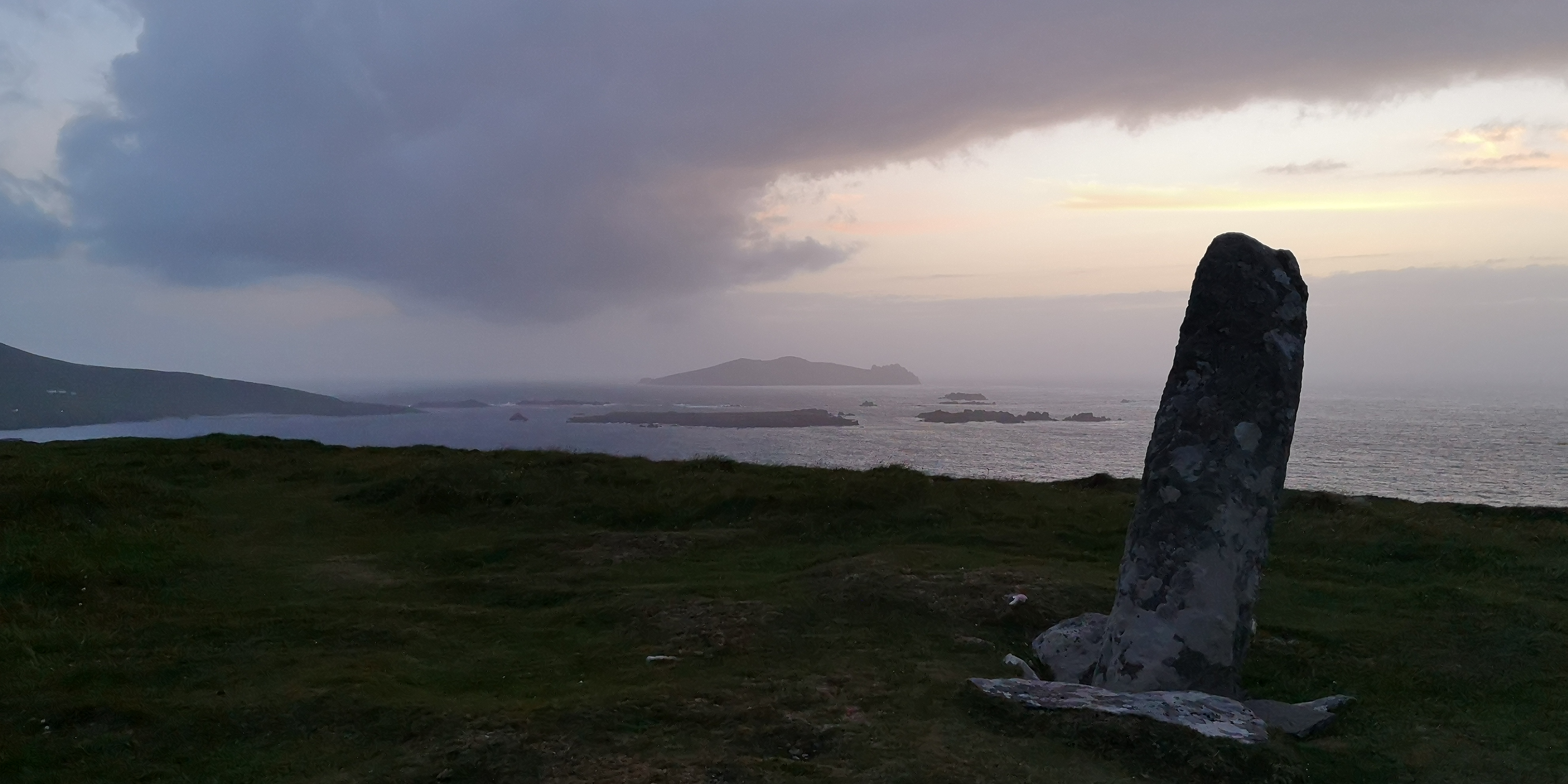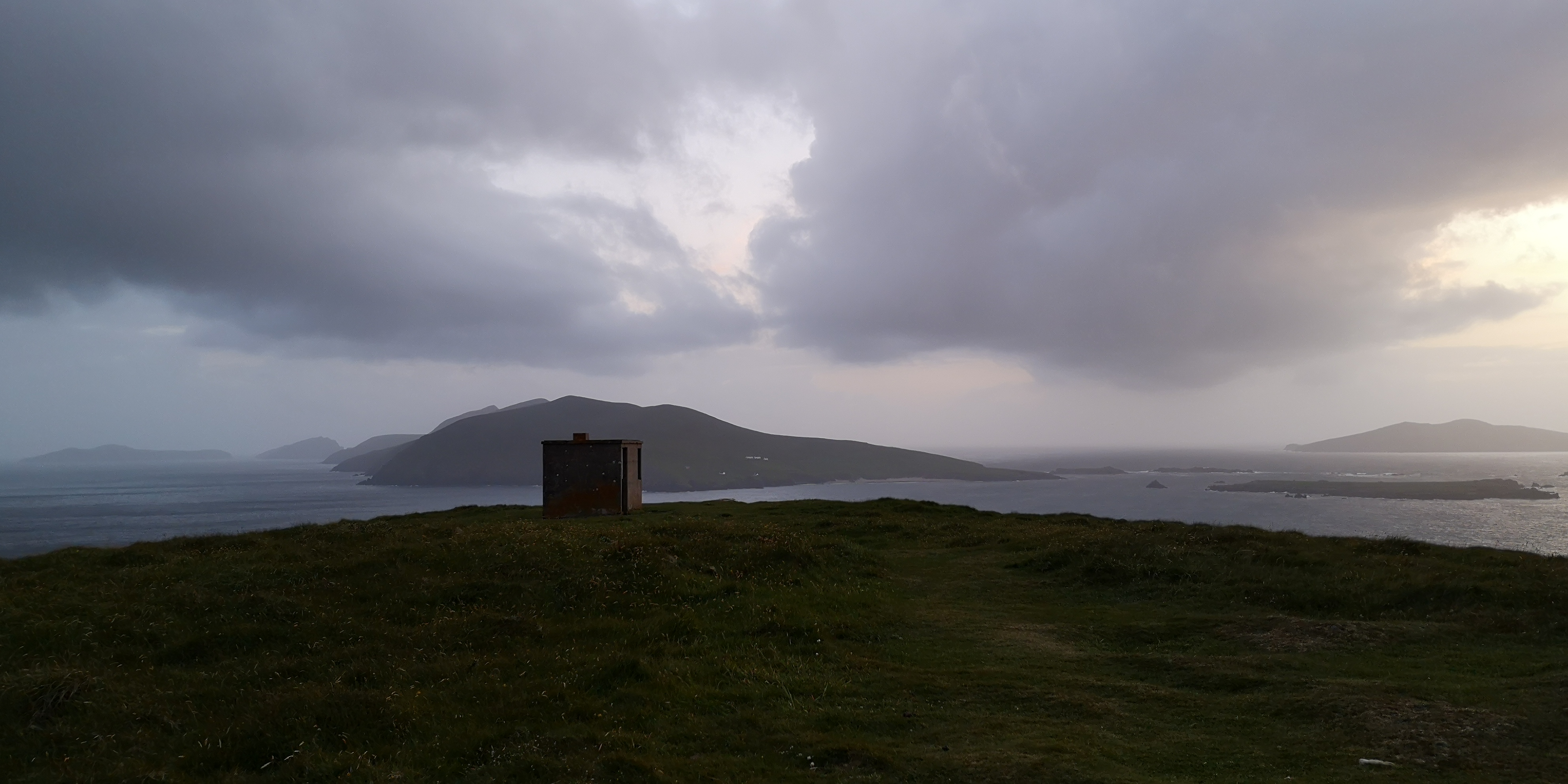 Terug bij de bus, leg ik de honden vast aan de lange lijn voor de open schuifdeur. Ik klim de heuvel van Dunmore Head op. Binnen een kwartiertje bereik ik het stenen huisje dat dient als uitkijkpunt. Het is tien uur ’s avonds en de zon is bijna onder. De laatste rotspunten van Dunmore Head lossen op in de mist en de zee. Het lage zonlicht strijkt eroverheen, en geeft het daarmee een bijna mystieke fonkeling. Ik adem diep in, en ben blij dat ik alleen en in stilte op dit punt mag staan.