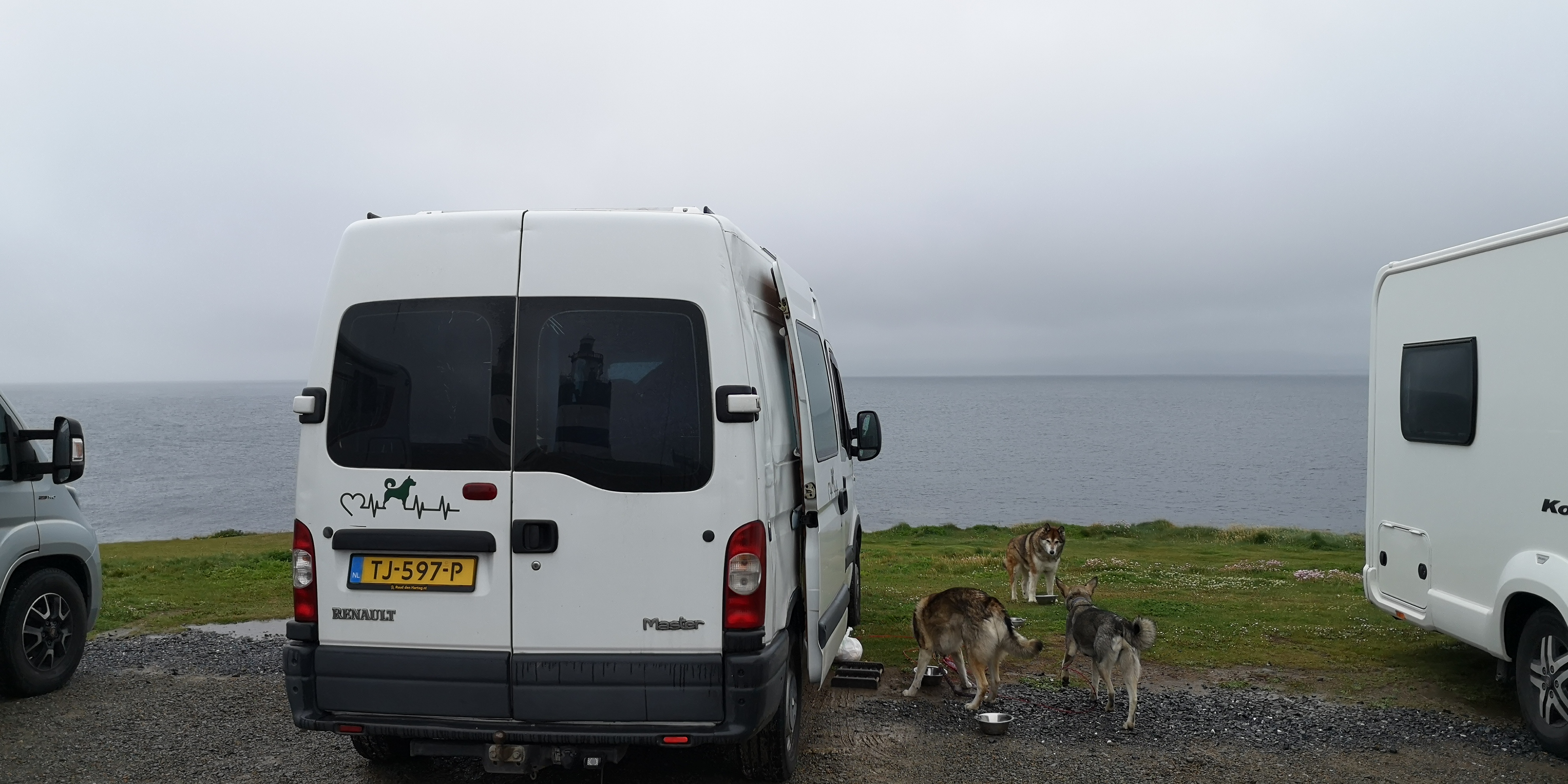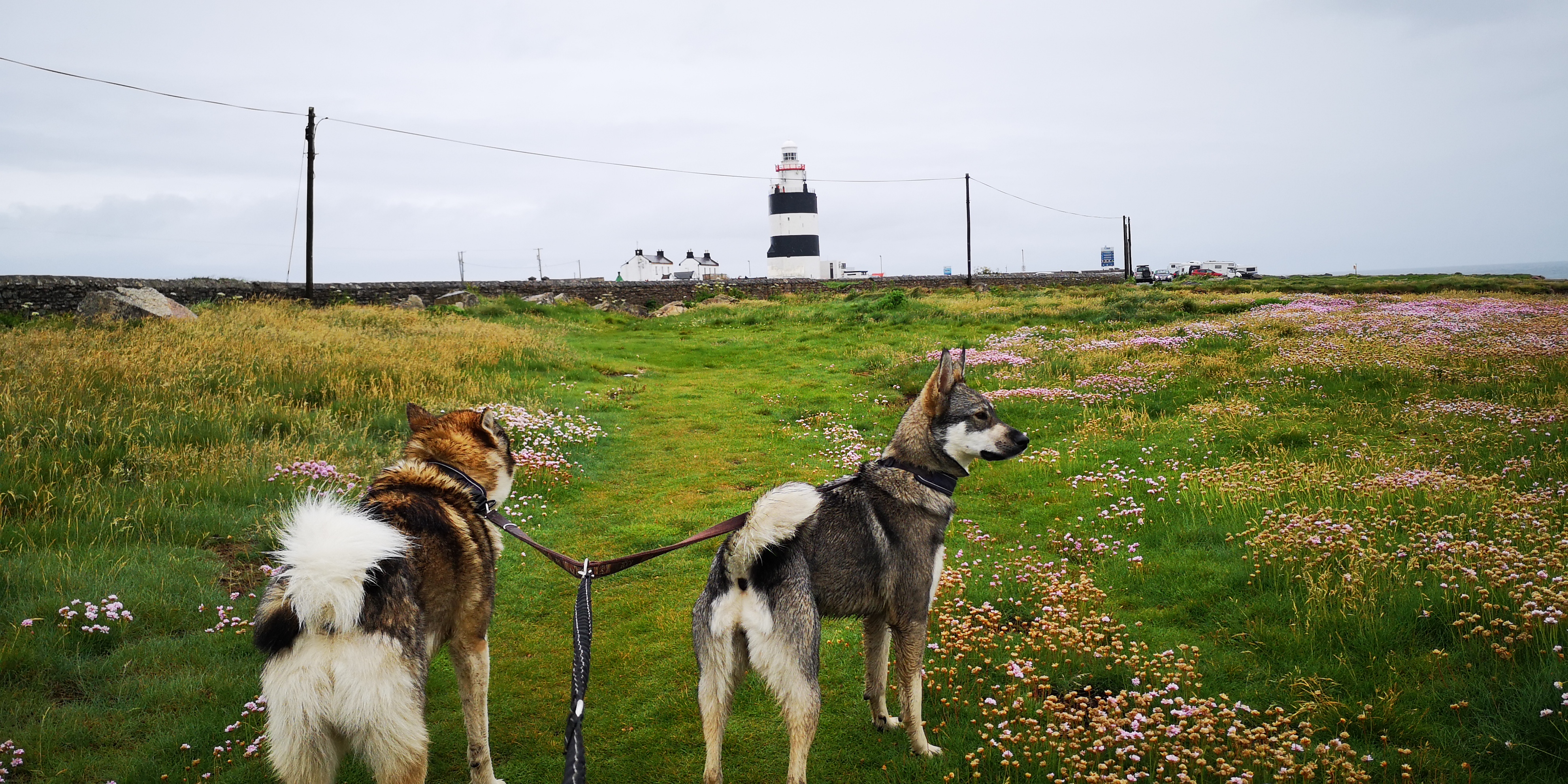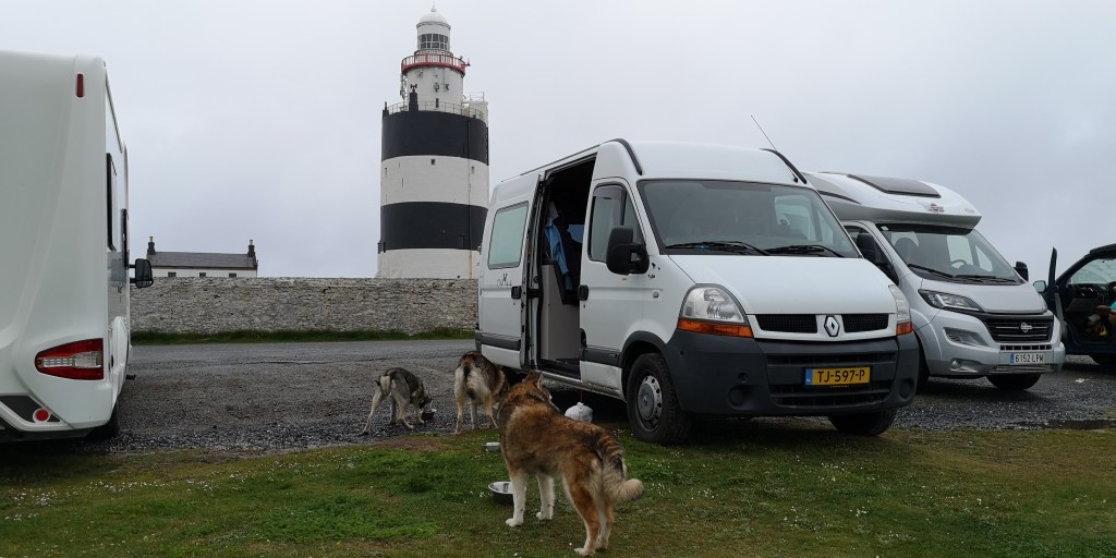 In de middag loop ik samen met Mika en Moran naar de haven in Slade. Er is geen voetpad, dus we lopen over het nauwe weggetje, terwijl het drukke autoverkeer langs ons heen raast. Er staan inderdaad overal borden met ‘private property’ erop. Hook Head Lighthouse staat hoog aangeschreven als toeristisch trekpleister, maar het valt mij een beetje tegen. Er zijn geen wandelpaden, en het is er ontzettend druk met auto’s en mensen. Het weer zit eerlijk gezegd ook niet mee: het is koud, donker en grauw. Maar ik blijf er toch maar een nachtje staan, ingeblikt tussen de andere campers, want ik heb ook geen zin om verder te rijden. Ik maak het gezellig in de bus met de gordijntjes dicht en een kaarsje aan. De honden slapen rustig, terwijl ik nog uren zit te lezen uit een dik boek.
