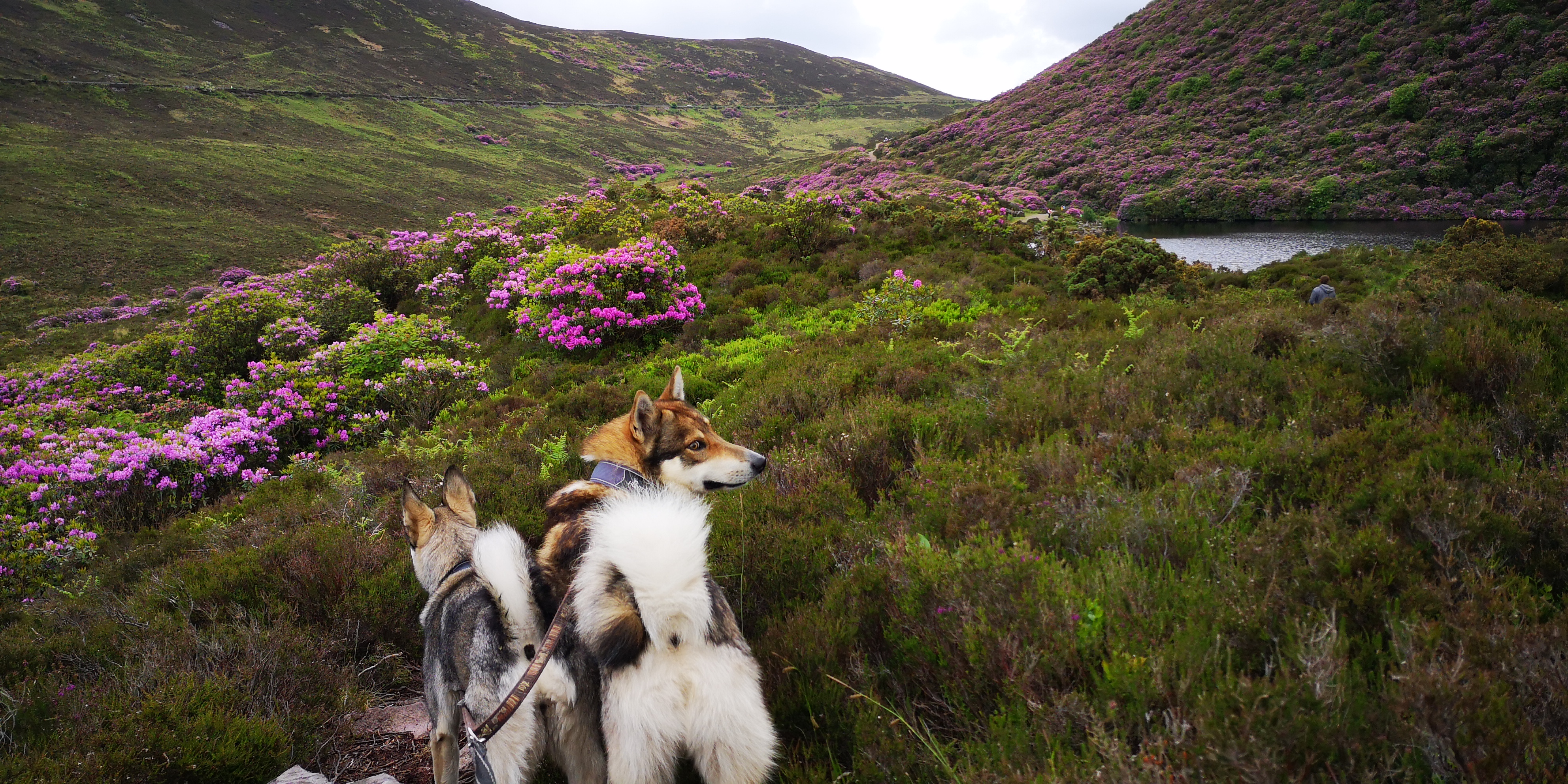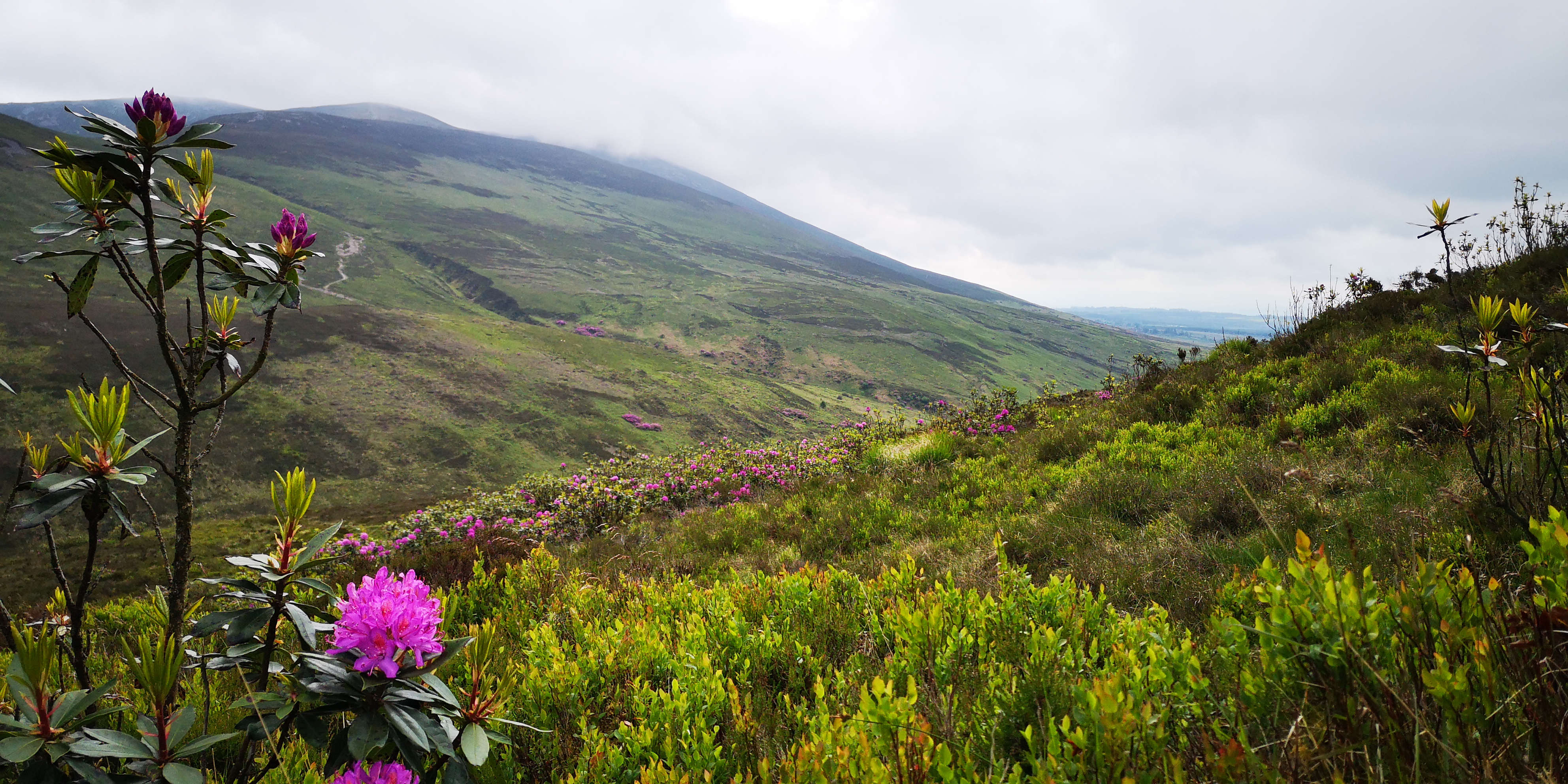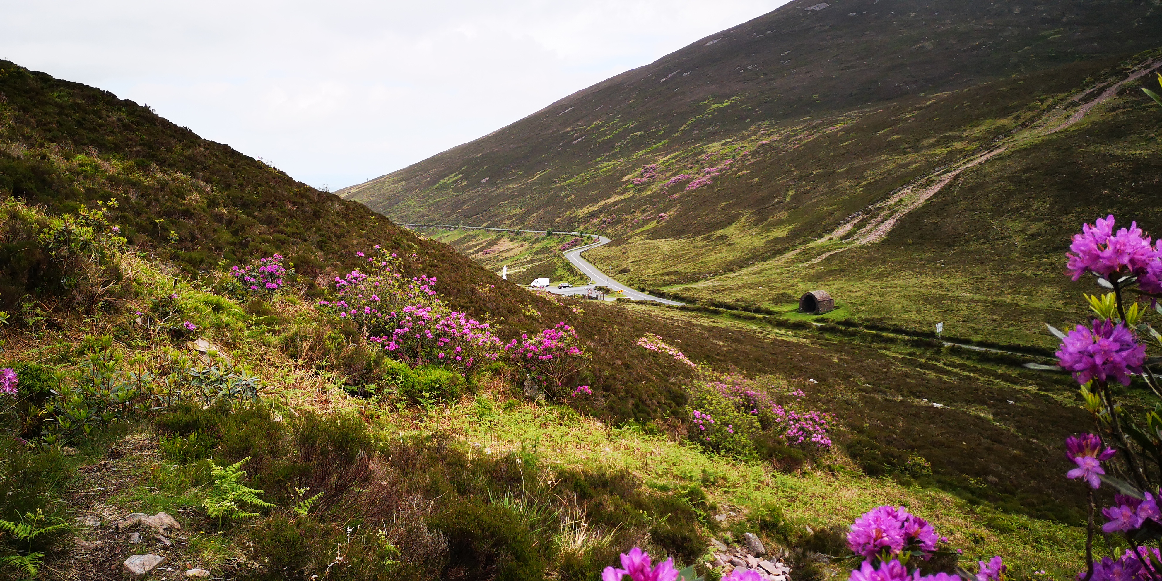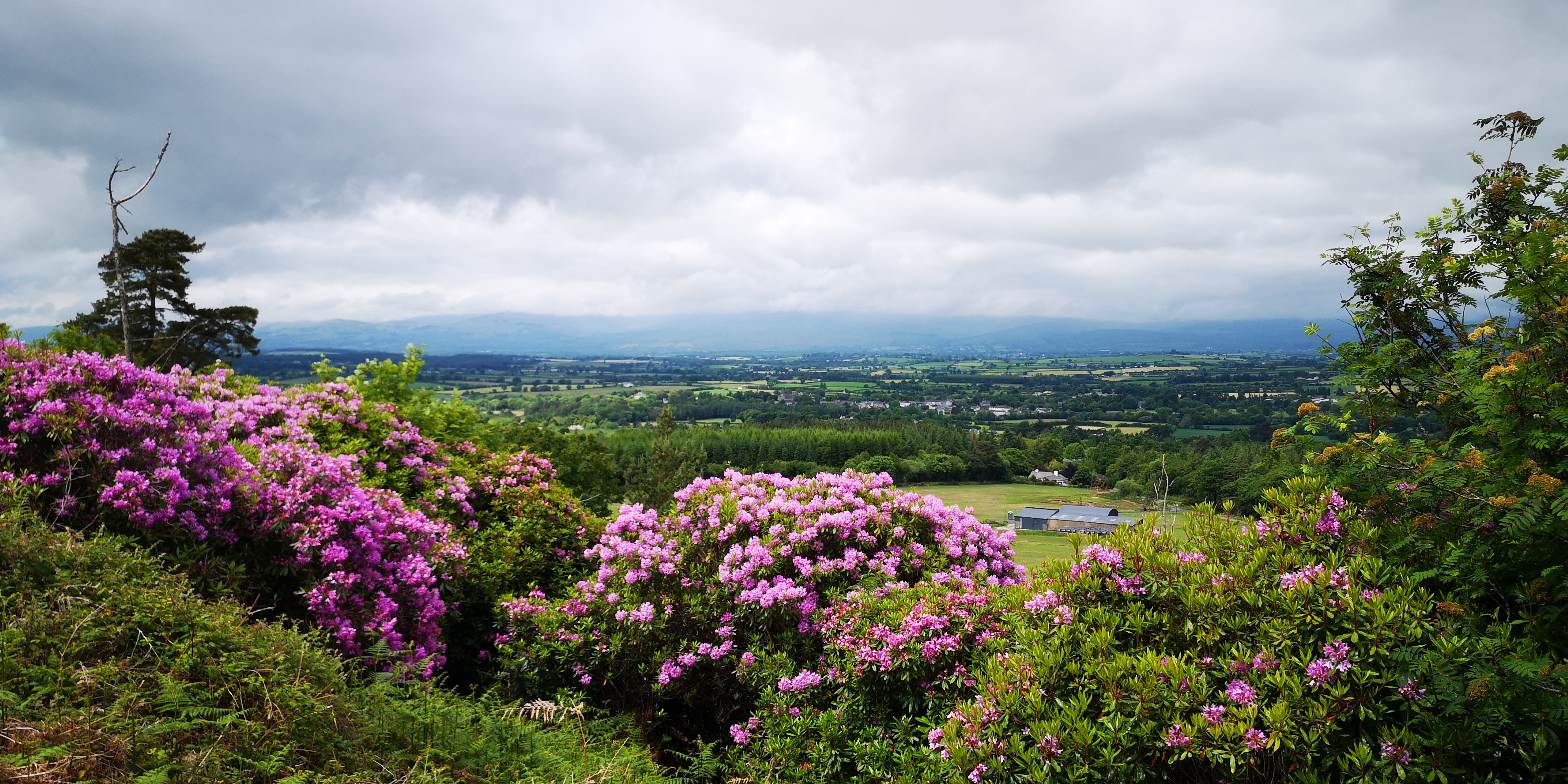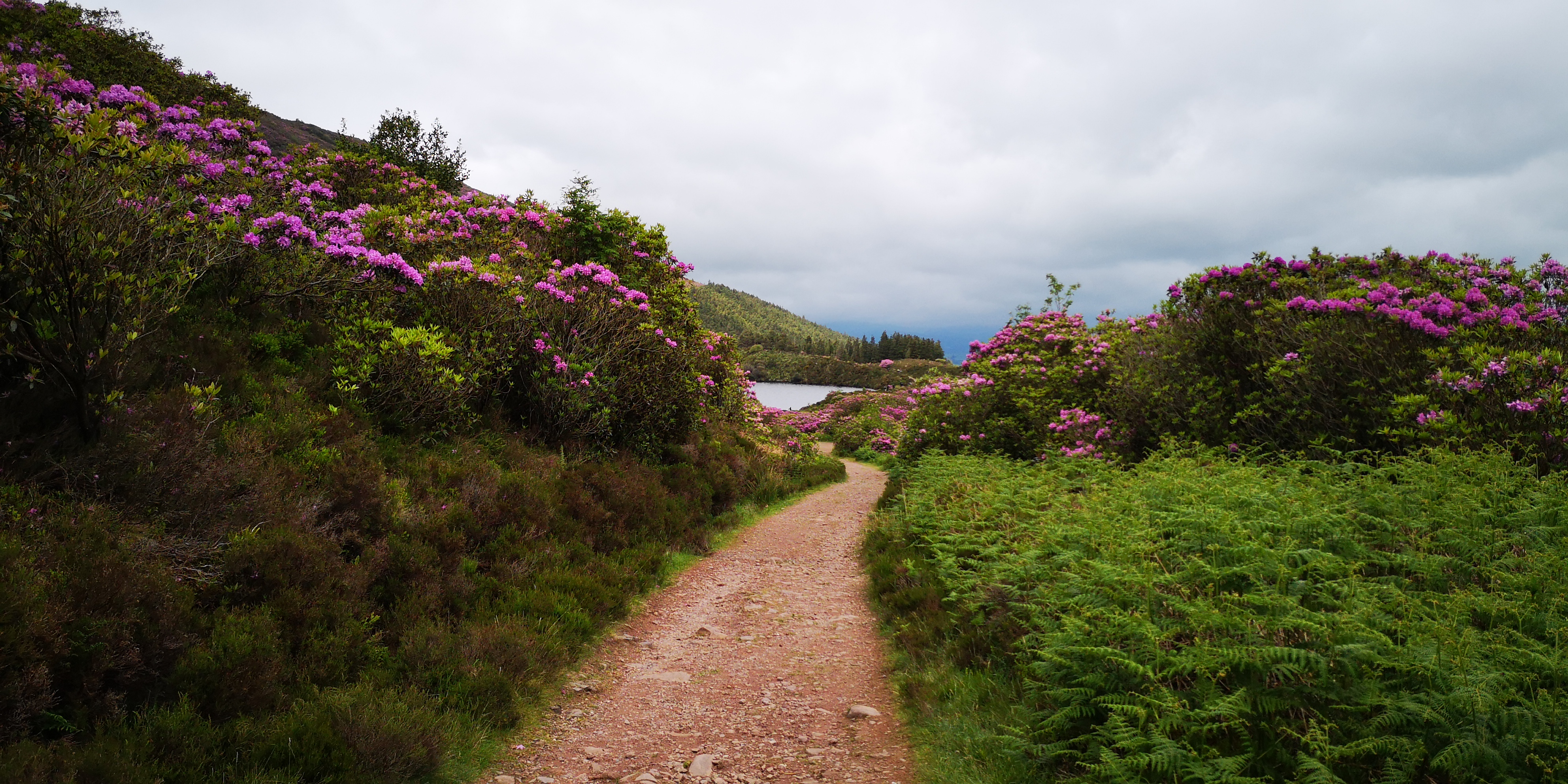 Soms komt een plek als een complete verrassing. Mijn verwachting van Knockmealdown Mountains was dat van een stel kale heuvels, en was vooral bedoeld als tussenstop op weg naar het zuidwesten van Ierland. Maar wanneer ik The Vee Pass over rijd, zie ik een prachtig bergachtig landschap om me heen. Precies op de grens van de graafschappen Tipperary en Waterford ligt een parkeerplaats. Het is er druk, want de Ieren hebben een vrije dag vandaag. Maar ik heb het geluk om nog net een plekje te vinden aan de rand van de parkeerplaats met uitzicht op de pas en de glooiende vallei eronder. De ronde toppen van de bergketen zijn bedekt met heide. Wat lager bevindt zich voornamelijk een mix van sparren en dennen. Zowel de heide als de naaldbomen zijn doordrongen van een paarse kleurenpracht van de bloeiende rododendrons. Wanneer we later op de middag de Blackwater route lopen richting Clogheeh, zien we dat er onder de naaldbomen en rododendrons geen enkel streepje zonlicht wordt toegelaten. De bodem bestaat uit mos en een dik bed aan dennennaalden. Het voelt er heerlijk koel.