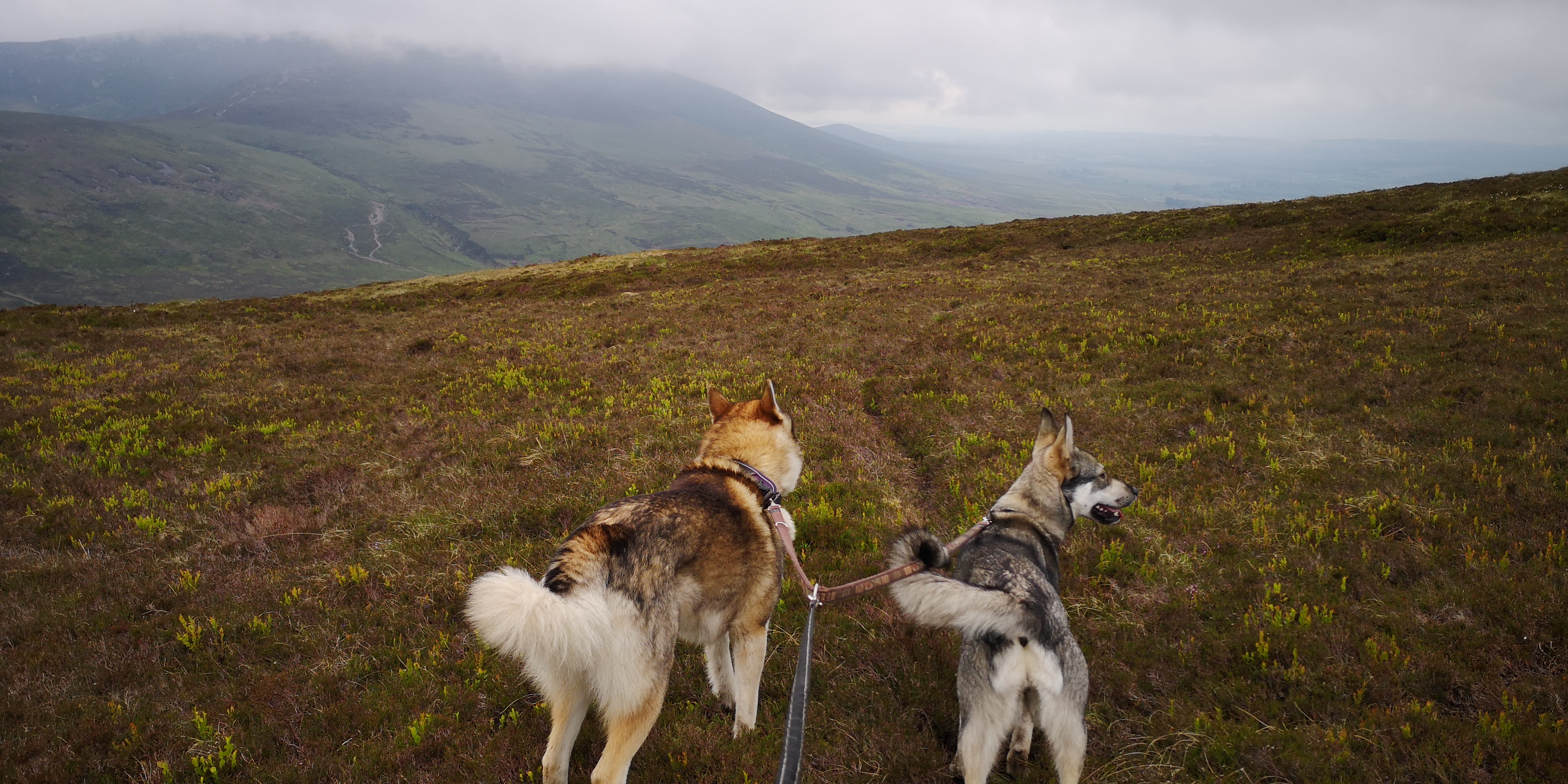 De volgende ochtend blaffen de honden mij al om zes uur wakker. Ik hoor een schrapen geluid buiten aan de bus. Voorzichtig kijken we onder het gordijntje door, en zien een stel schapen om onze bus heenstaan. Het is nog vroeg, er staat een harde wind en de wolken hangen laag over de heuveltoppen, maar we gaan toch maar weer op pad. Dit keer volgen we de Blackwater route de andere kant op richting Farbreaga, en klimmen gestaag langs de bergketen van de Knockmealdown Mountains omhoog. ‘Och, dat is jammer.’ We zijn een klein uurtje verder, en moeten nu via een steile trap over een hek heen. De traptreden zijn als dat van een ladder. De honden kunnen er niet op staan. Moran krijg ik nog over het hoge hek getild, maar Mika met zijn zesentwintig kilo krijg ik er niet overheen gesjord. Even verderop zie ik een klein pad recht omhoog de Knockshanahullion opgaan. ‘Oké, dan pakken we die maar.’ Deze berg van 652 meter hoog, heeft een ronde top, dus het is onduidelijk waar nu precies het hoogste punt ligt. We lopen over de zachte heide. Het is lastig om te zien waar ik mijn voeten moet neerzetten. De grond is oneven en er liggen stenen verstopt onder de dikke laag planten. Mijn enkels hebben het zwaar te verduren, en ik glijd meerdere keren uit over het natte gras en de modder. Ik houd mijn focus op de Sugarloaf Hill en de Knockmealdown, respectievelijk 663 en 794 meter hoog, want deze liggen beiden recht tegenover de vallei waar de bus geparkeerd staat. Donkere wolken bewegen zich in rap tempo over hun toppen heen.