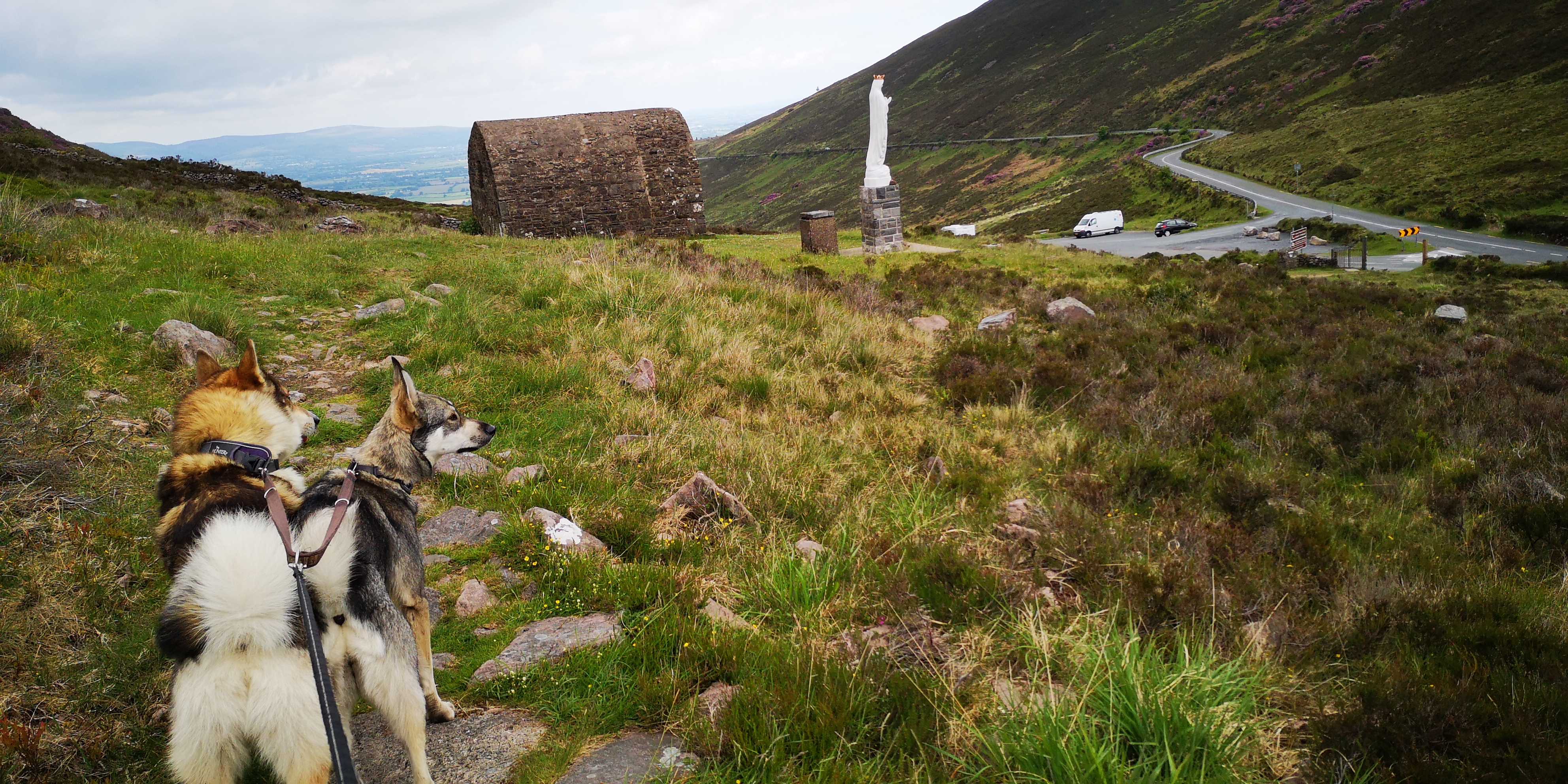 Het laatste stuk naar beneden is zeer steil, en Mika en Moran moeten achter mij lopen, zodat ze niet aan de heupriem kunnen trekken en mij uit balans brengen. We komen uit bij een klein kapelletje met een groot wit beeld van Maria, oftewel A Catholic Shrine To Our Lady of Lourdes, zoals het staat beschreven. In het halfopen kapelletje staat een tafel met kaarsjes, papiertjes en andere prullaria, die mensen blijkbaar hebben achtergelaten. Moran wil er maar al te graag aan snuffelen, maar ik trek haar mee voordat ze iets van de tafel pakt. Ze is nog steeds een vrij onbehouwen jonge hond, en de details van een Mariabeeld ontgaan haar compleet. Mika, daarentegen, is een stuk bedachtzamer en kijkt Maria even in de ogen. Daarna loopt hij met lichte tred verder. Wie weet heeft hij het licht gezien.