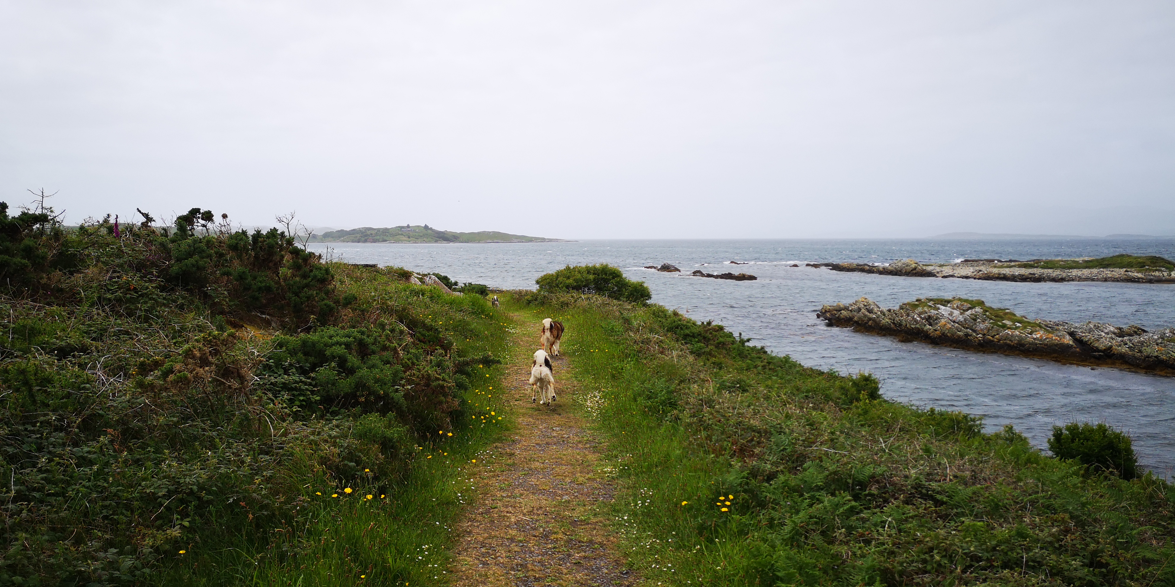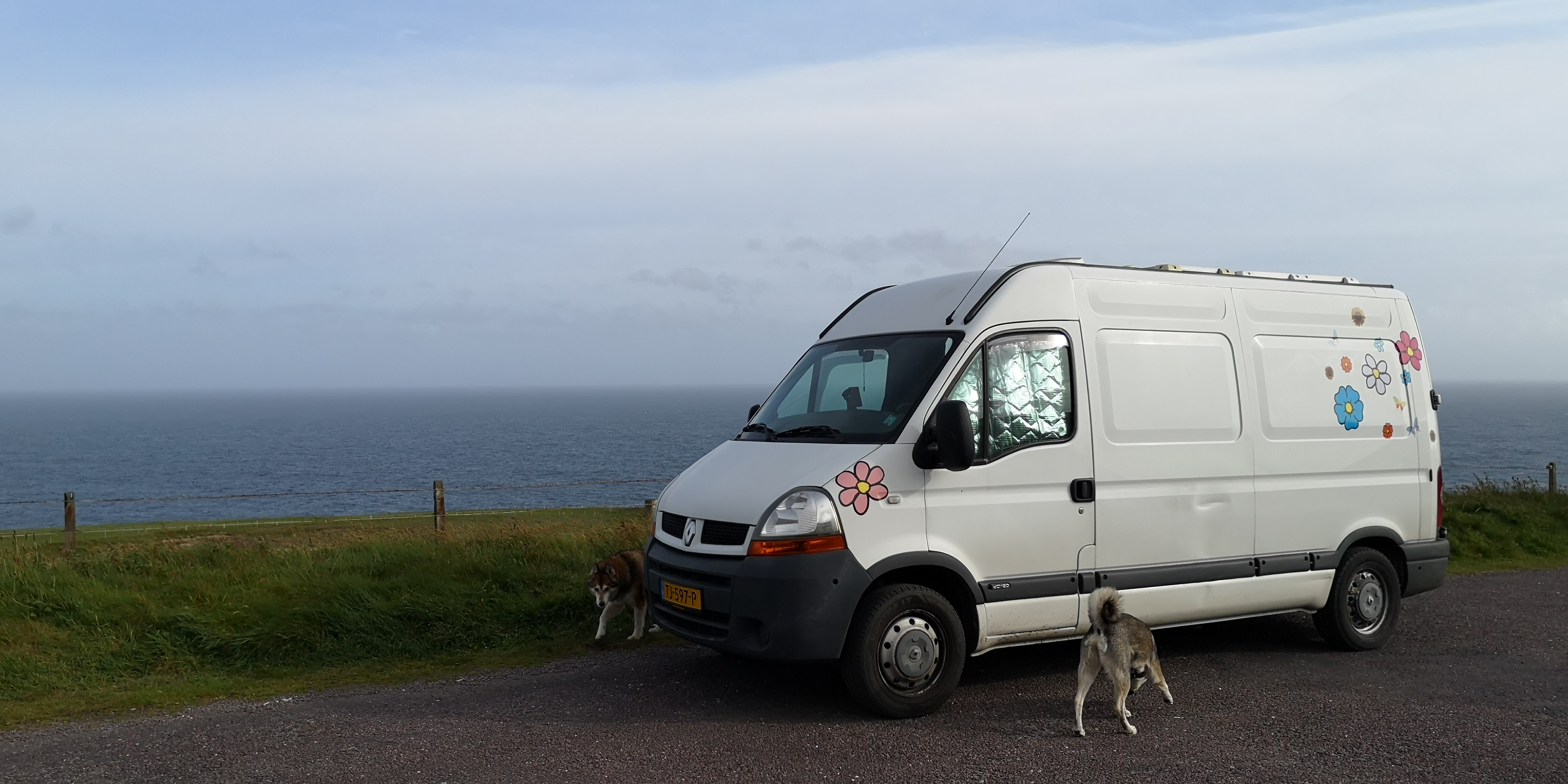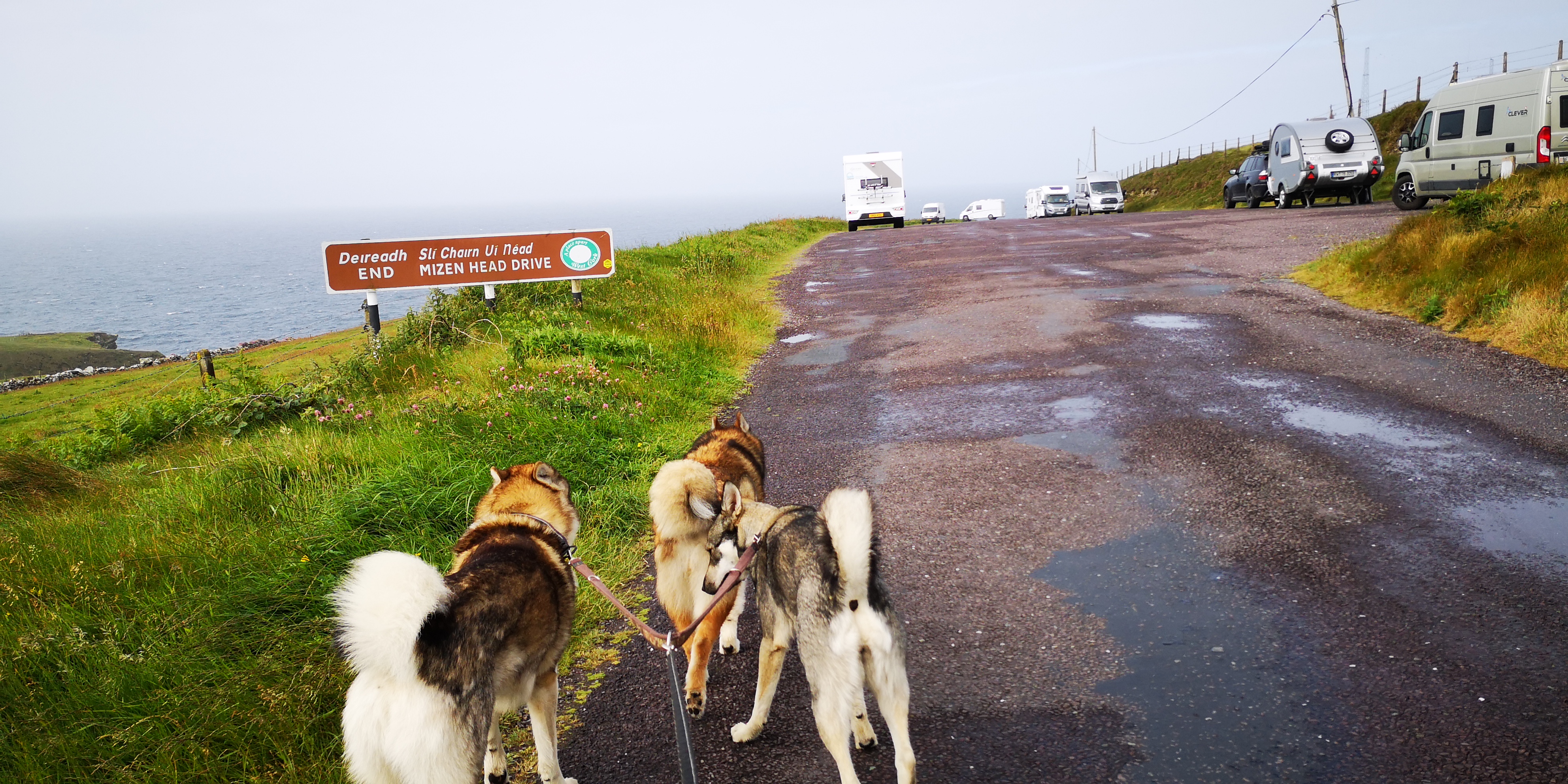 We rijden richting Mizen Head, het meest zuidwestelijke puntje van Ierland. Vanaf nu pakken we delen van de Wild Atlantic Way, een route langs vooral de westkust, maar ook stukken van de Noord- en zuidkust van Ierland. Al snel rijden we weer over een klein weggetje, maar met de meest indrukwekkende kliffen en uitzichten over de Atlantische Oceaan. Het zicht is wat heiig, waardoor het lijkt alsof er een soort blauwachtige sluier over het water en de bergen daarachter hangt. Grote rotsblokken markeren het landschap. Schapen, koeien en paarden grazen van de schuine hellingen. Gestapelde muurtjes zijn overgroeid met heide en varens. Langzaam klimmen we omhoog naar het zuidwestelijke puntje toe. Mizen Head is natuurlijk ook weer zo’n toeristisch punt. Ik ben bewust na sluitingstijd gekomen, maar grote hekken voorkomen dat je het laatste stukje ziet. Daarvoor moet men een kaartje kopen. Het is in ieder geval een prima plek om te overnachten. Er staan een stuk of tien andere campers, en ik parkeer met het zicht op de woeste zee in de diepte. Ik maak mijn gebruikelijke pannetje spaghetti. De honden genieten van hun nieuwe merk brokken. Er zijn wederom geen wandelpaden te bekennen, dus na het eten lopen we een stuk van het weggetje af in de snijdende wind. Verder waagt niemand zich buiten de camper. We gaan vroeg naar bed. Ik denk even terug asn de weken dat ik samen met Mika en Moran de Waddenroute liep, en dat we in een tentje sliepen. Wat ben ik blij dat we nu in het veilige metalen buikje van de bus liggen. En we hebben alles bij de hand: warmte, water, eten en een toiletje. Wat wil een mens nou nog meer?