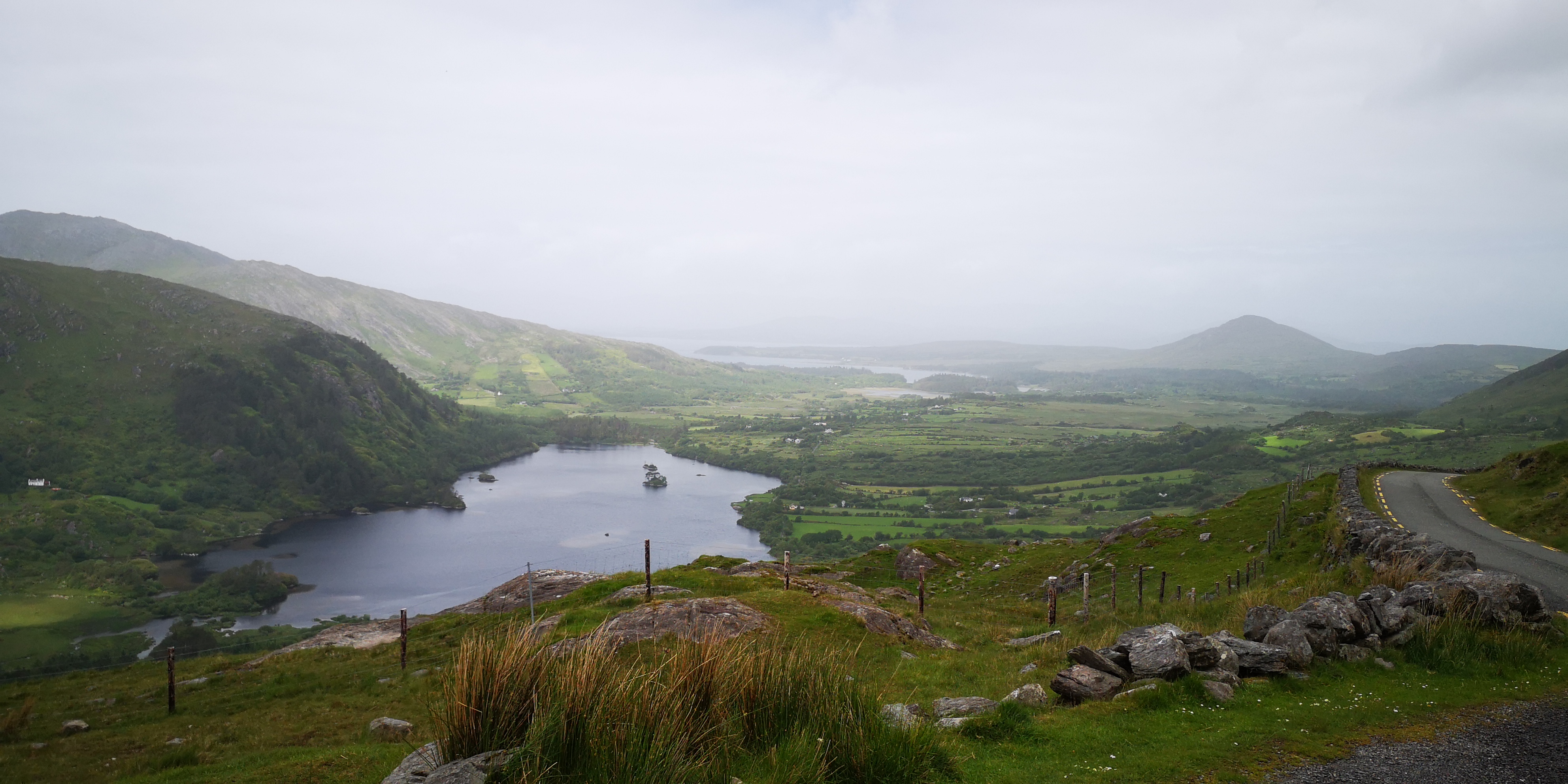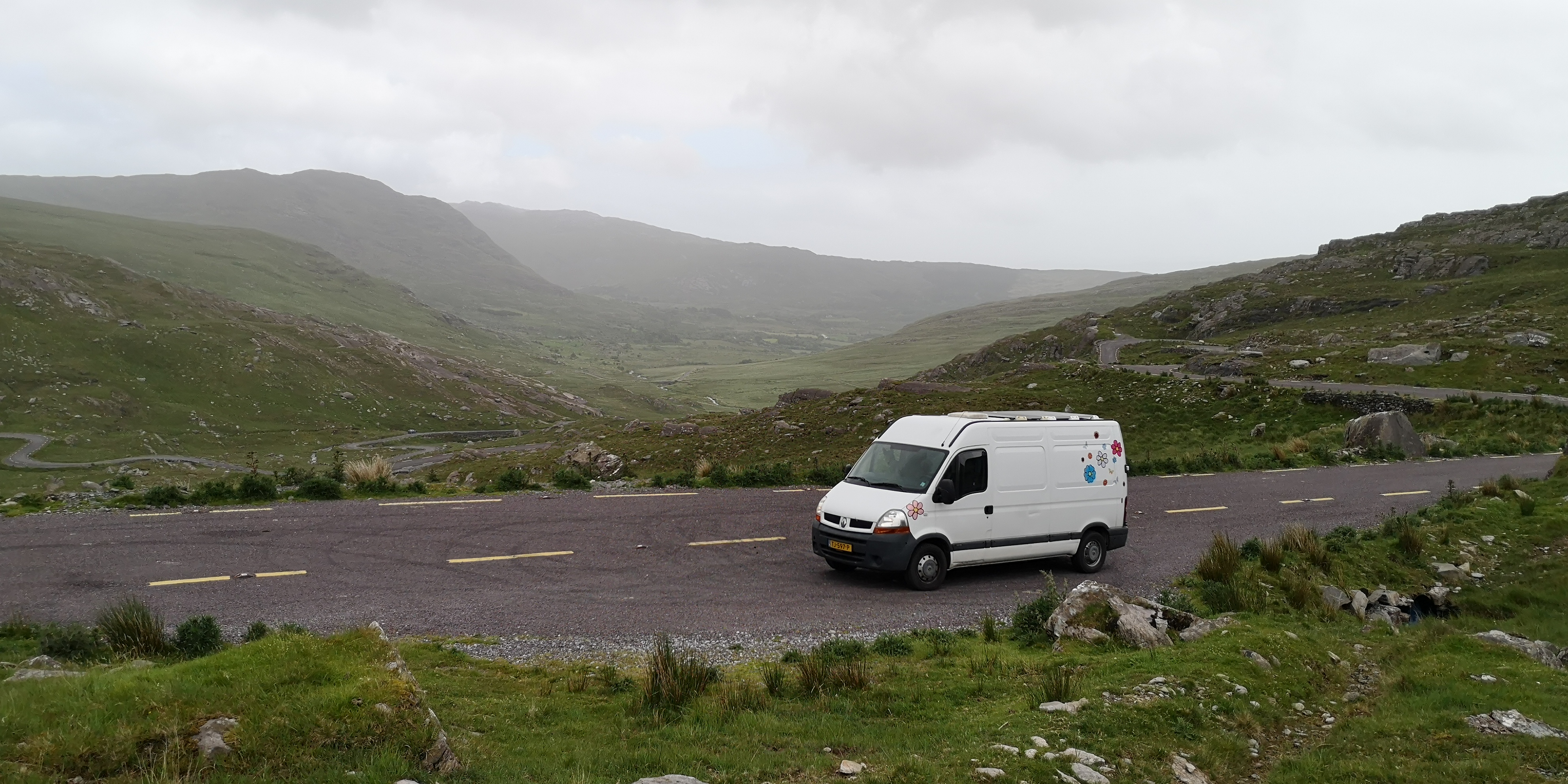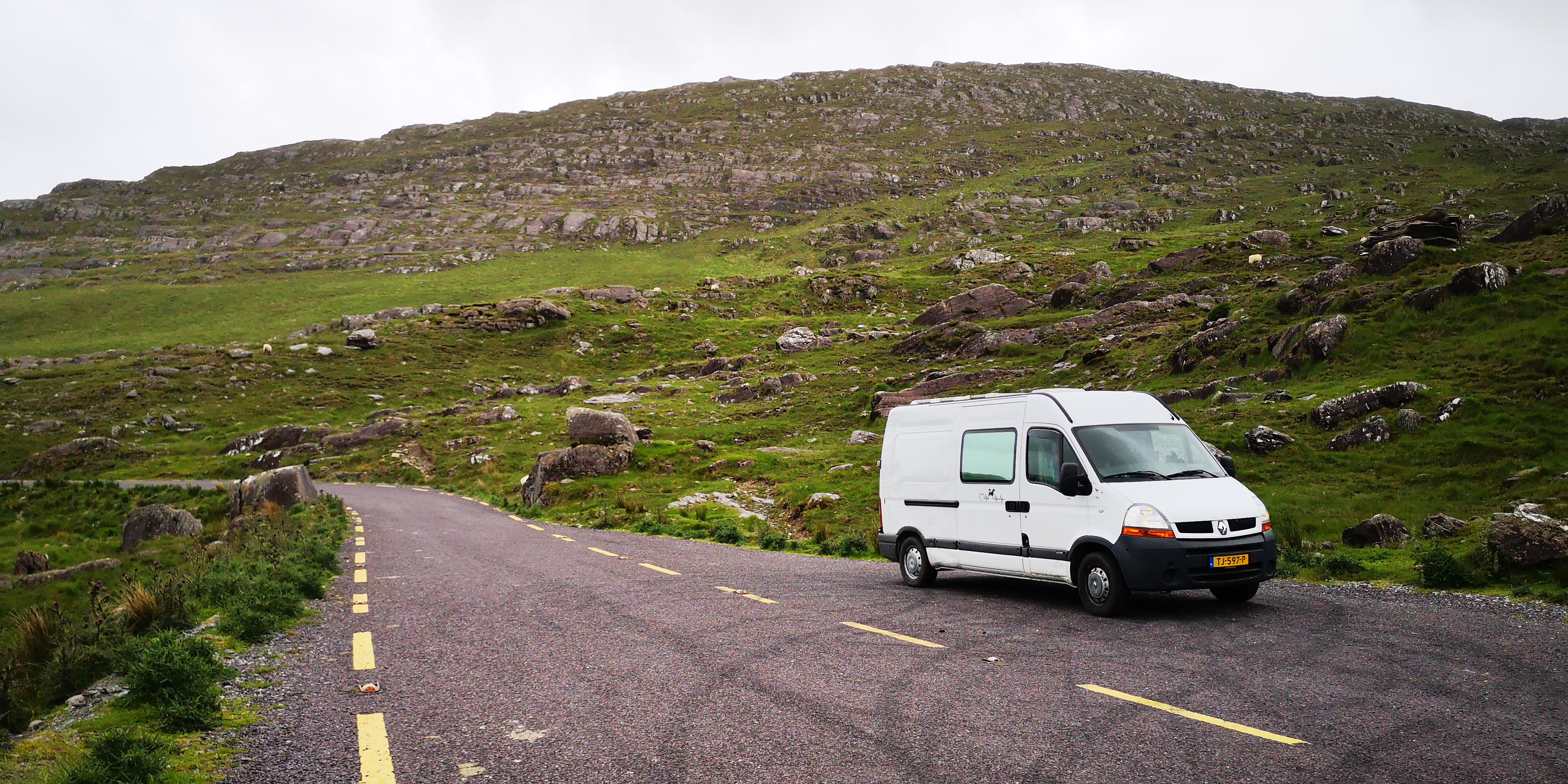 De volgende dag vervolg ik mijn route over de Ring of Beara, die het Caha-gebergte doorkruist via de Healy Pass. Het weggetje kringelt zich tussen de bergen omhoog. Grote rotswanden markeren het landschap. Overal zien we het wit van bruisende watervallen, die over de rotsen hun weg naar beneden vinden. We rijden over talloze kleine stenen bruggetjes, en overal lopen schapen op de weg. Mika en Moran staan beiden naast me, en kijken mee door de voorruit. Bovenop de pas stap ik even uit en maak wat foto’s. Een parkeerplaats is er niet, evenmin als een wandelroute.