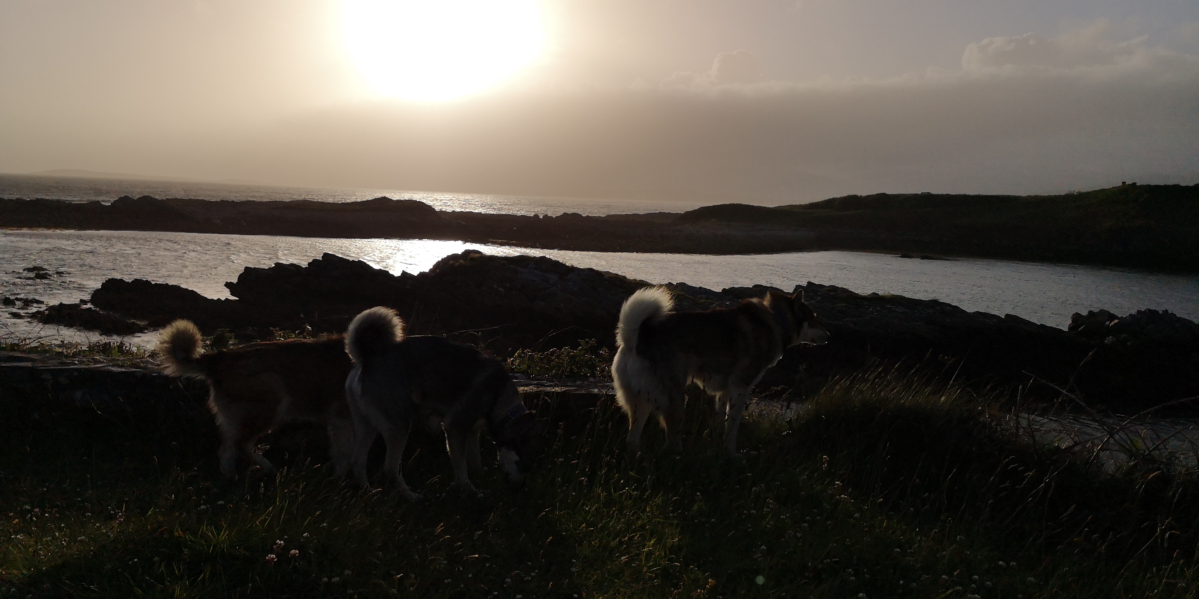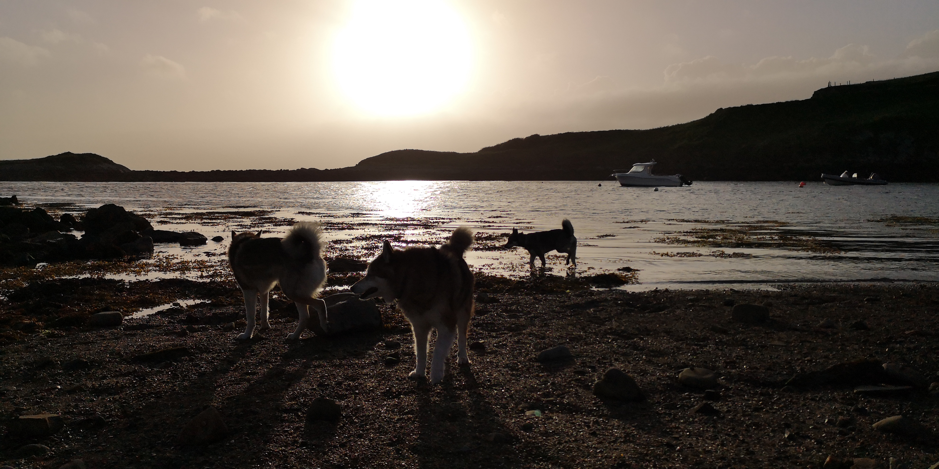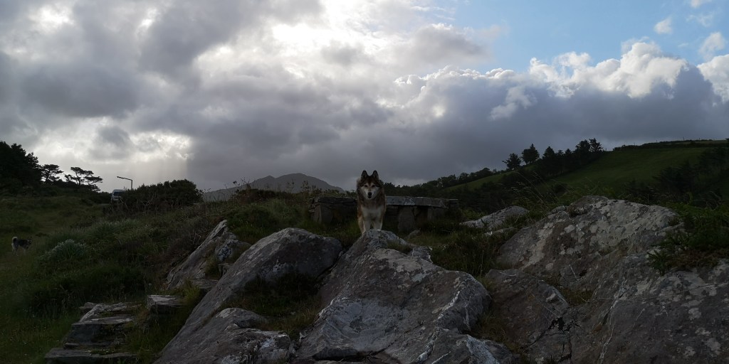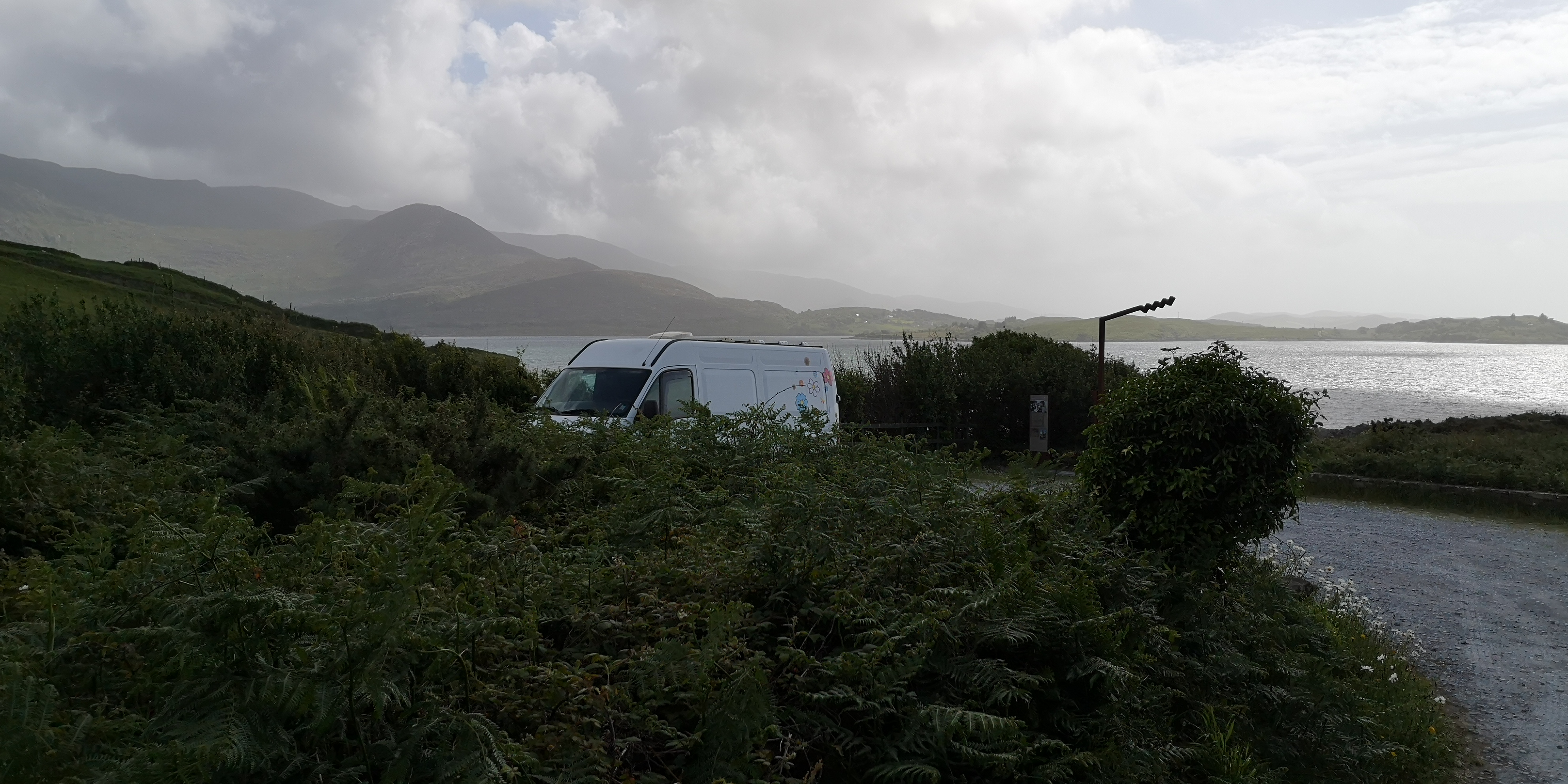 Na de pas pak ik de Wild Atlantic Way weer op, en vind een klein parkeerplaatsje bij in de buurt van een Discovery Point. Vanaf de weg is het niet te zien. Het ligt verscholen achter een stenen muurtje en beplanting. Vanaf het parkeerplaatsje hebben we zicht op de zee. De honden rennen over het stenen strandje naar het water toe. Marte staat er als eerste in, terwijl Mika en Moran de rotsen uitlopers verkennen. Verder staan er een paar stenen picknick bankjes, en er is een piepklein haventje met twee bootjes. Wat een vrijheid, en wat een fijne plek om te overnachten.