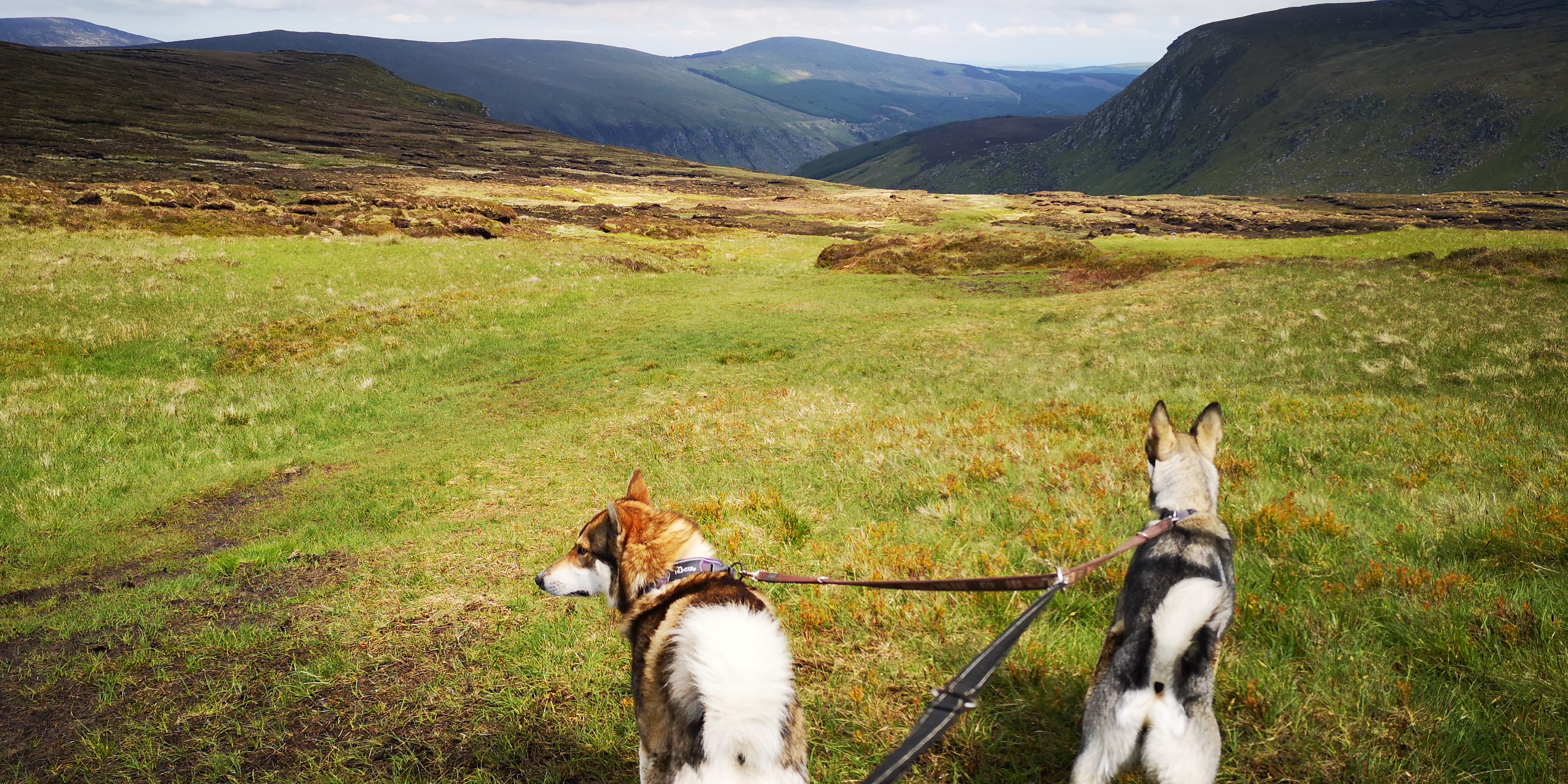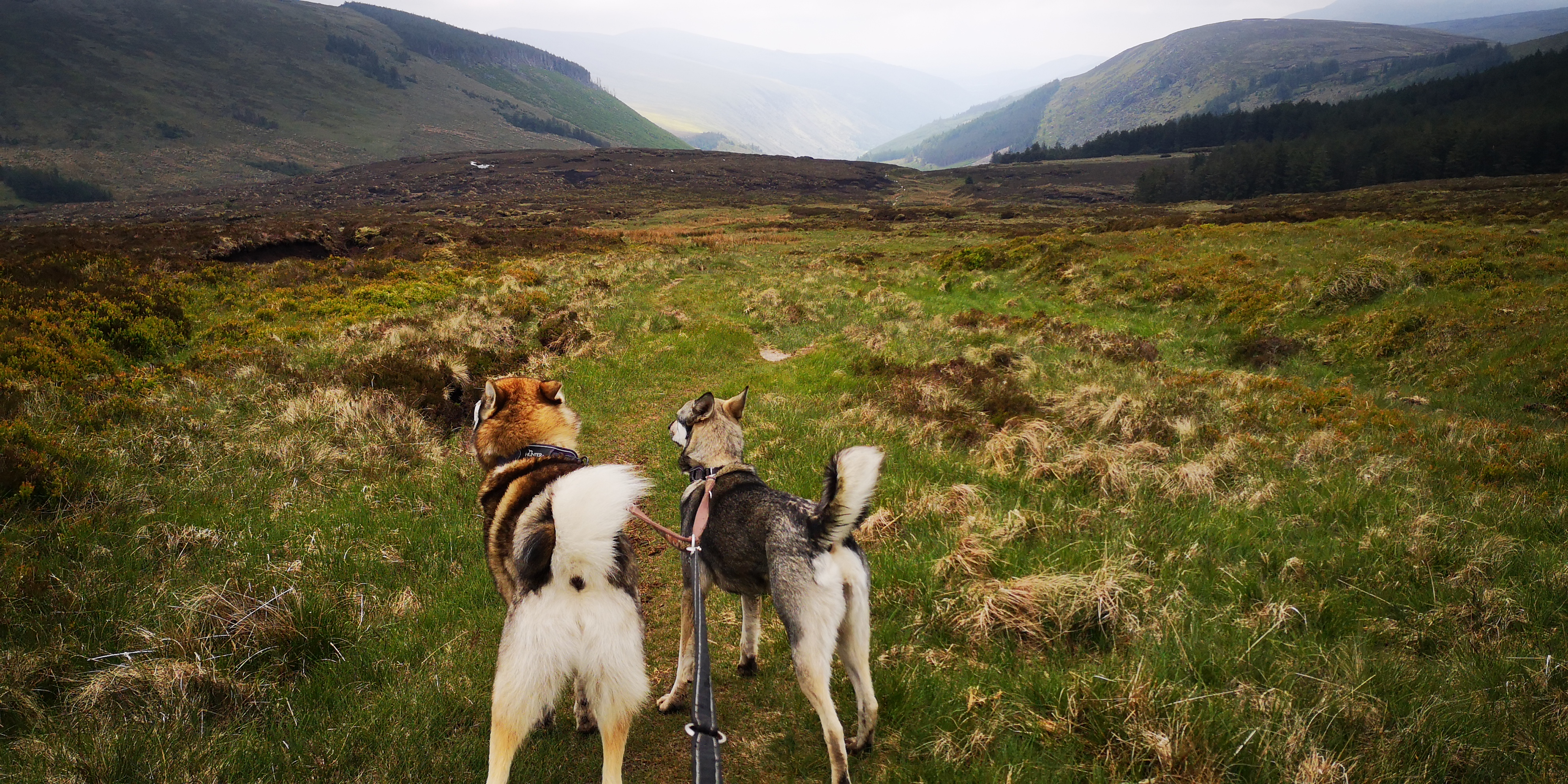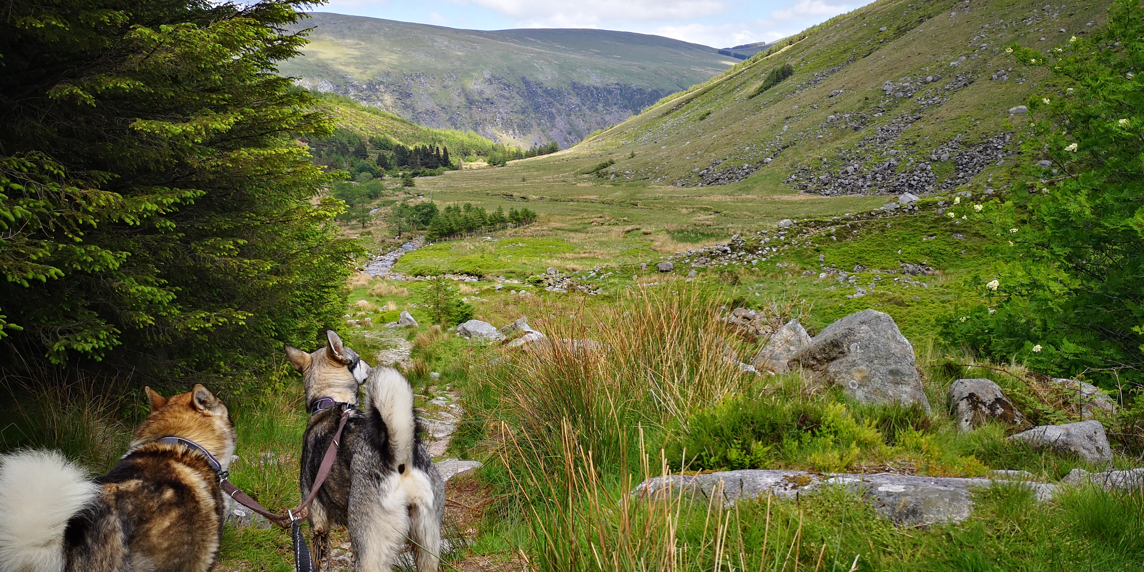 We lopen over een langgerekte helling, waar maar geen einde aan lijkt te komen. Het gras is zompig, en ik moet continu oppassen dat ik niet wegzak in de nattigheid en de modder. De modderspetters zitten sowieso al tot ver boven de knieën van mijn wandelbroek, die ik schoon had aangetrokken vanochtend. De wind is ijskoud en rukt aan mijn trui. Donkere wolken trekken over de heuvels. Ik stop en pak het fleecevest dat om mijn middel is geknoopt. Behalve mijn vest, zet ik ook een muts op en trek handschoenen aan. De honden staan met hun rug naar de wind gekeerd. De oren liggen plat op hun kop. Echt blij kijken ze niet. Een beetje wind vinden ze wel leuk, maar dit is iets teveel. ‘Nog een klein stukje,’ roep ik boven de wind uit. We bevinden ons op de Fraughan Rock Glen. Daarachter ligt de Lugnaquilla, die met haar 925 meter de hoogste berg van de Wicklow Mountains in het zuidoosten van Ierland is. Onder ons ligt een steil steenveld, waarover we geklommen zijn. We vervolgen ons pad rond de dotten heide en het zwarte zand. Zogauw we bovenaan de helling zijn, zien we nog meer uitgestrekte hellingen voor ons. Ik weet nu niet of we zicht hebben op de Lugnaquilla. Ik heb geen 4G bereik en zelfs GoogleMaps laat het afweten. Er zijn geen wandelbordjes die de route aangegeven, zoals in Engeland. De natuur is hier veel ruiger en de wandelpaden zijn soms nauwelijks zichtbaar. Er zijn ook minder mensen. Ik hoor stemmen, maar zie niemand. We lopen verder, en zie even later twee mensen met touwen aan de zijkant van een rots hangen. Ze lijken als twee kleine poppetjes in de verte, maar hun stemmen weerkaatsen tegen de rotswand. Er lopen talloze rivieren en watervallen over grote gladde stenen naar beneden. Mika en Moran drinken ervan. Het water ziet er koperkleurig uit. Hier en daar kom ik gekavelde stukken grond tegen. Ik weet dat hier gemijnd is, en ik vraag me af of er ook naar koper gedelfd is in deze regio. Boskap vindt er in ieder geval nog op grootschalig niveau plaats. Stukken naaldbos zijn als happen uit de heuvels genomen. Brede grindpaden lopen erlangs. In de verte zie ik een bordje staan, en we lopen ernaartoe. Ik lees dat er militaire oefeningen worden gehouden. Je mag er lopen, maar je wordt geadviseerd om geen militaire brokstukken aan te raken. ‘Nou jongens, het wordt tijd dat we teruggaan,’ zeg ik tegen de honden.
