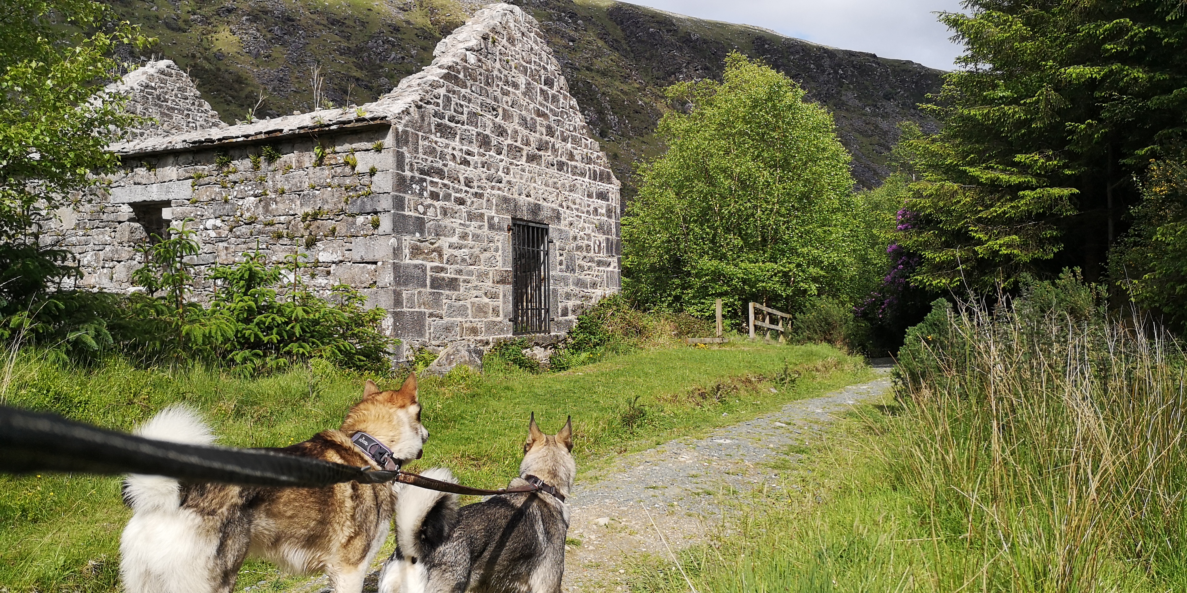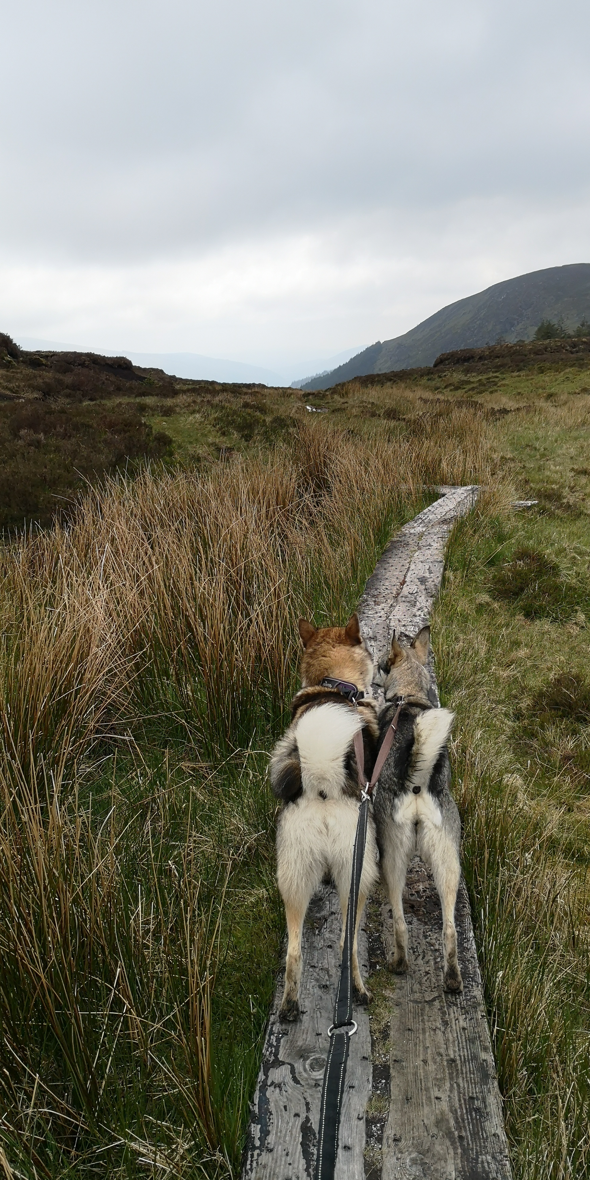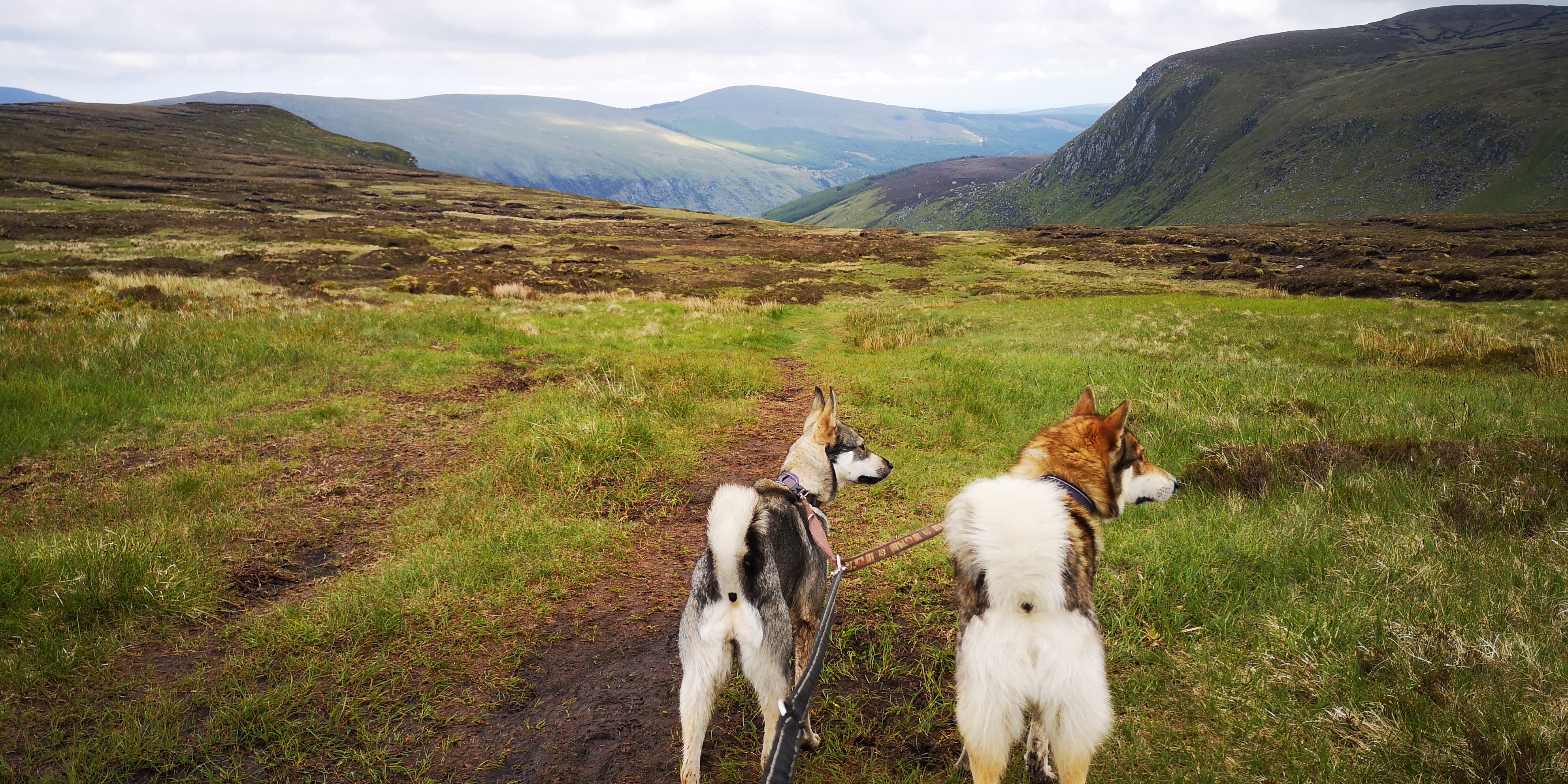 We lopen over een langgerekte helling, waar maar geen einde aan lijkt te komen. Het gras is zompig, en ik moet continu oppassen dat ik niet wegzak in de nattigheid en de modder. De modderspetters zitten sowieso al tot ver boven de knieën van mijn wandelbroek, die ik schoon had aangetrokken vanochtend. De wind is ijskoud en rukt aan mijn trui. Donkere wolken trekken over de heuvels. Ik stop en pak het fleecevest dat om mijn middel is geknoopt. Behalve mijn vest, zet ik ook een muts op en trek handschoenen aan. De honden staan met hun rug naar de wind gekeerd. De oren liggen plat op hun kop. Echt blij kijken ze niet. Een beetje wind vinden ze wel leuk, maar dit is iets teveel. ‘Nog een klein stukje,’ roep ik boven de wind uit. We bevinden ons op de Fraughan Rock Glen. Daarachter ligt de Lugnaquilla, die met haar 925 meter de hoogste berg van de Wicklow Mountains in het zuidoosten van Ierland is. Onder ons ligt een steil steenveld, waarover we geklommen zijn. We vervolgen ons pad rond de dotten heide en het zwarte zand. Zogauw we bovenaan de helling zijn, zien we nog meer uitgestrekte hellingen voor ons. Ik weet nu niet of we zicht hebben op de Lugnaquilla. Ik heb geen 4G bereik en zelfs GoogleMaps laat het afweten. Er zijn geen wandelbordjes die de route aangegeven, zoals in Engeland. De natuur is hier veel ruiger en de wandelpaden zijn soms nauwelijks zichtbaar. Er zijn ook minder mensen. Ik hoor stemmen, maar zie niemand. We lopen verder, en zie even later twee mensen met touwen aan de zijkant van een rots hangen. Ze lijken als twee kleine poppetjes in de verte, maar hun stemmen weerkaatsen tegen de rotswand. Er lopen talloze rivieren en watervallen over grote gladde stenen naar beneden. Mika en Moran drinken ervan. Het water ziet er koperkleurig uit. Hier en daar kom ik gekavelde stukken grond tegen. Ik weet dat hier gemijnd is, en ik vraag me af of er ook naar koper gedelfd is in deze regio. Boskap vindt er in ieder geval nog op grootschalig niveau plaats. Stukken naaldbos zijn als happen uit de heuvels genomen. Brede grindpaden lopen erlangs. In de verte zie ik een bordje staan, en we lopen ernaartoe. Ik lees dat er militaire oefeningen worden gehouden. Je mag er lopen, maar je wordt geadviseerd om geen militaire brokstukken aan te raken. ‘Nou jongens, het wordt tijd dat we teruggaan,’ zeg ik tegen de honden.