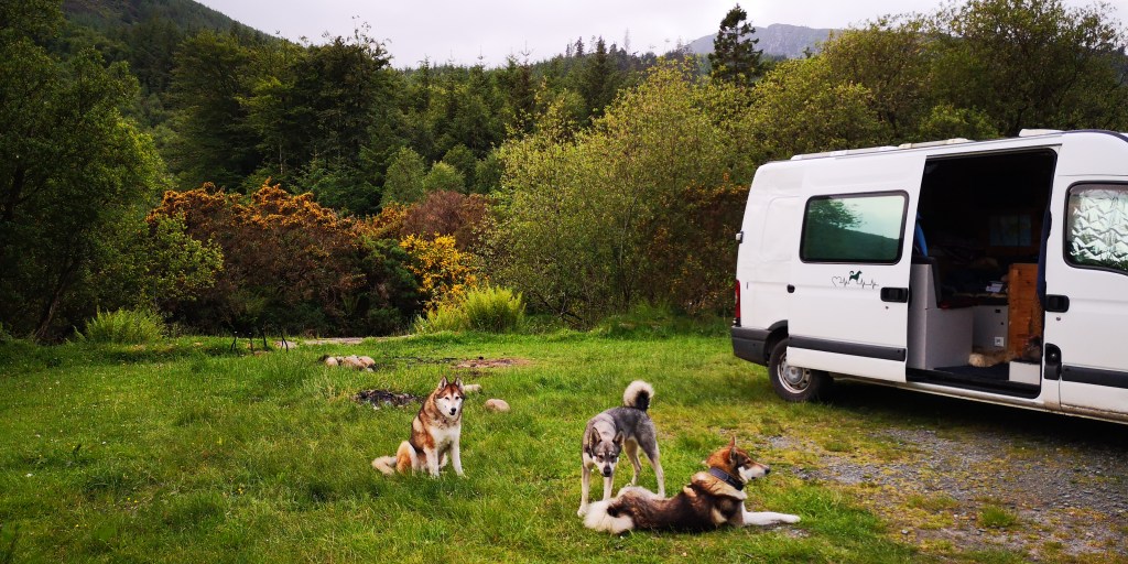 De bus staat wederom geparkeerd aan het einde van een weggetje, dit keer op Baravore Car Park in Wicklow Mountains. De Wicklow Mountains liggen ten zuiden van Dublin. Ik ben via de R756 door het gebied gereden, en de uitzichten waren adembenemend. Vanuit de bus hebben we een doorkijk met aan weerskanten langgerekte heuvels. De wanden zijn steil en bestaan vooral uit steenvelden en bremstruiken. De honden liggen op het gras in de zon. Zij lijken ook te genieten van het uitzicht. Achter de bus stroomt een klein watervalletje. Alles voelt heel vredig. Asn het begin van de avond druppelen nog wat campers het terrein op. Het zijn allemaal oude logge campers, en ik verbaas me dat ze over het nauwe weggetje durven te rijden. Ze hebben allemaal een Iers kenteken. Tot nu toe ben ik nog geen enkele andere buitenlandse toerist tegengekomen. Maar vannacht staan we in ieder geval niet alleen.