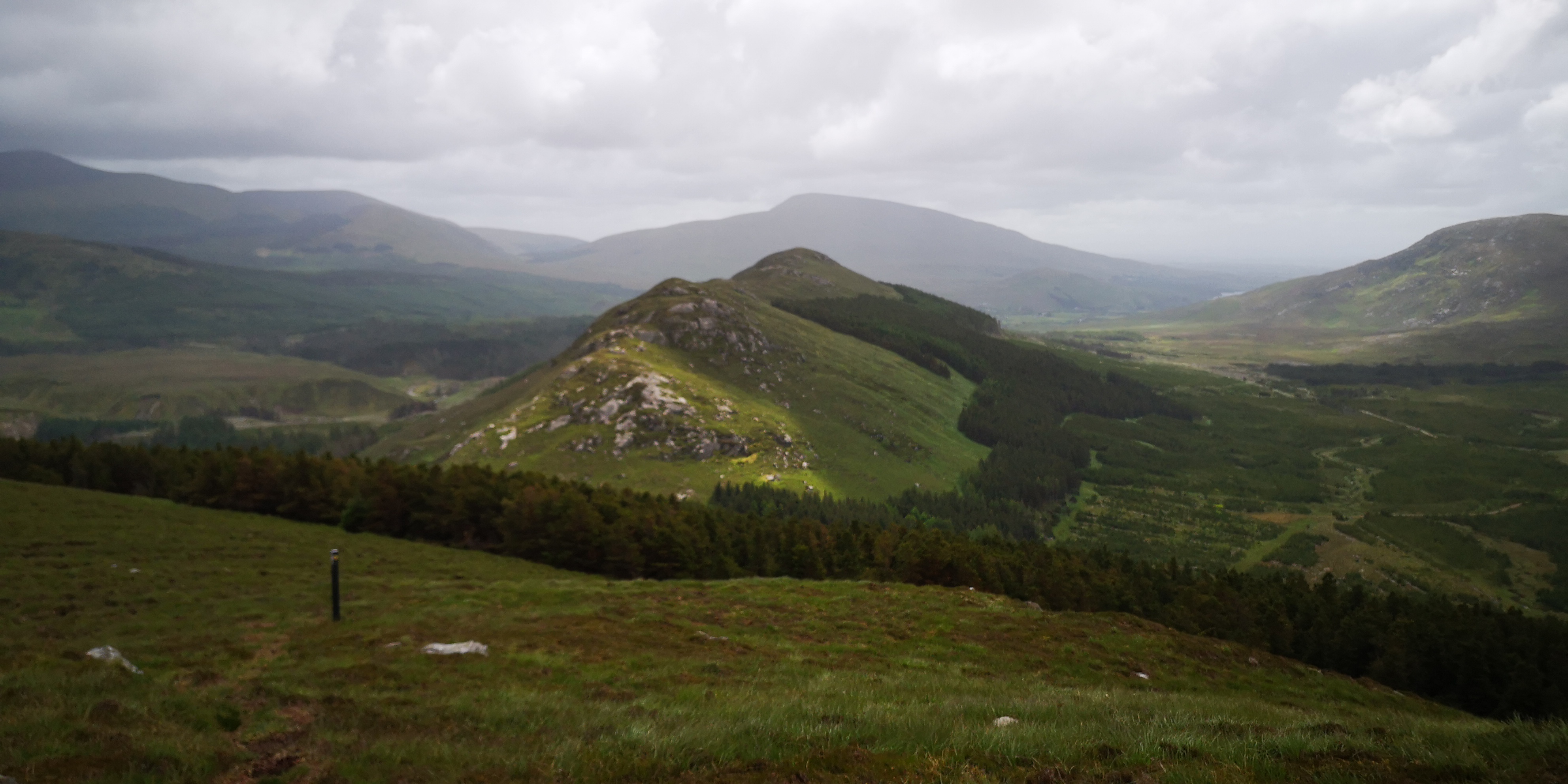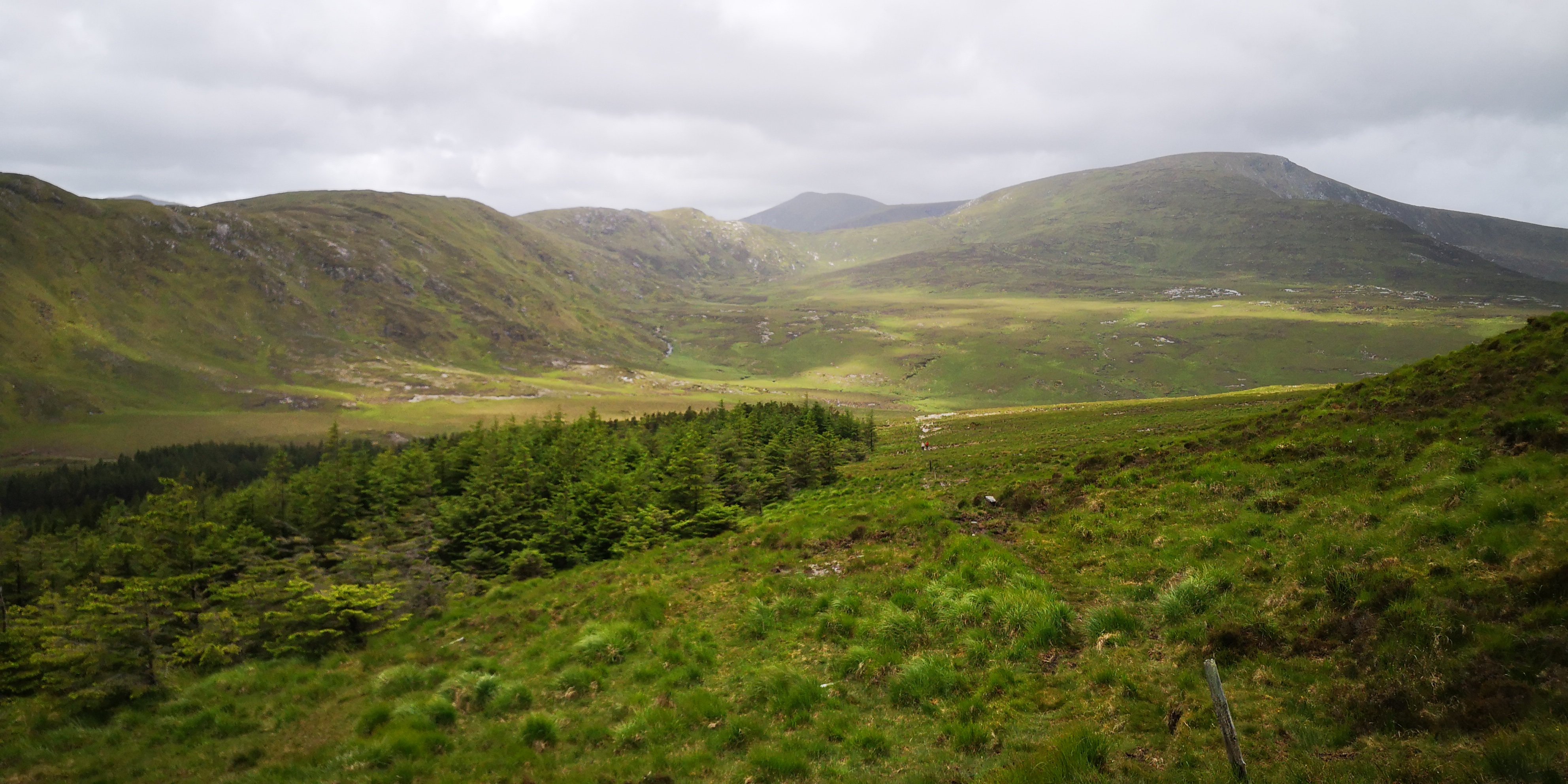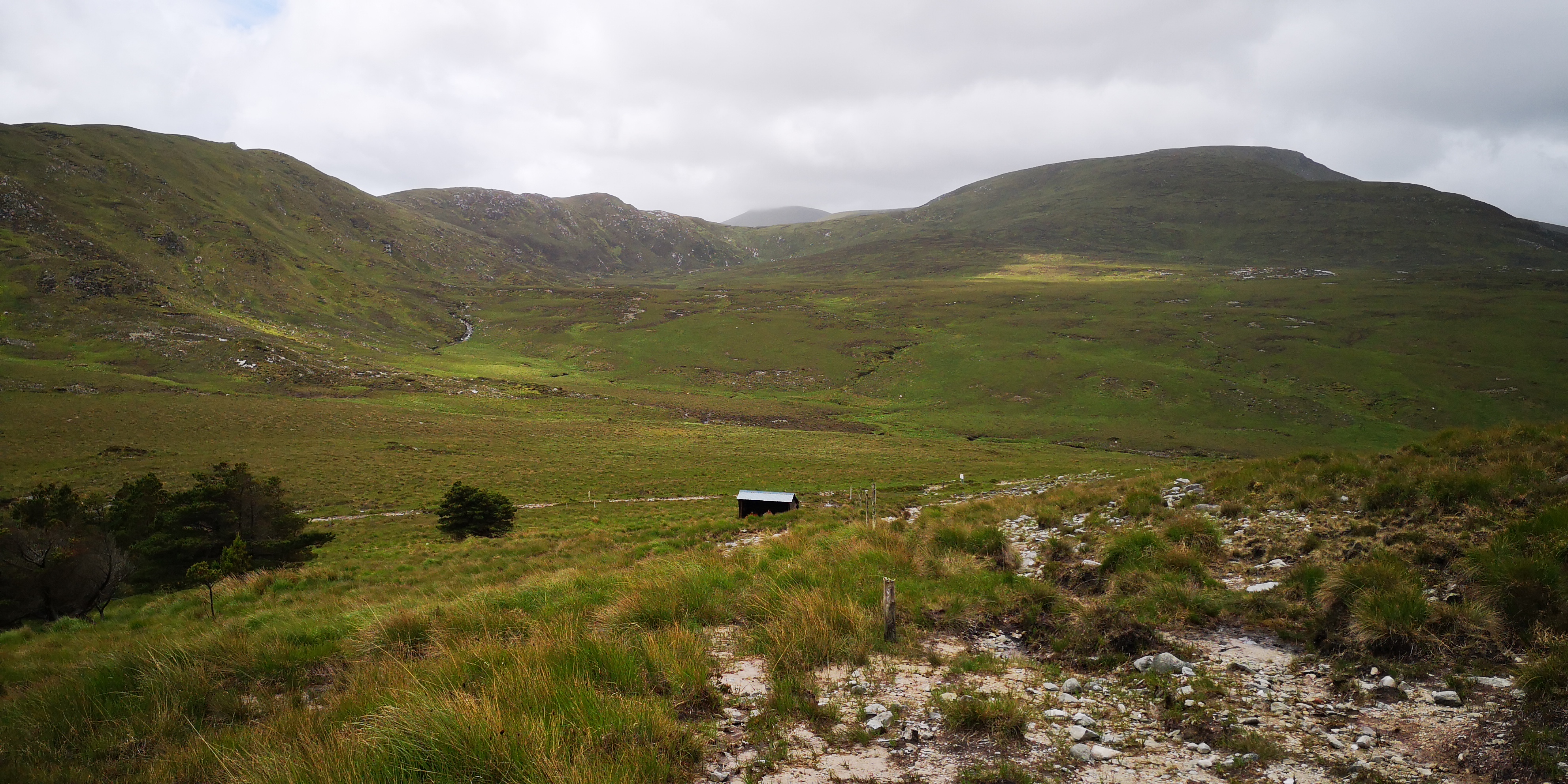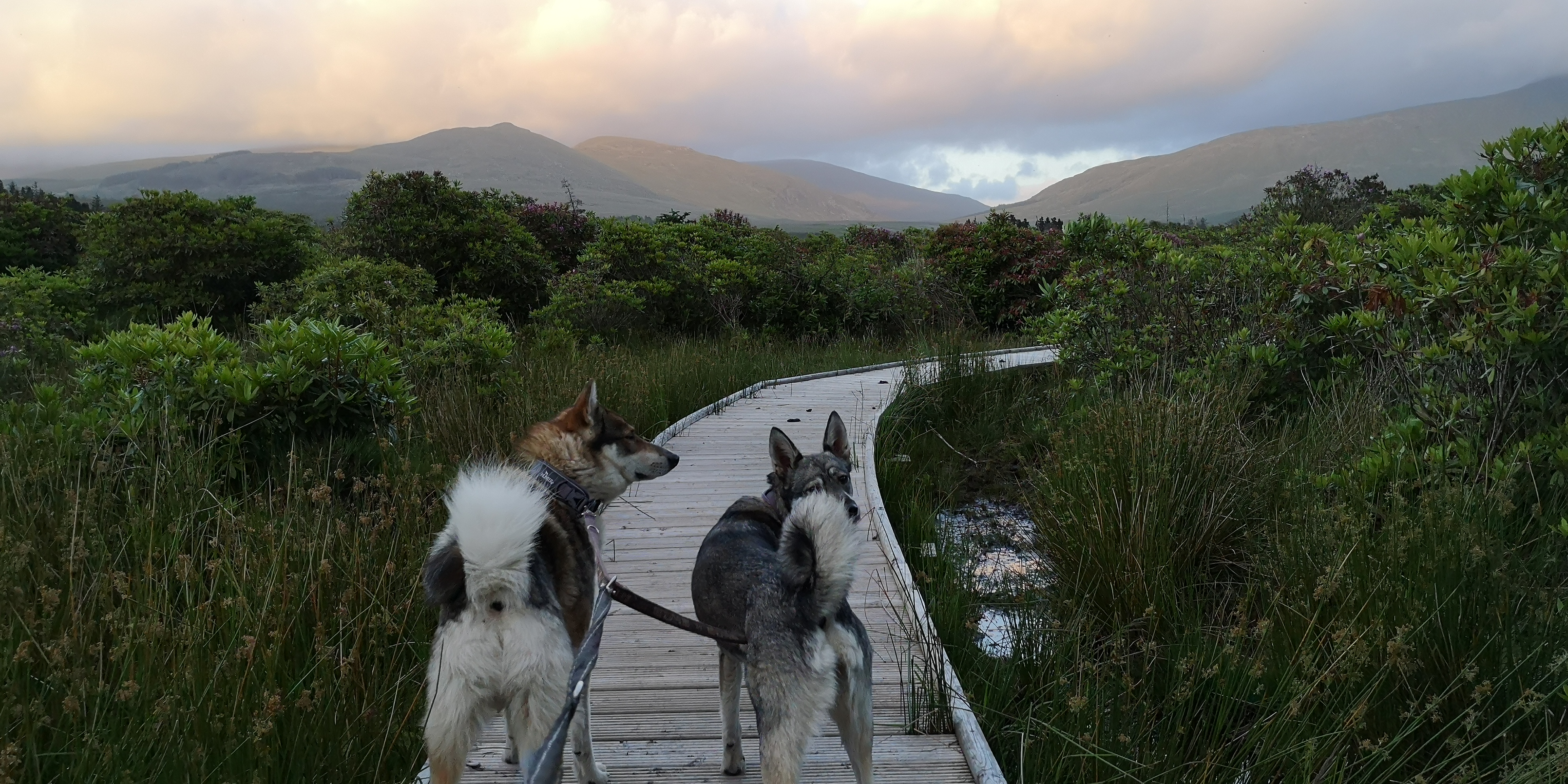We lopen over een modderig pad, dat af en toe nauwelijks zichtbaar is. We zakken weg in de diepe veengrond, en ik voel de kou van het water alweer binnendringen in mijn schoenen. Soms regent het even lichtjes, maar daarna komt de zon weer tevoorschijn en verlicht de bergen om ons heen. We lopen in de wildernis van Wild Nephin, en het voelt alsof we ver weg van de bewoonde wereld zijn. Dat is eigenlijk ook zo. De bus staat geparkeerd op een klein parkeerplaatsje bij waar de Letterkeen Loop Trail Head begint. Er zijn drie gemarkeerde routes, en wij hebben voor de paarse gekozen, die dwars over de top van de Letterkeen loopt. Vanaf daar hebben we prachtig zicht op de Nephin Beg Mountains tegenover ons. De bergen lijken tot in het oneindige door te lopen. Verder is er niks: geen mensen, geen huizen, alleen maar wildernis: bergen, kliffen, venen en rivier valleien. Het liefst zou ik nog willen doorlopen, maar we hebben er alweer twee uur opzitten, en het kost ons nog minstens een uur om terug bij de bus te komen. Mika en Moran kijken nog steeds uit over de bergen. Ook zij lijken altijd weer te genieten van het uitzicht. Hun poten en buik zitten onder de modder. Ik zie dat ze magerder worden. De ribben zijn inmiddels zichtbaar bij Moran. Daarachter haar gespierde dijen en billetjes. We maken dagelijks flinke wandelingen en klimpartijen over de bergen. Ik ben zelf ook afgevallen, maar dat is niet zo erg. Die tien kilo van mijn overwintertijd in het bakhuisje kan er prima af. Ik voer de honden flink wat bij de afgelopen weken, maar toch vallen ze af. De wind is koud bovenop de Letterkeen. ‘Kom jongens, we gaan weer.’ Voorzichtig dalen we het steile gladde pad naar beneden af.