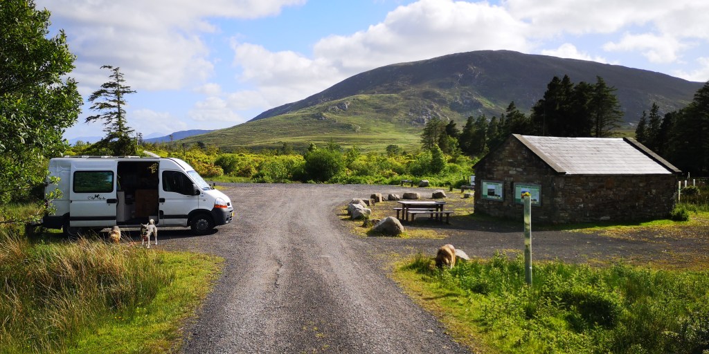 Op de parkeerplaats is maar ruimte voor twaalf auto’s. Er staan er acht wanneer wij halverwege de middag terugkomen. Het schijnt dat dit natuurgebied vrij onbekend is, en er komen weinig toeristen. Ik smeer dik boter op grote plakken volkorenbrood, en geef dit aan de honden. Daarnaast krijgen ze weer extra brokken. Om zes uur vertrekt de laatste auto, en blijven we alleen achter. Nu heb ik wel vaker alleen gestaan op afgelegen plekken, maar het voelt toch altijd weer even verlaten. Er is geen bewoning in de buurt, en ik heb zelfs geen 4G bereik. Het is alsof ik even van de wereld ben: klein, nietig en onbelangrijk. Maar ik maak wel deel uit van dit natuurlijk geheel, waar mijn plek zichtbaar en passend is. Op zulke momenten ben ik ook dankbaar voor het gezelschap van mijn honden. Zij delen deze plek en reis met mij. Ik kook een potje rijst met witte bonen in tomatensaus met veel gesmolten kaas, en eet het zittend in de deuropening van de bus. We horen het ruisen van de rivier, die naast de parkeerplaats loopt. De zon verdwijnt langzaam achter de Letterkeen.