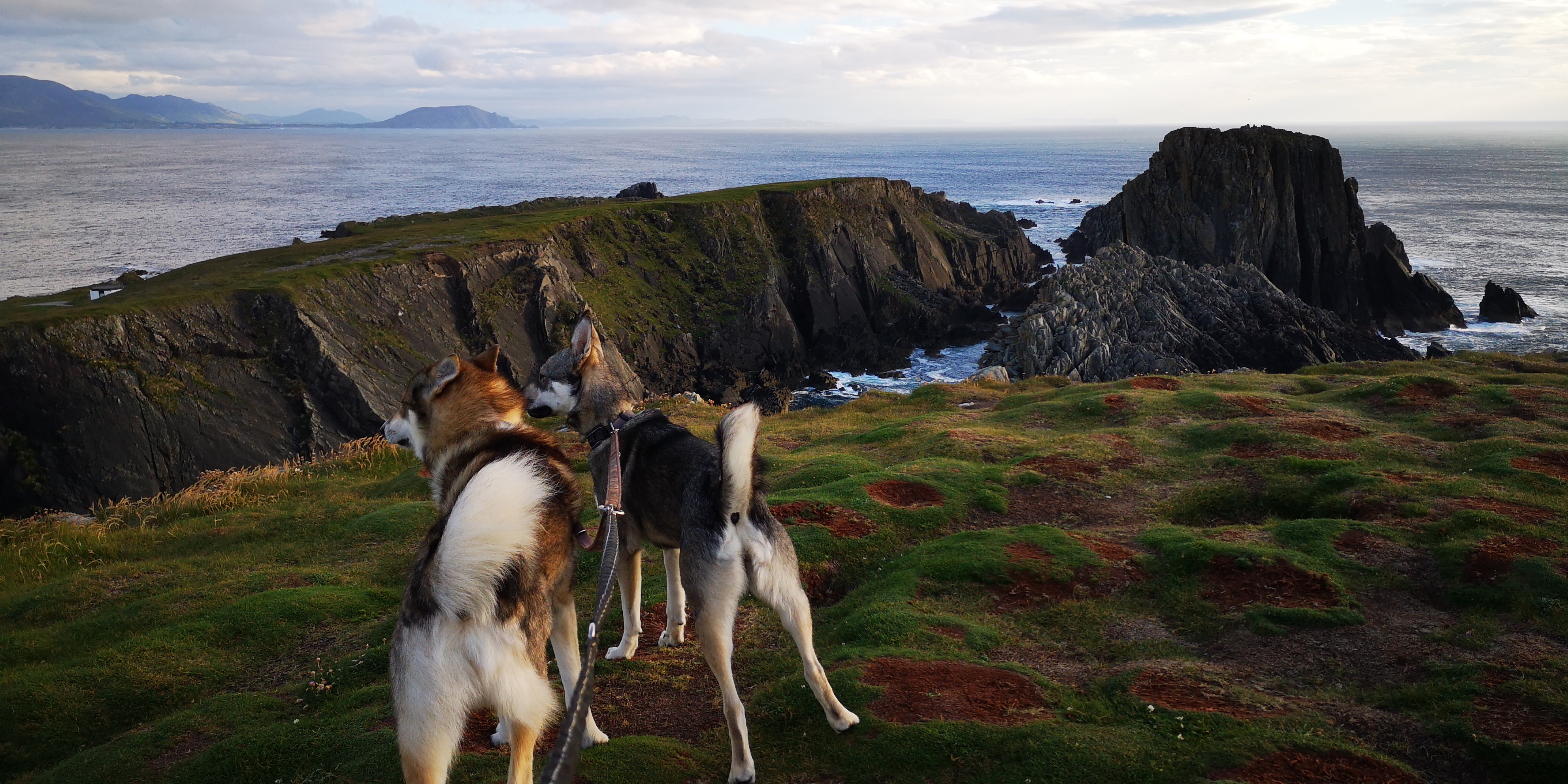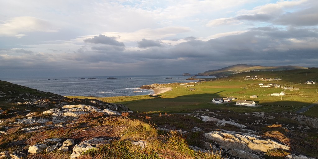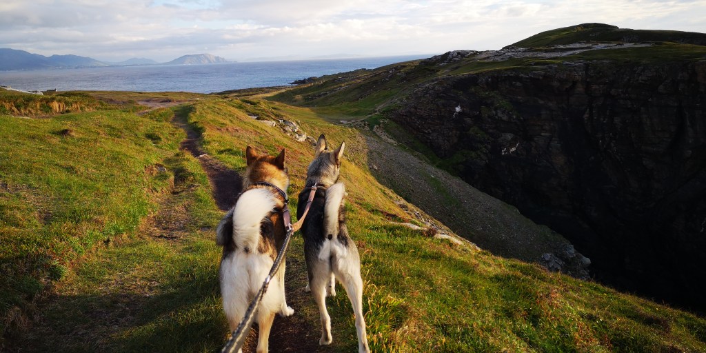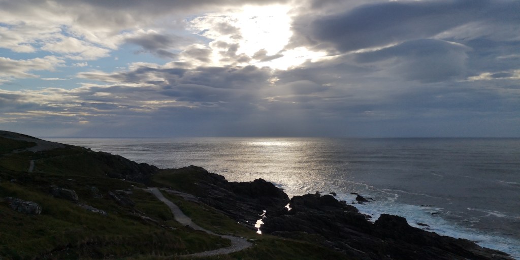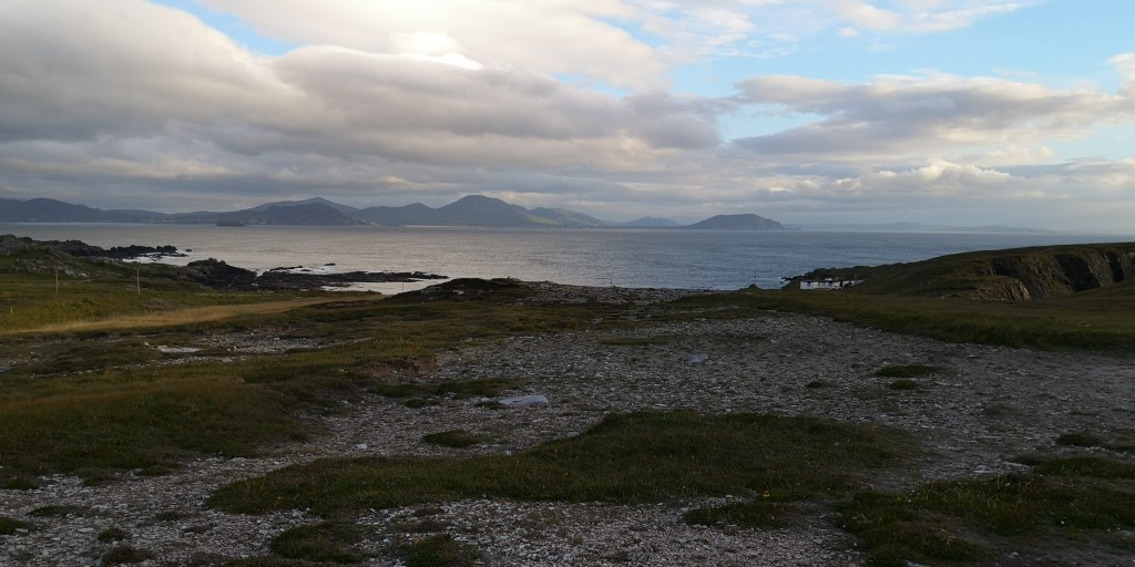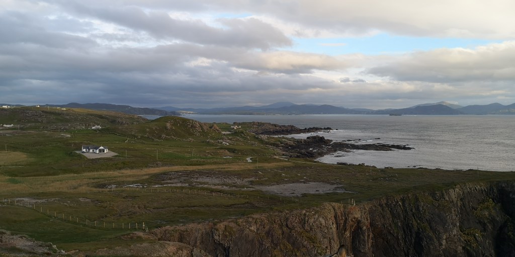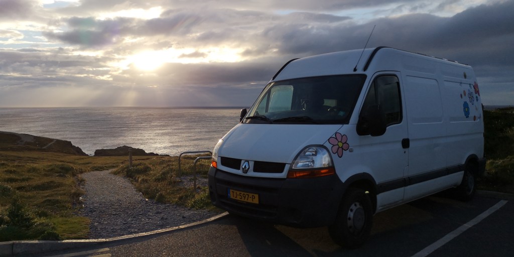 We rijden door de kop van Inishowen Peninsula, het meest noordelijke schiereiland van Ierland. Malin Head is daar weer een landtong van, en ik verwachtte het er erg toeristisch zou zijn, maar dat valt gelukkig mee. Er is niet meer ruimte dan voor tien auto’s op het krappe parkeerplaatsje, maar ik heb het geluk dat ik nog net in een hoekje kan parkeren met uitzicht op de kliffen en de zee. Samen met de honden loop ik een rondje naar Hell’s Hole, een grote rotsspleet in de kliffen waar de golven woest tegenaan beuken. Aan de andere kant, op het uiterste puntje van de landtong staat een stenen toren, die ooit diende als wachttoren voor het geval Napoleon het land wilde binnenvallen. Later werd het ingezet als communicatietoren, die de weersvoorspellingen aan de schepen doorgaf. ‘Het is hier meestal erg druk hoor,’ zegt het meisje, dat in een kraampje naast de toren staat. Ze verkoopt koffie, thee en wat zelfgebakken cakejes en scones. ‘Waar parkeren al die mensen hun auto dan?,’ vraag ik verbaasd. ‘Op de meest gekke plekken, zoals bovenop de rotsen, zo schuin dat ze bijna omvallen.’ Om zes uur vertrekt de laatste auto en blijven we helemaal alleen achter op het meest noordelijke puntje van Ierland. Het waait hard en de bus schudt heen en weer. Ik denk terug aan een paar weken geleden toen we ingeblikt tussen allemaal andere campers op Mizen Head stonden, het meest zuidwestelijke puntje van Ierland. Wat een verschil met toen.