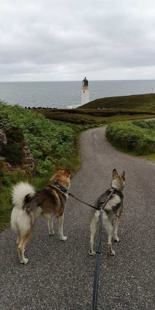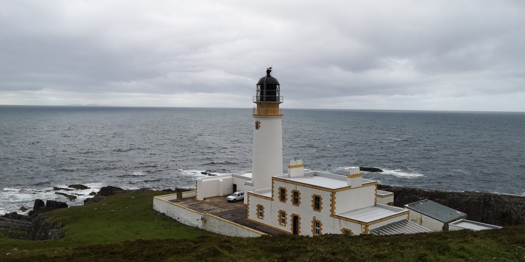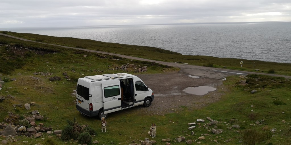 Het regent keihard. Het klettert op het dak van de bus en het water stroomt in golven over de parkeerplaats. Terwijl het er gisteren nog mooi en idyllisch uitzag, ziet alles er nu grauw en deprimerend uit. De bergen van Torridon zijn gehuld in donkergrijze bewolking. De honden weigeren te plassen in deze harde regen dus ik start de motor en we rijden de parkeerplaats af. Voorzichtig draai ik door de bochten van het kleine weggetje en kom uiteindelijk weer terug op de A896, en gaan we richting de kust. De Rua Reidh Lighthouse ligt natuurlijk ook weer aan het einde van een klein weggetje. Borden waarschuwen voor ‘weak bridges’ en dat je voertuig niet breder dan twee meter twintig, niet langer dan zeven meter twintig en niet zwaarder dan zeven en een halve ton mag zijn. Daar voldoet mijn bus allemaal aan, maar de bochten zijn erg nauw en steil, en ik adem opgelucht wanneer ik het kleine parkeerplaatsje bij de vuurtoren indraai. De vuurtoren valt onder particulier eigendom, maar is van een afstandje te bewonderen. Het is wit geschilderd met geel geblokte omlijstingen rondom de ramen en hoeken van het gebouw. De toren steekt dramatisch af tegen de donkere lucht, de puntige zwarte rotsen en het witte schuim van de donkere golven eromheen. Ik sta tot mijn verbazing helemaal alleen op het parkeerplaatsje, maar het is dan ook wel erg afgelegen.