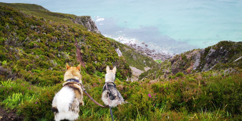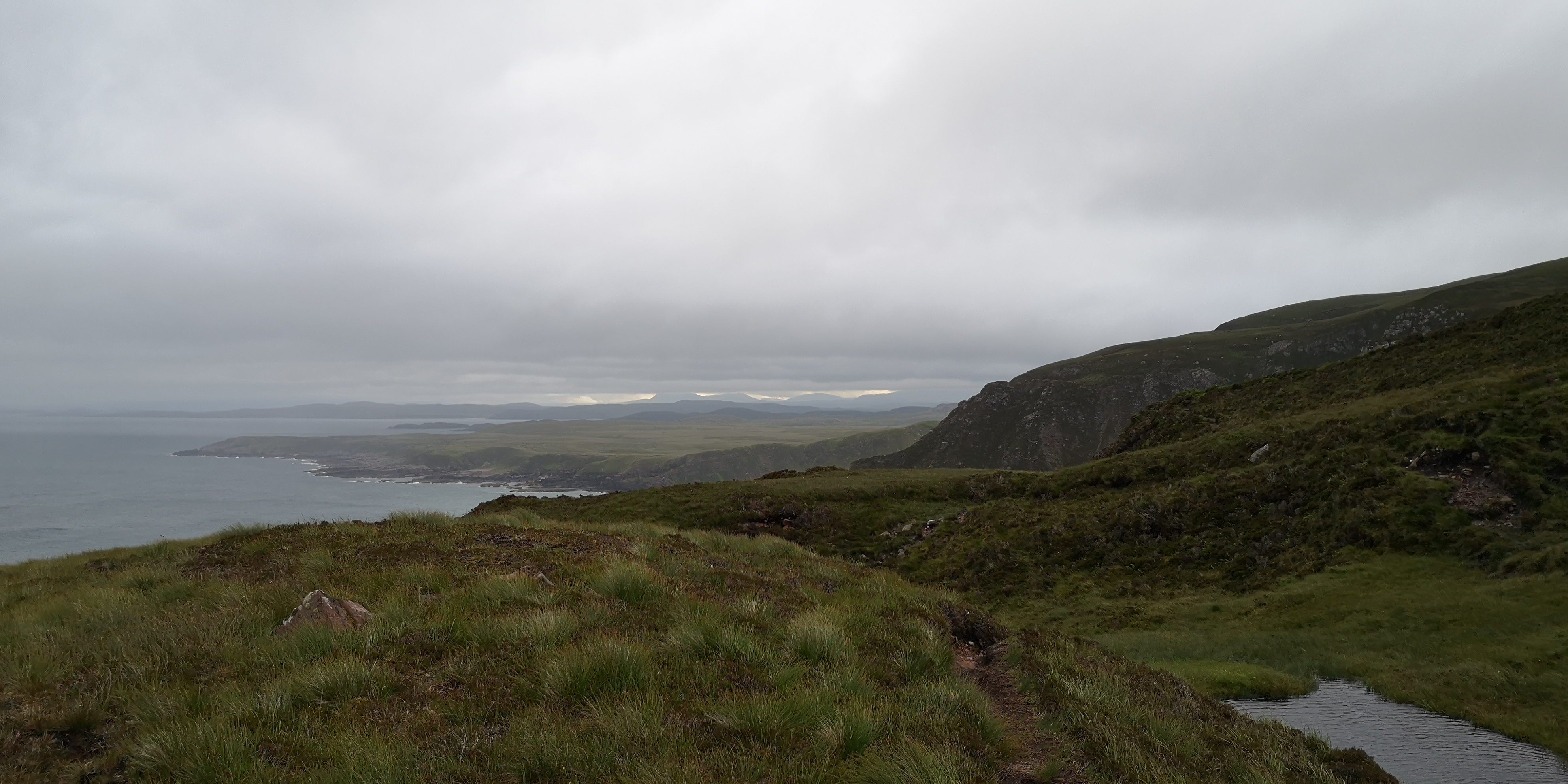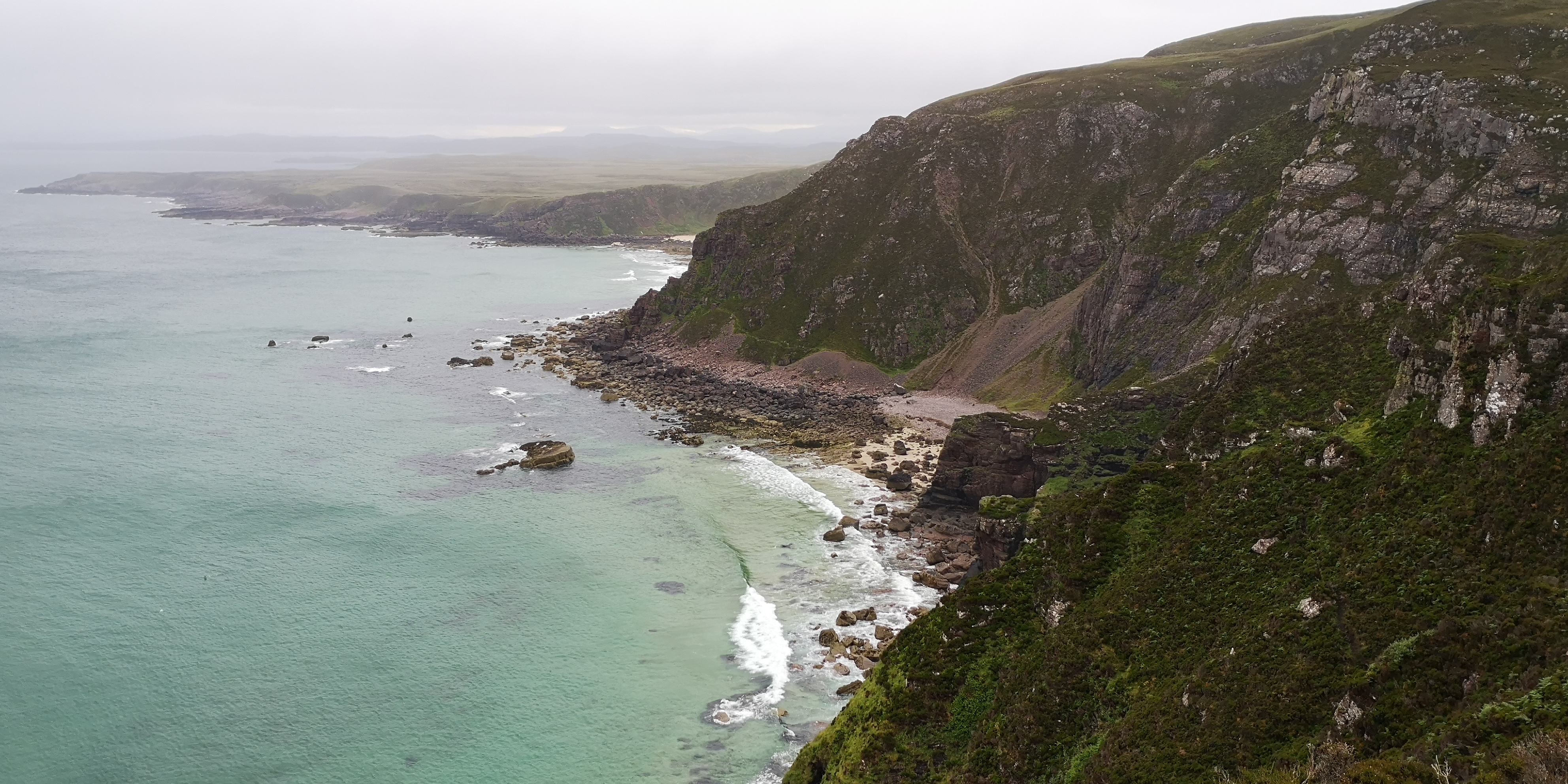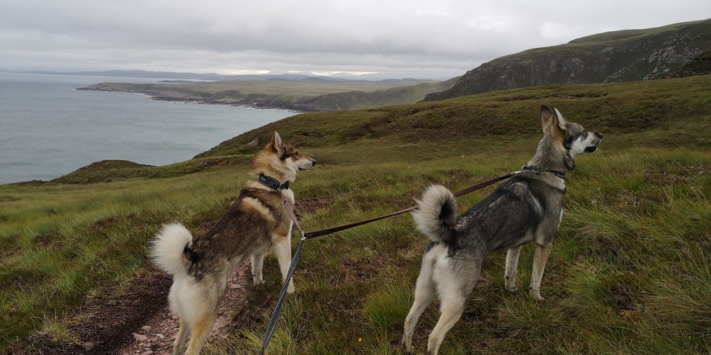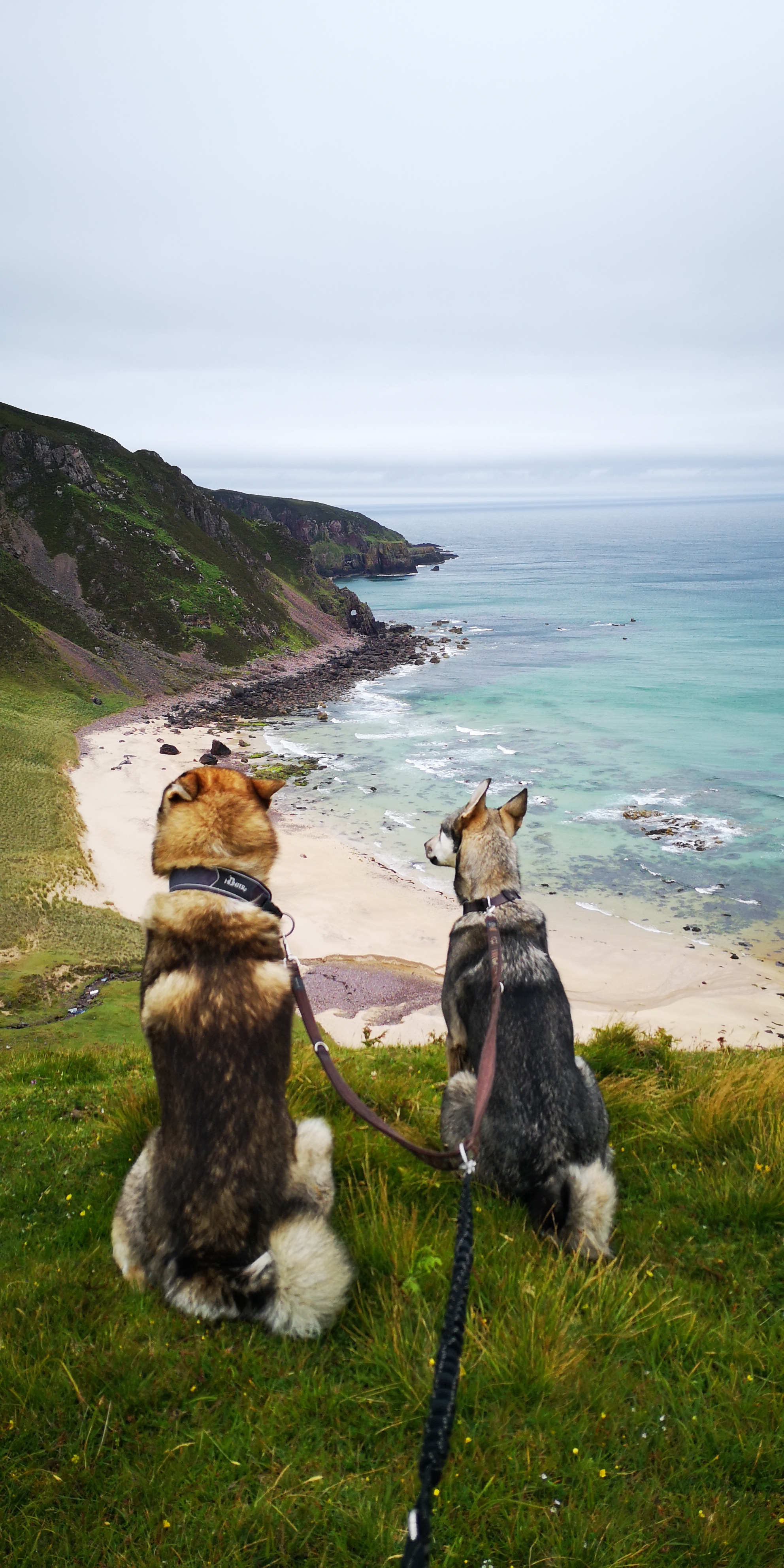 Ik kijk opzij van het pad langs een steile stenen afgrond. Deze loopt de diepte in en eindigt bij de rotsen in de zee. Boven ons zijn ook alleen maar steile rotswanden te zien. Het pad loopt langs de klifhelling en is niet meer dan dertig centimeter breed. ‘Dit kan niet goed zijn,’ besef ik me. Ergens hebben we een verkeerde afslag genomen op het kustpad richting Camus Mor. ‘Blijf hoog op de kliffen lopen,’ had de zoon van de vuurtoren mevrouw nog zo gezegd. Mika en Moran zijn gekoppeld aan de heupriem en lopen achter mij. Ik kan nauwelijks keren, en besluit het laatste stuk dan ook maar naar beneden te lopen. Soms moet ik zittend van een grote rots naar beneden glijden. Loszittende stenen beginnen te rollen en vallen met dof gebonk langs de kliffen. Ik laat de heupriem zoveel mogelijk vieren, zodat de honden voldoende ruimte hebben om te kunnen volgen. Ze voelen mijn gespannenheid en houden zich muisstil. We eindigen op een klein stenen strandje aan zee. Ik realiseer me dat White Sand Beach achter de volgende klif moet liggen. Ik zie een klein paadje halverwege de klif lopen. ‘Nu we zover gekomen zijn, kunnen we dat laatste stukje ook net zo goed doen.’ De honden kijken me vol vertrouwen aan, en volgen me op de voet. Vol goede moed klim ik weer stapje voor stapje omhoog. Ik probeer zo min mogelijk in de diepte te kijken en concentreer me op het paadje voor me. Ik pers me langs de uitstekende punten van de rotswand en grijp met elke stap heidetakken vast die langs de rotswand groeien. Langzaam komt het strand van White Sand Beach in zicht. Het is nog maar een klein stukje, maar dan is er een stuk pad voor me dat uit een richeltje op een stenen wand bestaat. Ik moet minstens drie meter te zien overbruggen, en probeer op allelei mogelijke manieren te bedenken hoe ik die stappen kan zetten. Maar dan kijk ik naar Mika en Moran achter me. ‘Dit is te gevaarlijk,’ besluit ik. Langzaam draai ik me om en stap voorzichtig over de honden heen. Met het hart in mijn keel begin ik aan de terugweg. Deze kost minstens een half uur, en in totaal zijn we een uur kwijt met die verkeerde afslag. Trillend van vermoeidheid sta ik uiteindelijk weer bovenop de klif. ‘Maar toch wil ik nu naar White Sand Beach,’ houd ik stug vol, en we vervolgen onze weg bovenop de kliffen. Het pad is lang niet altijd zichtbaar, en vaak zakken we weg in de modder en nattigheid. Af en toe worden we geteisterd door regengordijnen gedragen op de harde windvlagen. We dalen weer een stukje naar beneden en zien het strand, dat grotendeels verborgen ligt tussen de zachtglooiende met groen bedekte rotsen. Daarachter is de landtong met uitgestrekte graslanden en meren. Wat een leegte, maar dan vol met natuur.