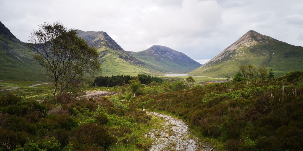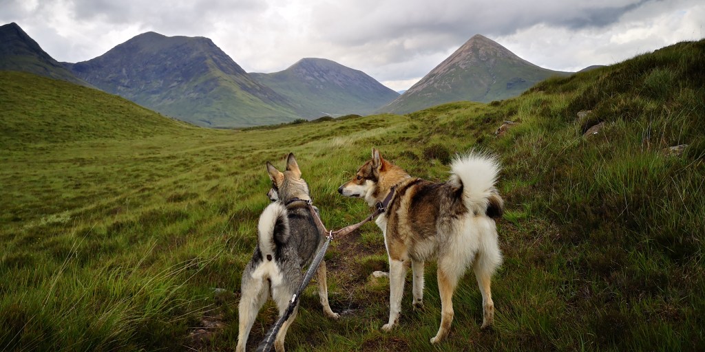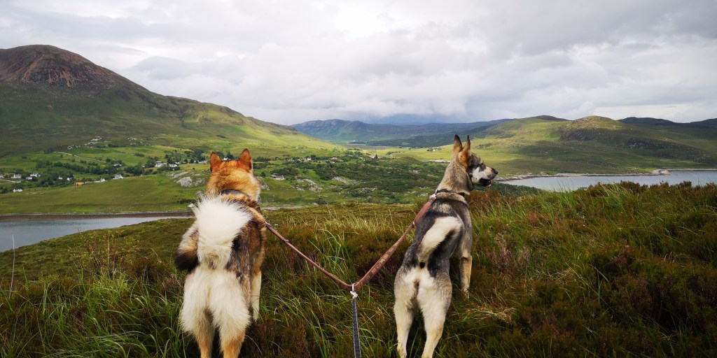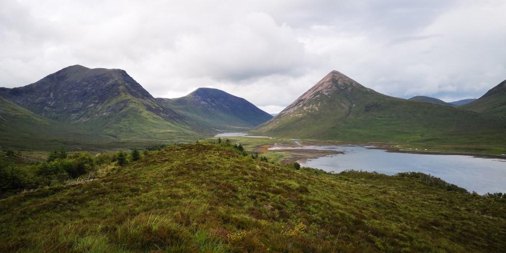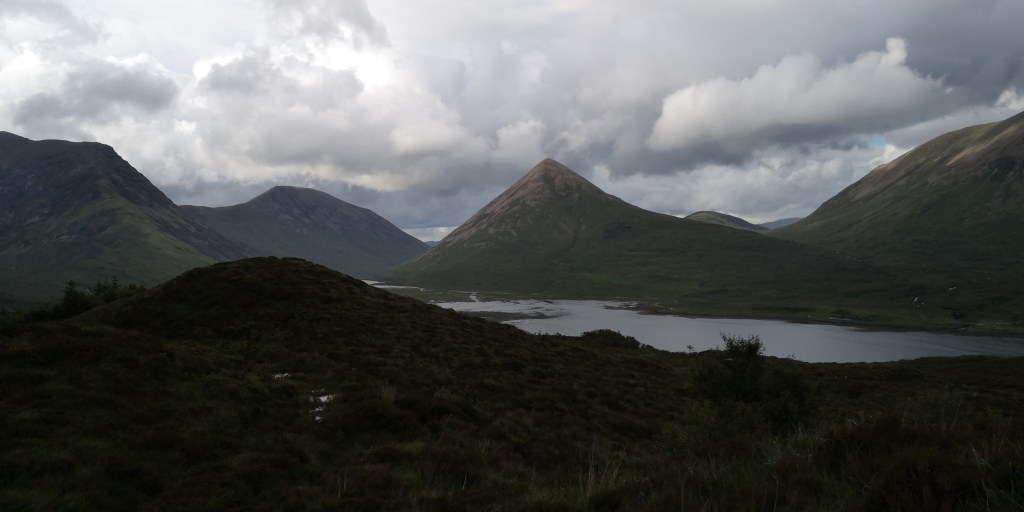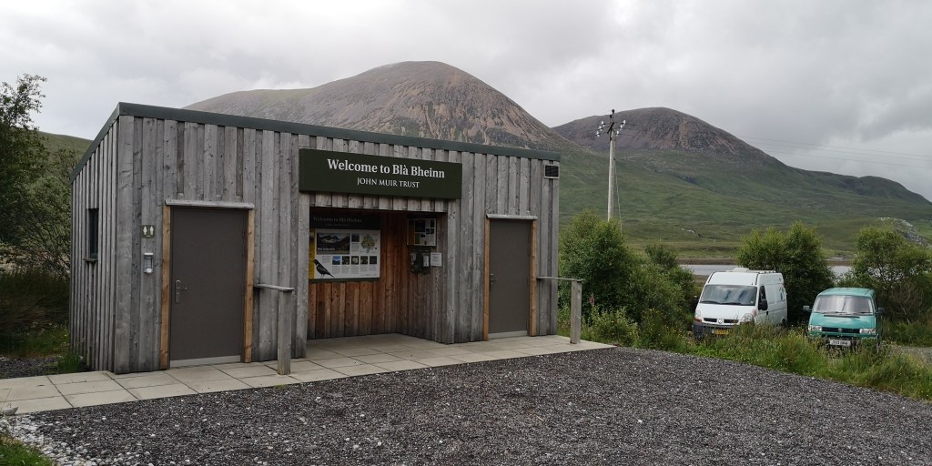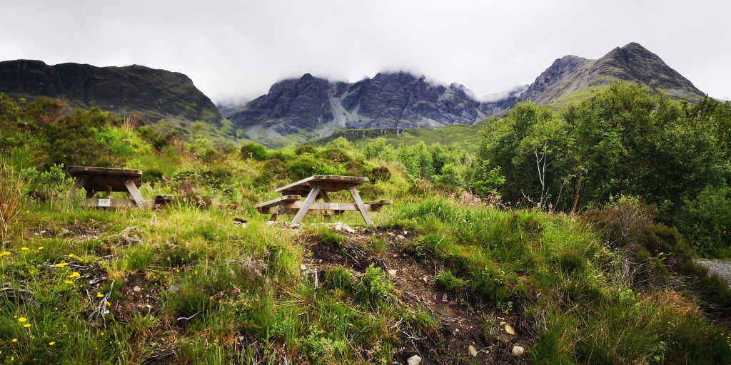 Diep teleurgesteld verlaat ik Achintee Road Car Park. Al jaren had ik het plan om ooit de Ben Nevis, de hoogste berg van Schotland, te lopen. De wandelkaart van de berg lag al die tijd in een la van de boekenkast op de logeerkamer. De afgelopen twee jaar ligt de kaart in het mandje onder de voorstoel in de bus. Gisteravond had ik hem weer tevoorschijn gehaald. Nu was het eindelijk zo ver. Maar het weer gooit roet in het eten. Het regent vrijwel continu, en volgens de weersvoorspellingen blijft het zo voor de rest van de week. De berg is gehuld in dikke bewolking. De dichtstbijzijnde parkeerplaats aan Achintee Road staat ondanks het slechte weer helemaal vol. Toevallig reed er net een camper weg, en kon ik zijn plekje innemen, maar de auto’s staan dicht op elkaar en er was nauwelijks ruimte voor de honden om even buiten naast de bus te staan. Om hier nu dagenlang op beter weer te wachten zie ik echt niet zitten, maar ik baal ontzettend en het duurt even voordat ik weer kan genieten van het landschap om mij heen. Ik besluit om helemaal door te rijden naar Cullin Hills op Isle of Skye. We rijden langs talloze meren, bergen en rivieren. Hele stukken ervan zijn onbewoond. Het weer blijft wisselvallig en meestal is alles bedekt onder een dikke laag bewolking, en heel soms komt de zon even tevoorschijn en verlicht de toppen van de bergen aan de overkant van een meer. Via Skye Bridge komen we een aantal uren later op Skye aan, en sla ik bij Broadford een klein weggetje, de B8083, in. Het is toch altijd weer een gok om te zien waar je terrecht komt: is er nog plek?, mag je er overnachten?, en zijn er wandelroutes waar de honden ook mogen lopen? Even schrik ik en denk dat de hekken van Bla Bheinn Car Park gesloten zijn, maar dat is gelukkig niet het geval. Er staan hoge hekken aan weerskanten van het wildrooster, dat toegang verleent tot de parkeerplaats. Het is speels ingedeeld met hier en daar kleine plateaus om te parkeren. Er is veel begroeiing aan de zijkanten en er staat een toilethuisje in het midden. Ik parkeer in een hoekje, waar lang gras, heide en wilgen staan, met uitzicht op de Bla Beinn, de hoogste berg van Skye. De toilet is niet aangesloten op het riool, maar bestaat uit een gat in de grond, waar af en toe wat zaagsel wordt bijgegooid. Aan de achterkant van het houten toilethuisje is een regenton met een kraantje, maar het is helaas geen water geschikt om te drinken. Dat is jammer, want mijn watervoorraad begint op te raken, en ik had graag mijn jerrycans willen bijvullen. Er staan ook geen vuilnisbakken. Steeds vaker zie ik een bordje waarop staat dat je je vuilnis mee naar huis moet nemen. Dat is op zich geen probleem, zij het dat ik al bijna twee maanden op reis ben. Ik heb inmiddels al een paar kleine gevulde vuilniszakjes achterin de bus liggen, en het begint een beetje te ruiken. Dat zijn een paar van de ongemakken waar je als nomadereiziger tegenaan loopt.