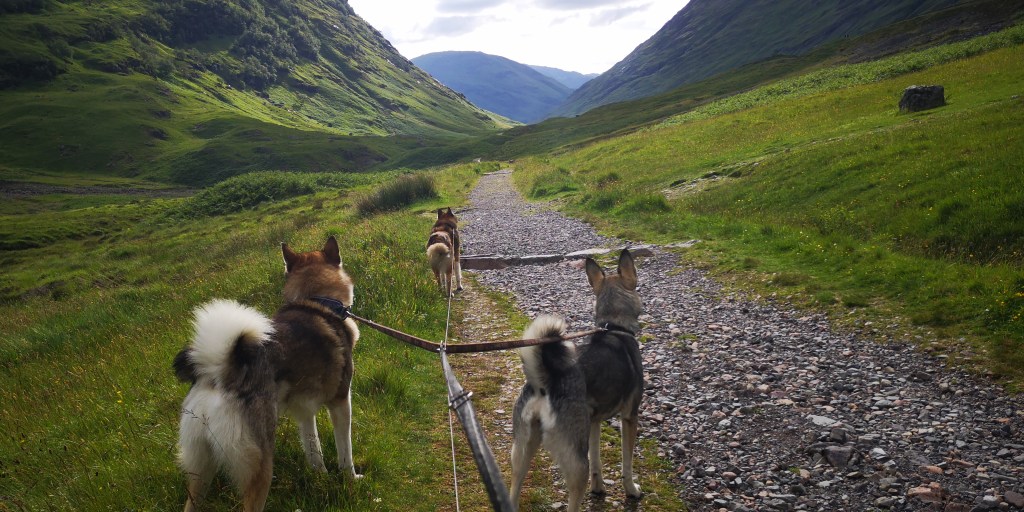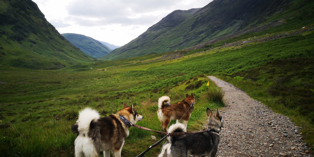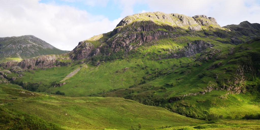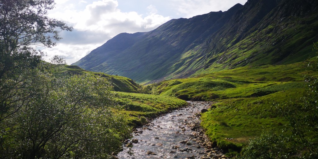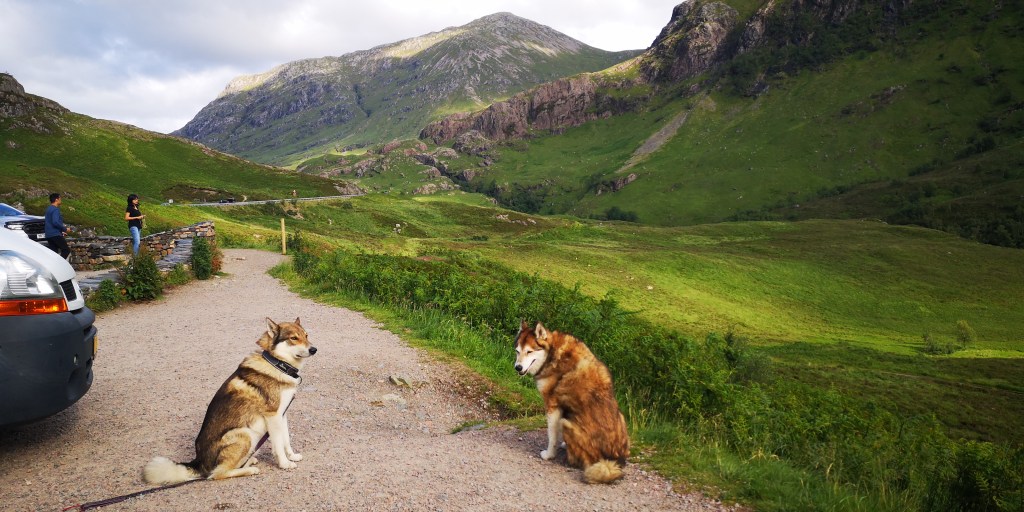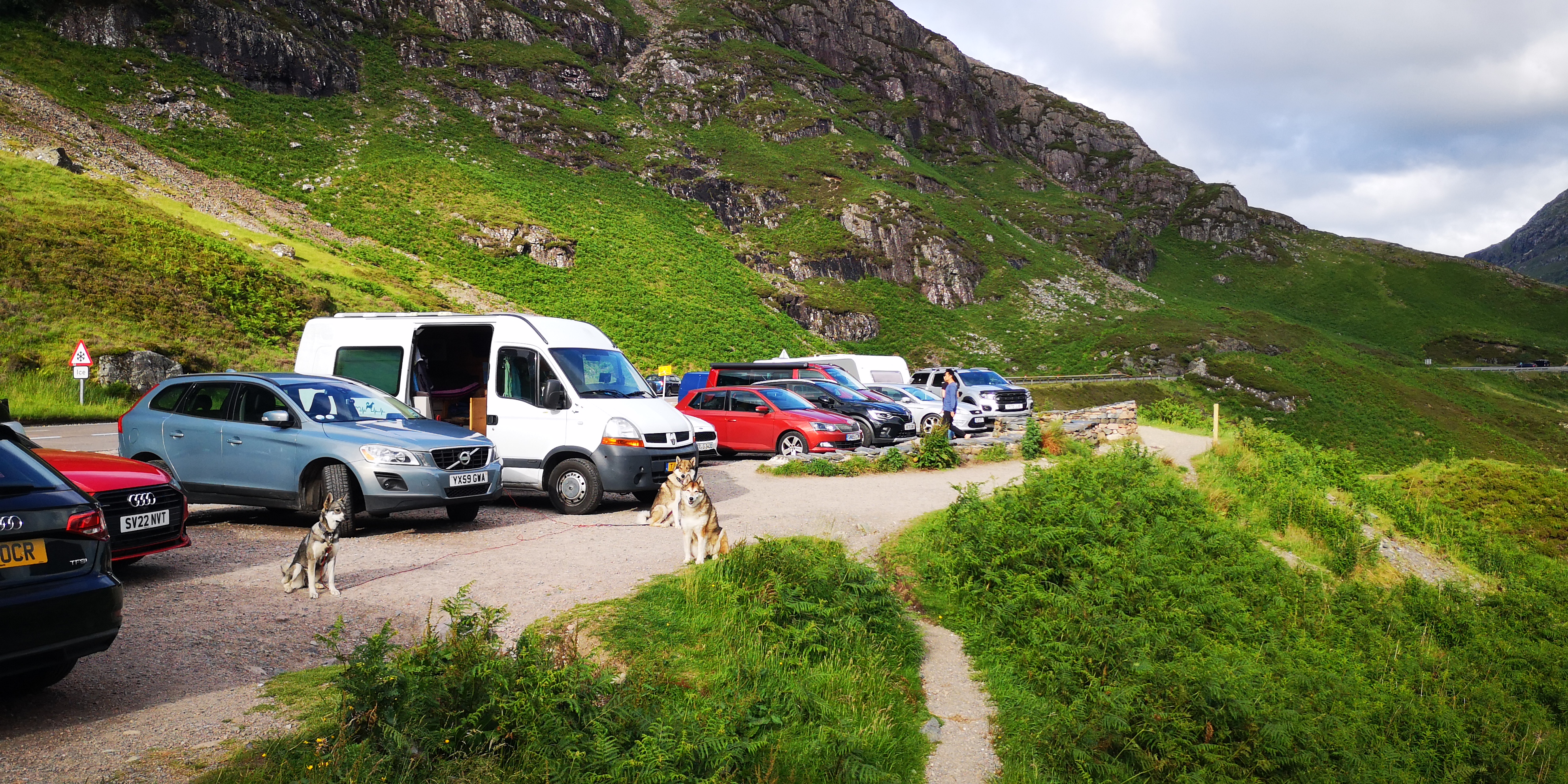 Halverwege de middag vertrekken we richting Glencoe. We rijden dwars door de bergen. Het landschap oogt ruig en verlaten. Zo nu en dan komen we een gehuchtje tegen, waar de pub vaak een centrale plaats inneemt. Soms staan er restanten van een kasteel of een kerkje met wat oude graven eromheen. ‘Welcome in the Highlands,’ staat er op een bord, en de bergen lijken nog grootser en imposanter te worden. Grijze rotspunten tornen ver boven ons uit. Vlak voor Glencoe parkeer ik op de Hidden Valley Car Park. Het is al tegen zessen, en ik had het wat leger verwacht, maar het staat bijna helemaal vol met auto’s en campers. De plek is dan ook wel erg indrukwekkend. De drie bergen ertegenover staan bekend als de Three Sisters. Hun toppen zijn vrijwel gelijk en bestaan uit gelaagde rotswanden en groene geplooide lijnen die naar beneden lopen. Vanaf de parkeerplaats lopen diverse wandelroutes. Samen met de honden loop ik een stukje naar beneden de vallei in. Er stroomt een rivier, de Coe, die nauwelijks te zien is vanwege de steile wanden die het omringen, en dat eigenlijk het hart van een oude vukcaan is. Het voelt als een magisch landschap rechtstreeks uit een middeleeuws verhalenboek. Achter de Three Sisters, ook wel bekend als Bidean Nam Bian Mountain, loopt een klein weggetje waar een scène uit de James Bond film Skyfall is opgenomen. Maar die rijscène doe ik maar even niet na met de bus.