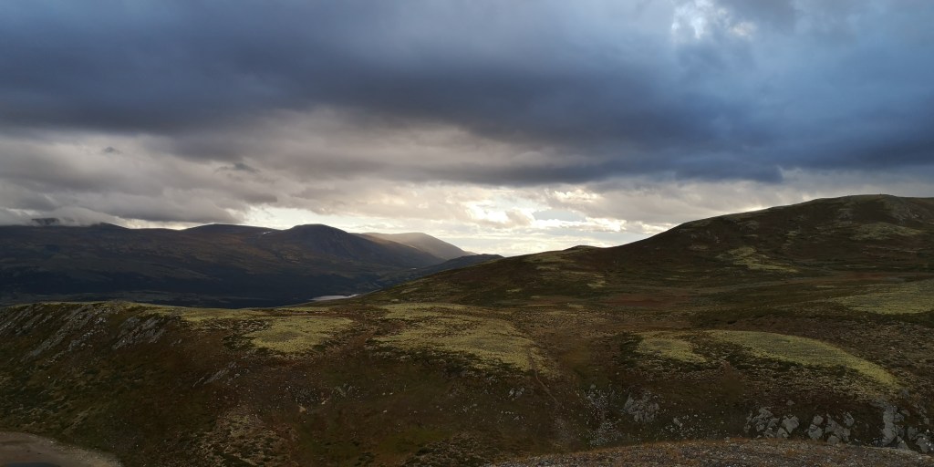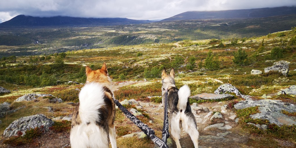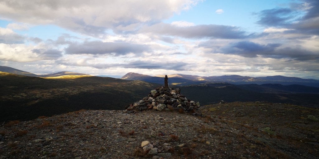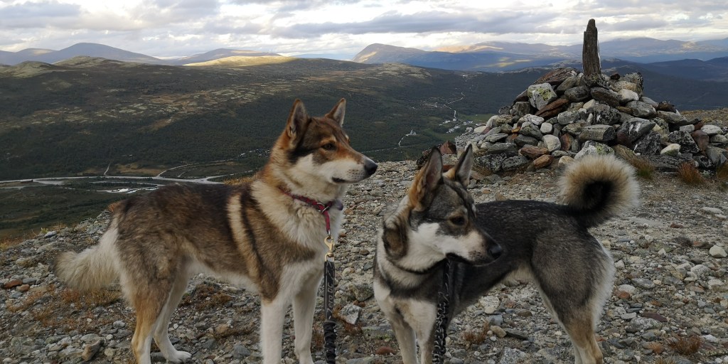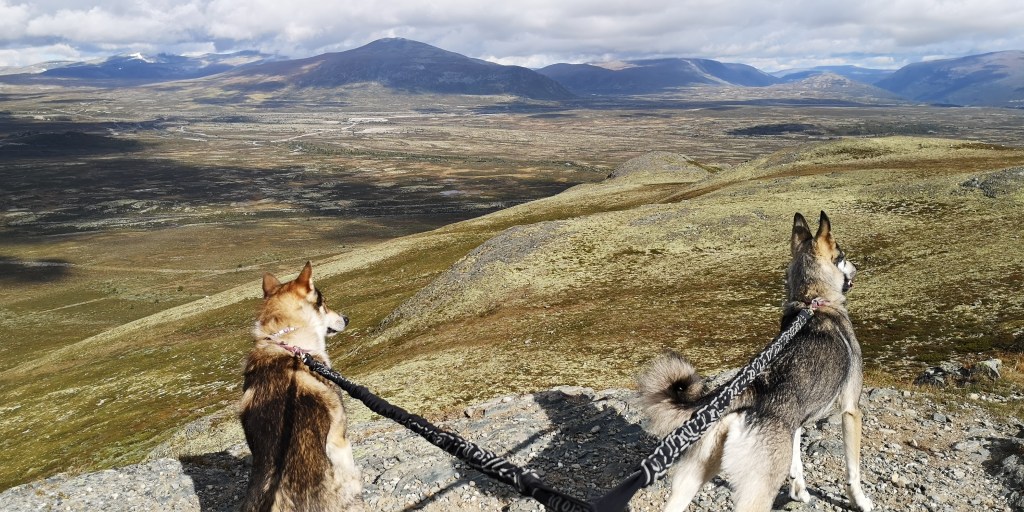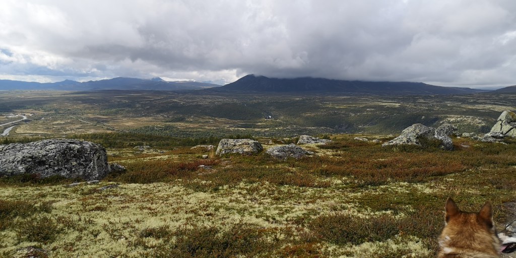 Er staan allemaal jagers met geweren wanneer ik het parkeerterrein van Utsiktspunkt Snohetta oprijd. Het terrein is omgeven door bergen. Ik parkeer in een hoek, zodat de honden aan de lange lijn in het gras kunnen liggen. Zij krijgen hun ontbijt, terwijl ik een grote beker warme chocolademelk drink, zittend op een steen in de zon. De jagers spreiden zich uit over het terrein, en verdwijnen al snel in de bergen. Ik ben benieuwd waar ze op gaan jagen.