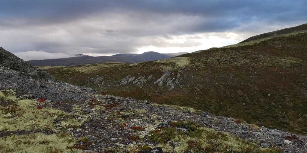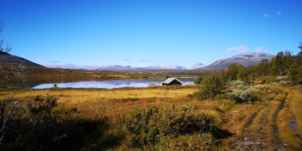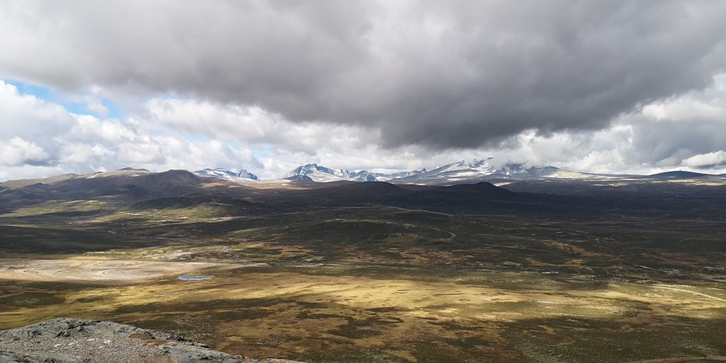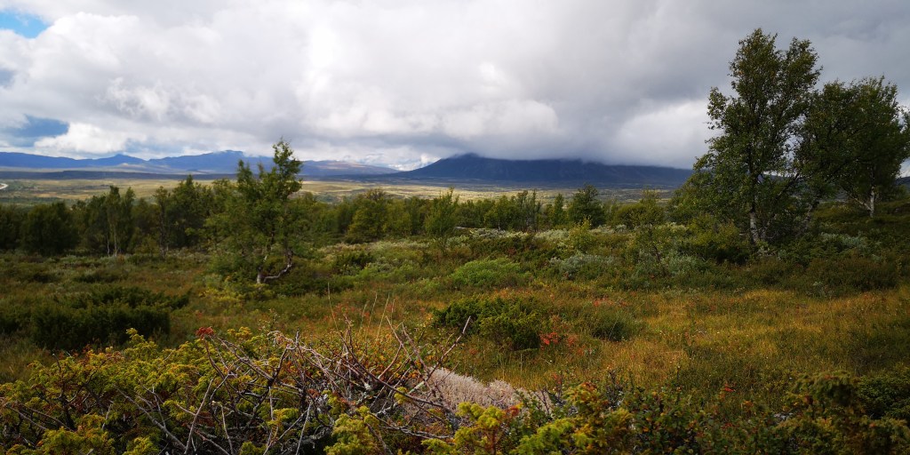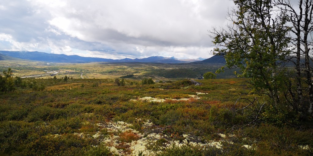 Een paar uur later lopen we over een smal pad bovenop een uitgestrekt bergplateau. Aan weerskanten van het pad groeit lage struikheide en grote dotten lichtgroen korstmos. Hier en daar staan wat kleine berken met dunne gekromde stammetjes. In de verte zijn de besneeuwde bergtoppen van Dovrefjell Sunndalsfjella Nasjonalpark te zien. Het natuurgebied wordt vaak liefkozend het dak van Noorwegen genoemd en is de beste plek om muskusossen in het wild te zien. Een bordje aan het begin van de route waarschuwt ervoor om de ossen uit de weg te gaan. Mochten ze je toch aanvallen, dan is het je eigen schuld, staat erbij. Fijn volk, die Noren.