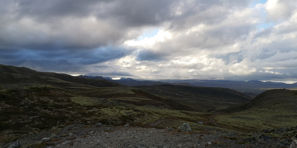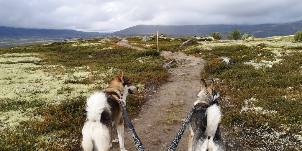 Bij Kongsvold steken we de E6 over en klimmen hier weer omhoog. Daarna lopen we weer een prachtig stuk over een bergplateau met uitzicht op de bergketen van Dovrefjell. Af en toe kom ik een andere wandelaar tegen, en ga dan zodanig met de honden staan zodat de ander makkelijk kan passeren. Ik probeer oogcontact te maken, maar er kan nauwelijks een groet of een dankjewel van af. Wat een verschil met de mensen in Zweden of in England, waar men vrijwel altijd groette of een praatje maakte. ‘Ik hoop dat ik nog een aardige Noor tegenkom,’ verzucht ik tegen de honden.