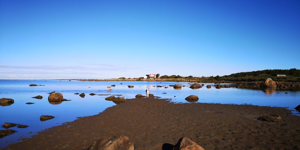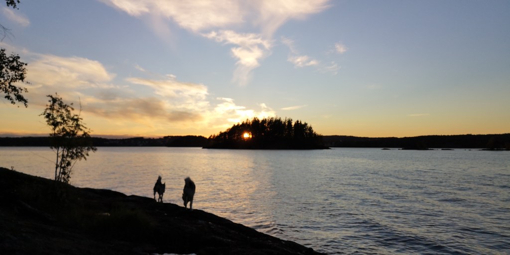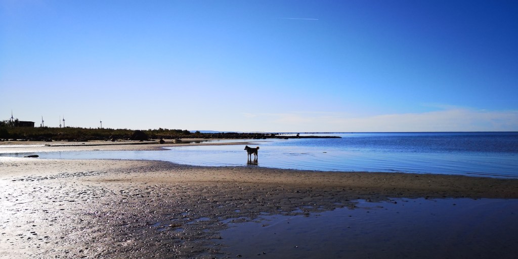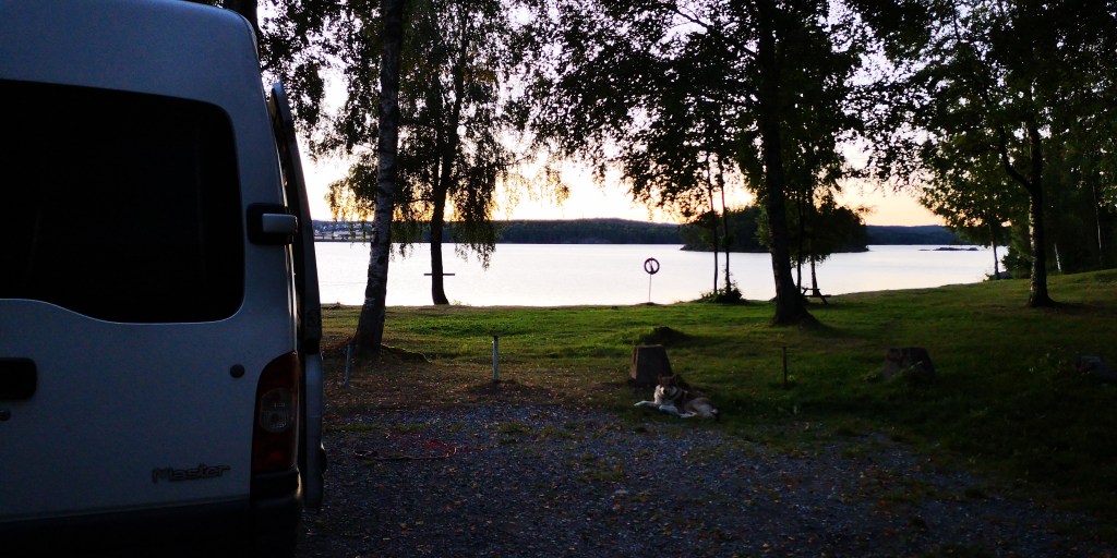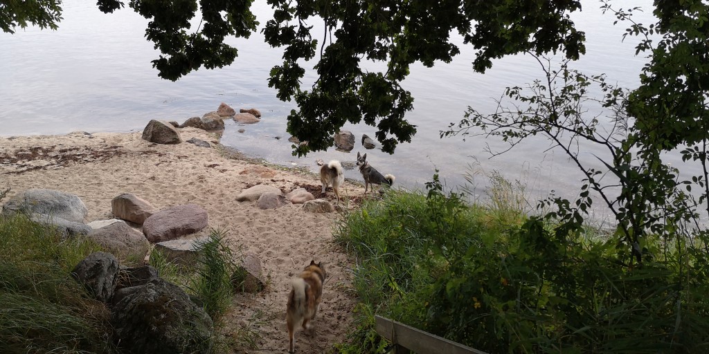 Na deze onrustige nacht vertrekken we al vroeg in de ochtend, en rijden weer uren over de snelweg. Halverwege de middag vind ik een plekje aan de kust bij Eneskogstorp in Zweden. Ik parkeer de bus onder een boompje, en we stappen uit. Er staan meerdere campers, ieder met een eigen stukje gras. Er is voldoende ruimte voor de honden om te rennen, en al snel spelen Mika en Moran een stukje verderop in het water. De zon schijnt, maar er waait een verkoelend briesje over het water. Marte ligt uitgebreid te rollen in het lange gras. De plek voelt goed, en ik eet de overgebleven aardappelsalade met meer smaak dan de dag ervoor.