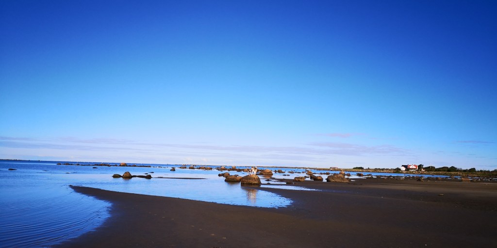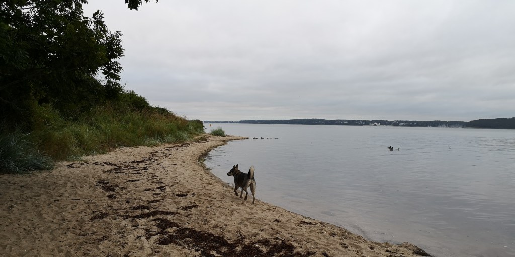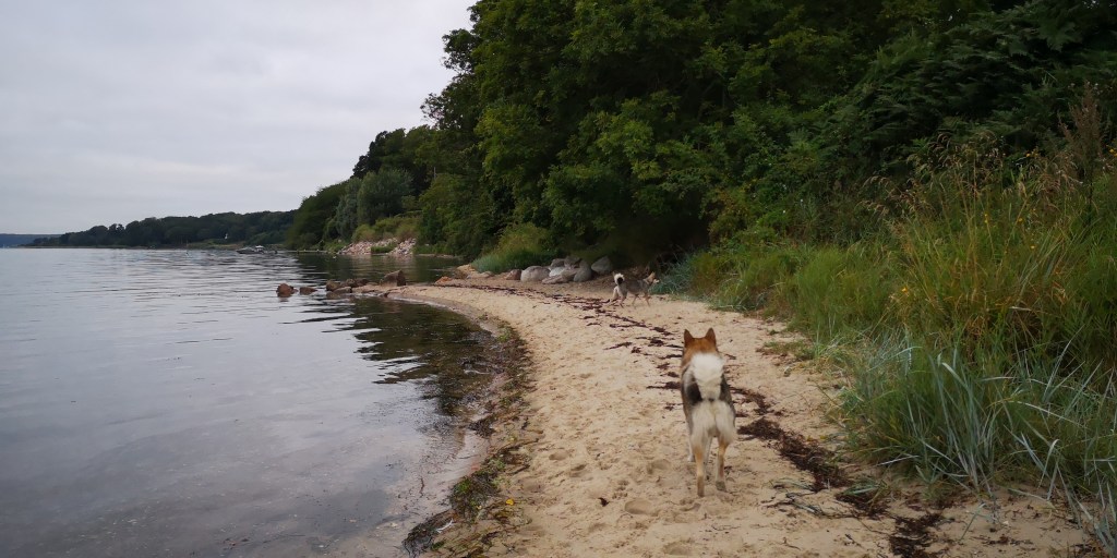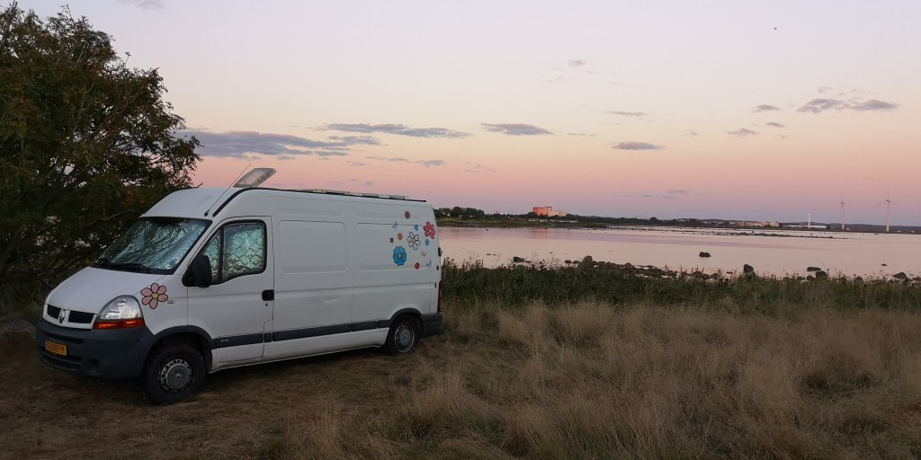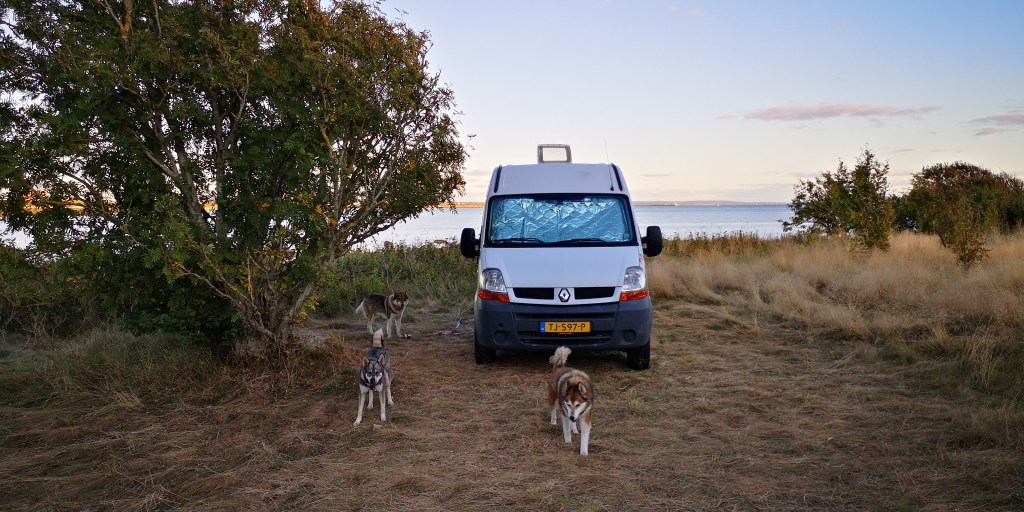 Binnen een uurtje rijden we de grens naar Duitsland over, en vijf uur later passeren we de grens bij Denemarken. Het is inmiddels al tegen acht uur ’s avonds, en het begint te schemeren. Ik draai de Fjordvejen op, die langs Flensborg Fjord loopt. Er liggen verschillende parkeerplaatsen langs het water, maar overal staan bordjes met ‘no camping’ erop. Wat bedoelen ze daarmee? Mag er enkel niet gekampeerd worden in een tentje of mag er ook niet overnacht worden in een camper? Er staan huizen in de buurt, dus voor de zekerheid rijd ik maar door. Volgens Park4Night ligt er net voorbij Kollund Osterkov een parkeerplaatsje waar je mag overnachten. Tot mijn opluchting klopt deze informatie. Ik zie geen bordje staan met dat kamperen verboden is. Er staat één klein ander busje. Een vrouw zit met een bord op schoot in de deuropening te eten. We groeten elkaar even kort, en daarna loop ik snel door met de honden naar de oevers van het fjord. Daar laat ik ze rennen over het smalle strookje zand en stenen. Samen met Marte loop ik over de zachte dode planten, die door de golfbeweging een lange lijn over het zand trekken, terwijl Mika en Moran voor ons uit rennen. In de verte zie ik Moran wat zeevogels opjagen, die haastig omhoog vliegen. Zij is alweer helemaal in haar element. Het nomadenleven zit nu al in haar bloed. Terug bij de bus eet ik van de aardappelsalade, die ik nog voor vertrek uit Nederland had klaargemaakt. Daarna gaan we snel slapen.