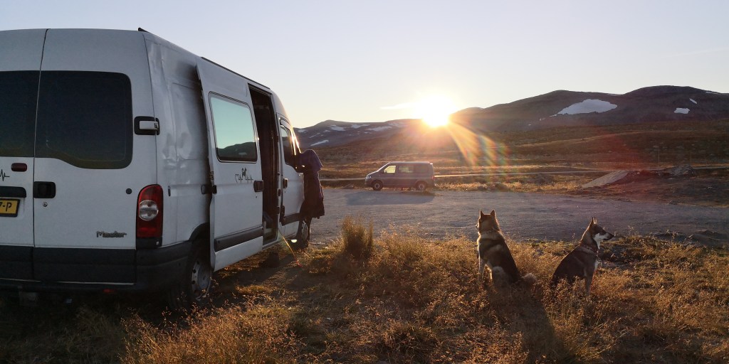 We rijden naar een parkeerplaatsje bij Valdresflya, dat een gebied rondom de RV 51 beslaat op een hoogte van 1.389 meter. Er staan twee caravans en een camper, dus het is er heerlijk rustig. We stappen uit en kijken om ons heen, een 360 graden panorama aan bergen, ruig en kaal. ‘Eerst gaan we wat eten, en daarna wandelen,’ beloof ik de honden. We zaten vanochtend om negen uur alweer op de weg, en het is nu halverwege de middag. Ik kook het gebruikelijke potje spaghetti met vis en groente uit blik en veel gesmolten kaas, en verdeel dit over mijn bord en de bakken van de honden. Mika en Moran eten er gretig van, maar Marte ruikt er even aan en keert zich dan met haar rug naar haar etensbak toe. Ik maak me zorgen. Vanochtend weigerde ze ook al haar ontbijt, en de dag ervoor at ze met tegenzin. Ze is inmiddels veertien en een half jaar oud. Zou ze nu toch te oud worden voor het reizend nomadenbestaan? Het warme weer van de afgelopen weken vermoeide haar, maar hopelijk knapt ze weer op, nu we in de koele berglucht staan.