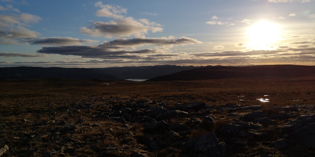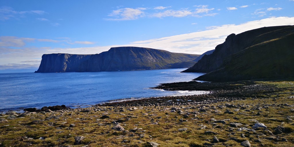 We rijden door Finnmark, de meest noordelijke regio van Noorwegen, dat ook wel bekend staat als Noors Lapland. Het werd van oorsprong bewoond door de Sami, het nomadische volk dat ook in Zweeds en Fins Lapland woont. Finmark kent lange fjorden aan de kust, terwijl het binnenland gedomineerd wordt door grote hoogvlaktes. Nadat we getankt hebben in Alta verruilen we de kust voor een stuk over een hoogvlakte. De bladeren van de berken zijn, met de naderende herfst, geel gekleurd. De lichtglooiende heuvels erachter, tekenen zich donkerpaars af tegen de lage ochtendzon. Watervallen lopen af in de Goahtemuorjohka, de rivier die parallel aan onze weg loopt. Opvallend veel van de berken zijn geknakt halverwege hun stammetje, en ik heb het vermoeden dat de winters hier zo zwaar zijn, dat velen van hen het niet overleven. Ik probeer me voor te stellen dat hier tijdens de wintermaanden alleen maar duisternis heerst. Wat een overlevingskracht moet de natuur en de dieren hebben, die dit wel overleven.